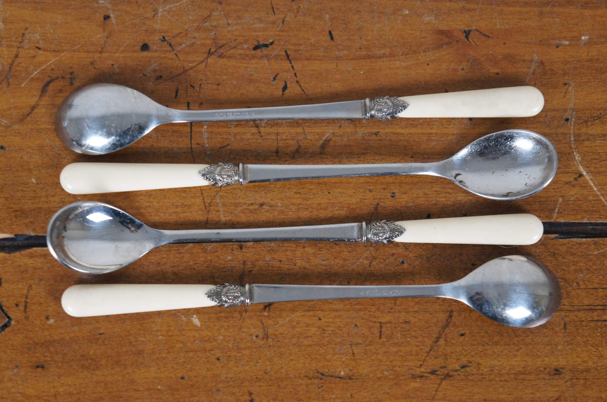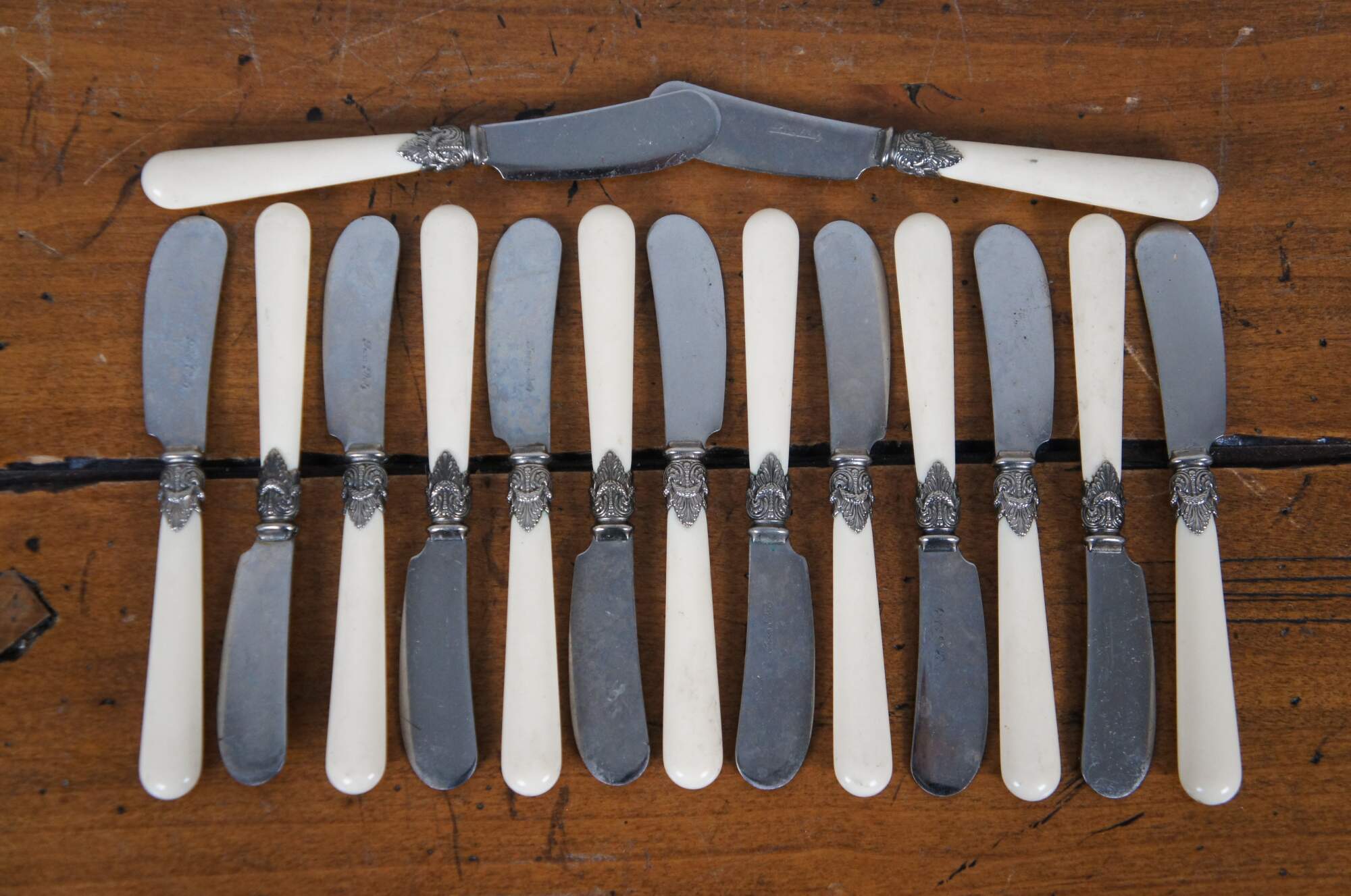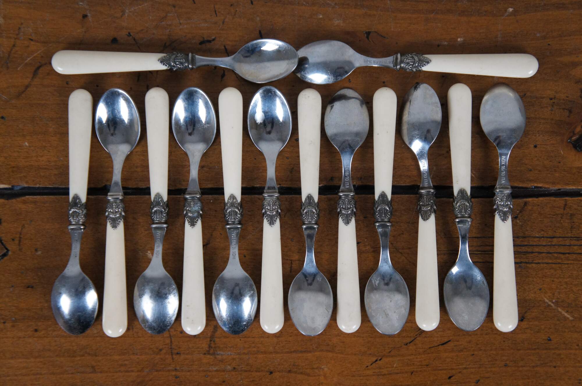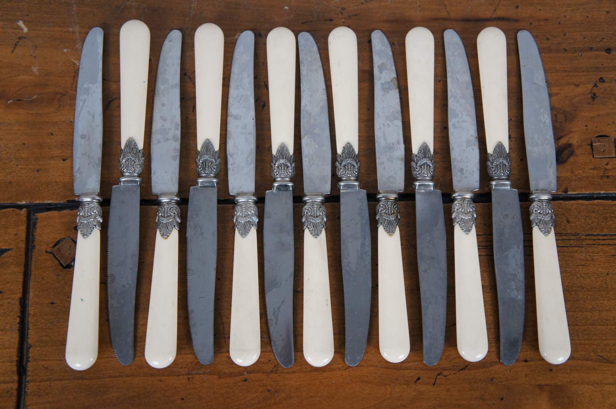 Mid to late 20th century 102 piece set of EME Napoleon style / pattern inox 18/10 (stainless steel) cutlery with faux ivory handles and foliate swag collars. Set includes: 3 types of cheese knife, pie server, 3 serving forks, cake knife, three serving spoons, 13 table knives, 13 dinner forks, 14 table spoons, 13 salad forks, 5 tea spoons, 14 coffee spoons, 15 spreaders, 4 iced tea spoons. Made in Italy.