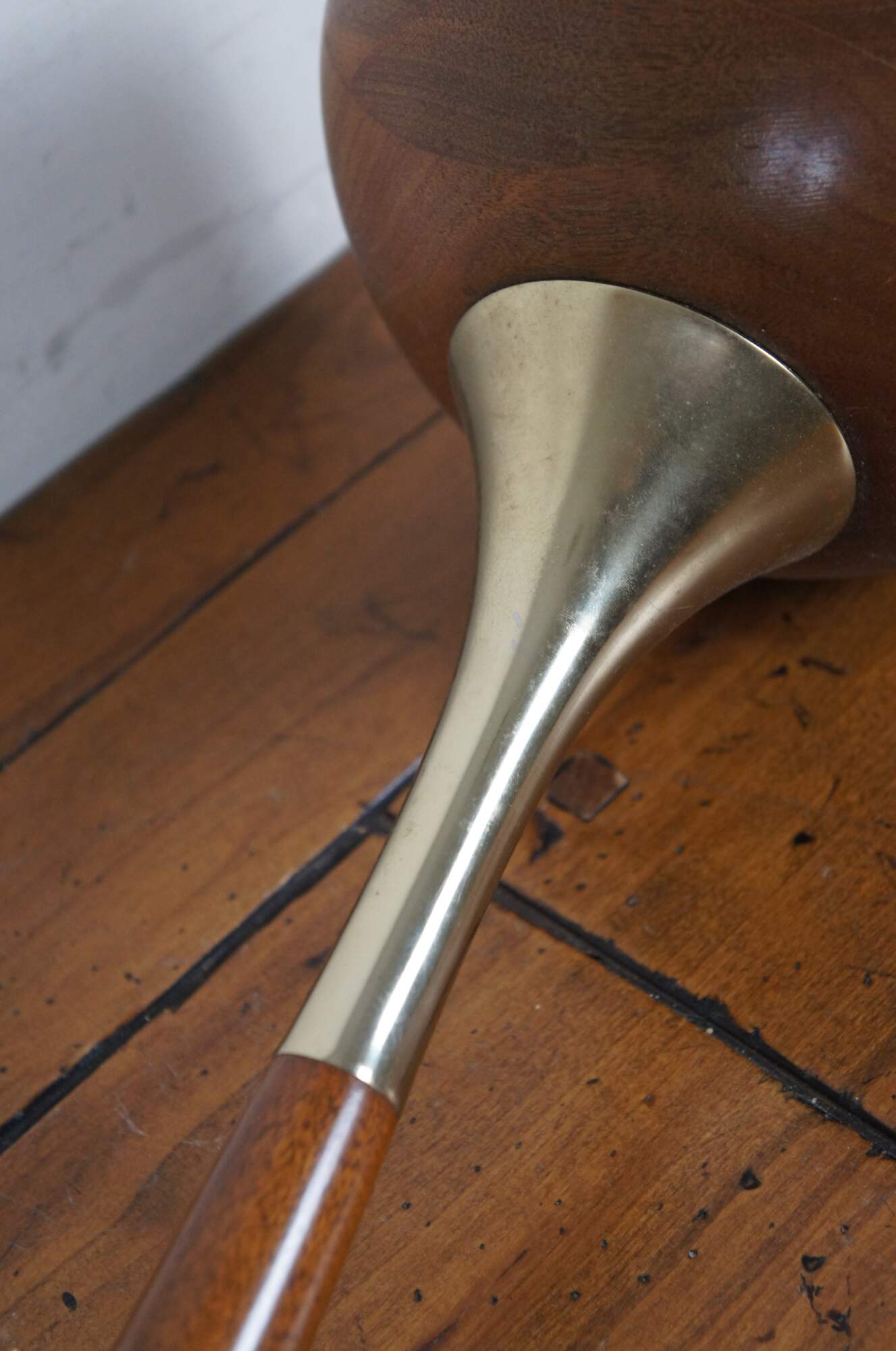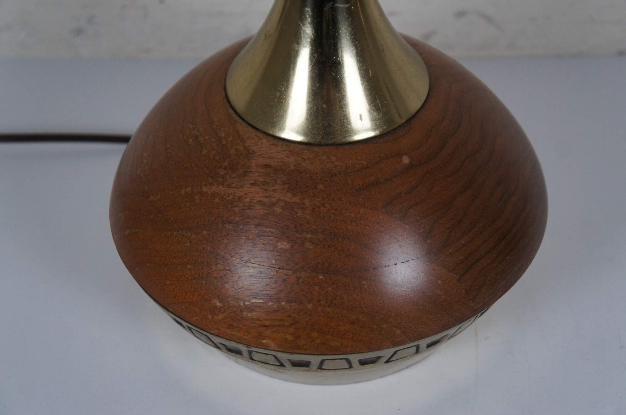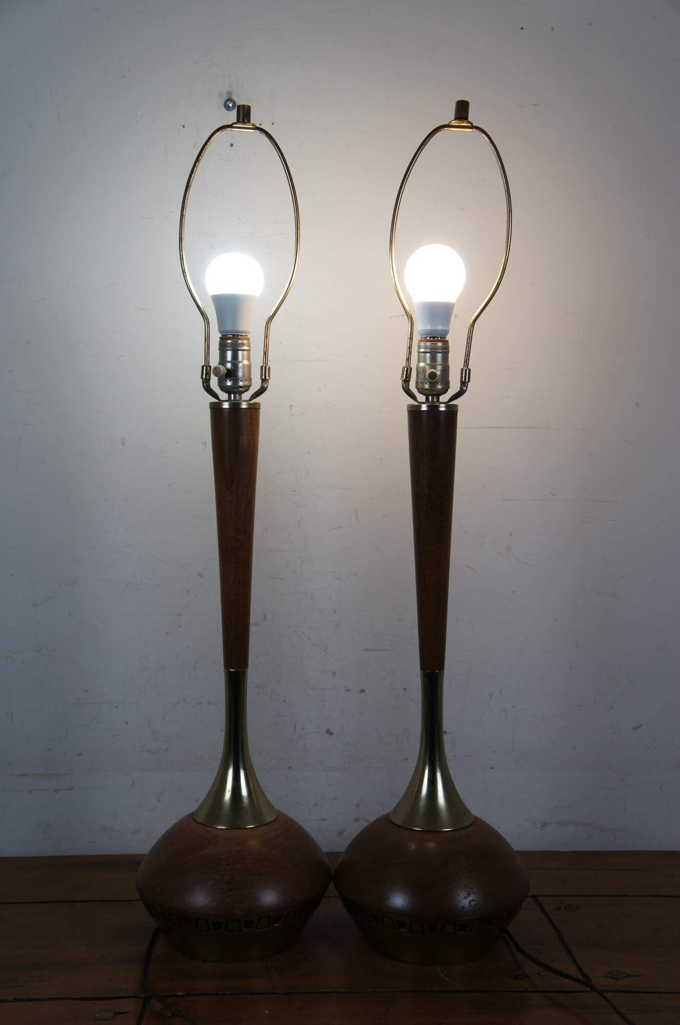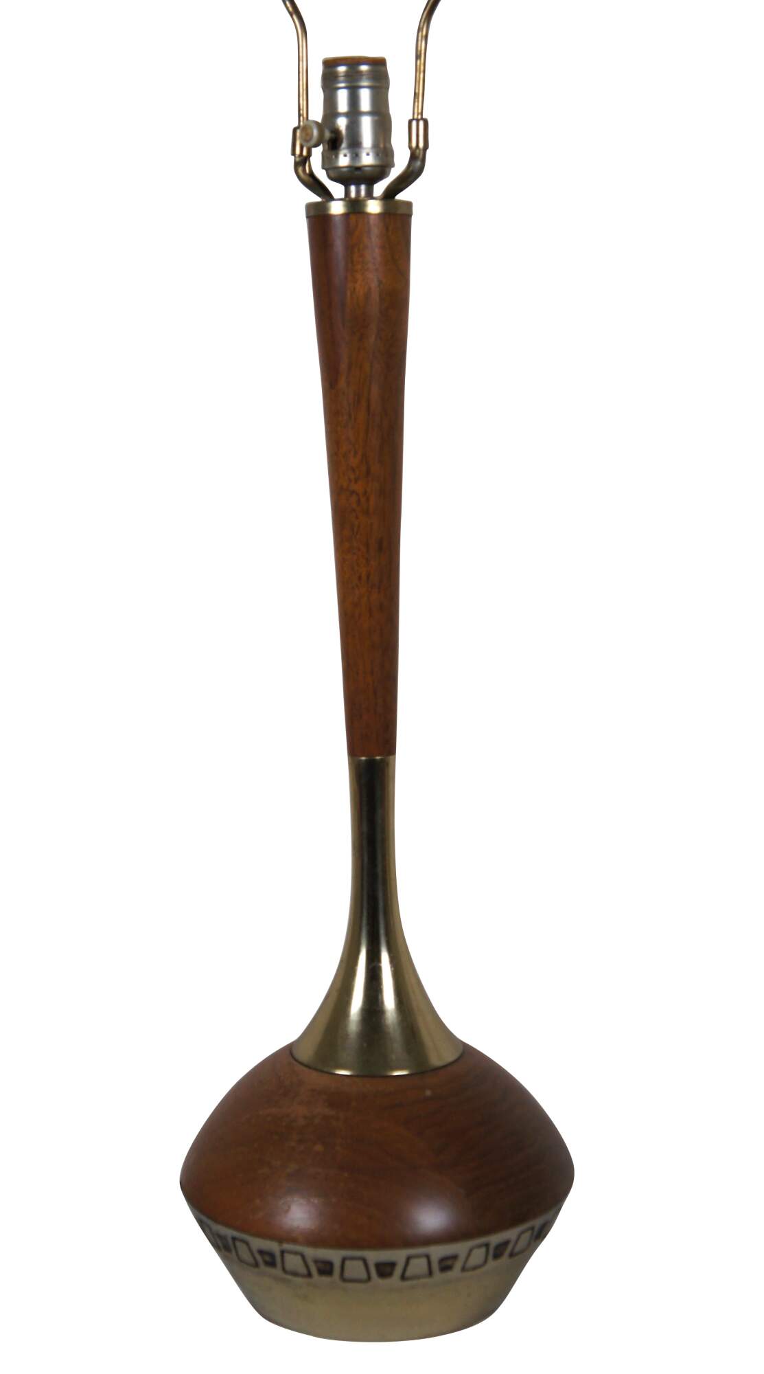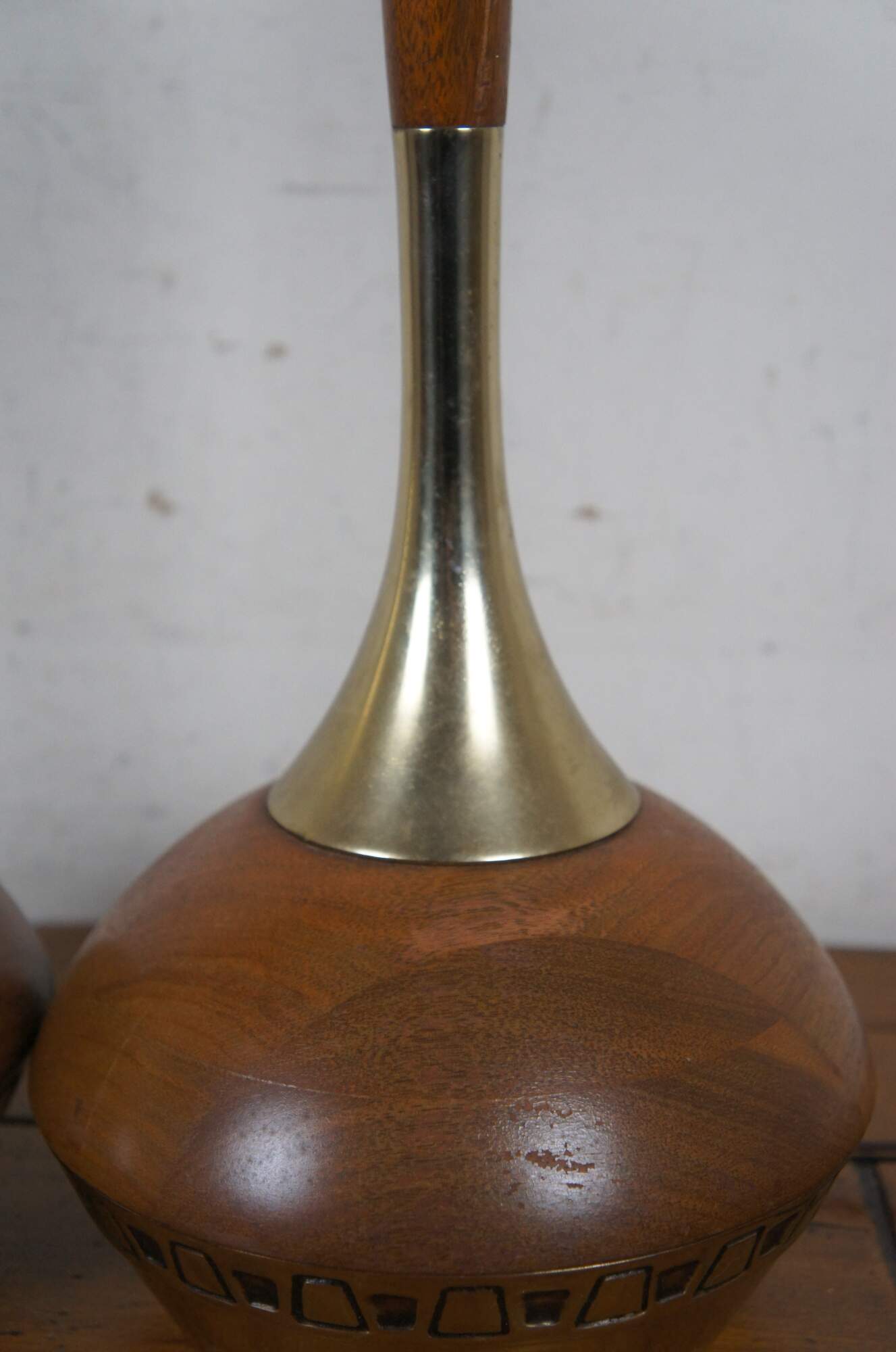 Circa 1960's pair of mid century Danish modern genie bottle style table lamps. Round half brass, half teak wood bases topped with a brass waist supporting a tapered cylindrical neck. Brass lower half of base sports a simple, primitive geometric design. Includes harp and cylindrical finial. Attributed to Tony Paul for the Laurel Lamp Company.