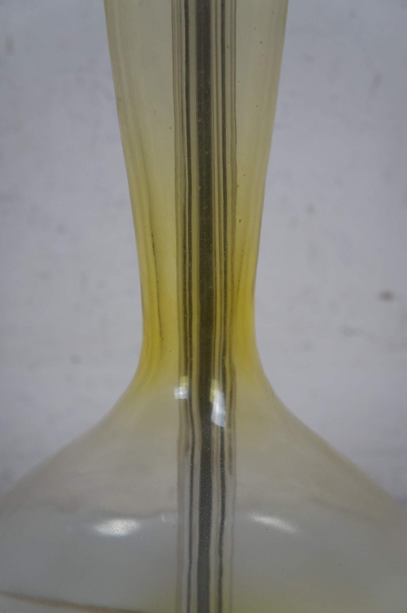 Mid 20th century Blenko glass genie bottle Jonquil table lamp in pale yellow with round walnut base. Style number 5815 (as seen in Blenko's 1958 catalog) designed by Wayne Husted. Attached, adjustable height harp and cap shaped finial - would originally have been paired with a matching glass finial. Stamp on felt base.