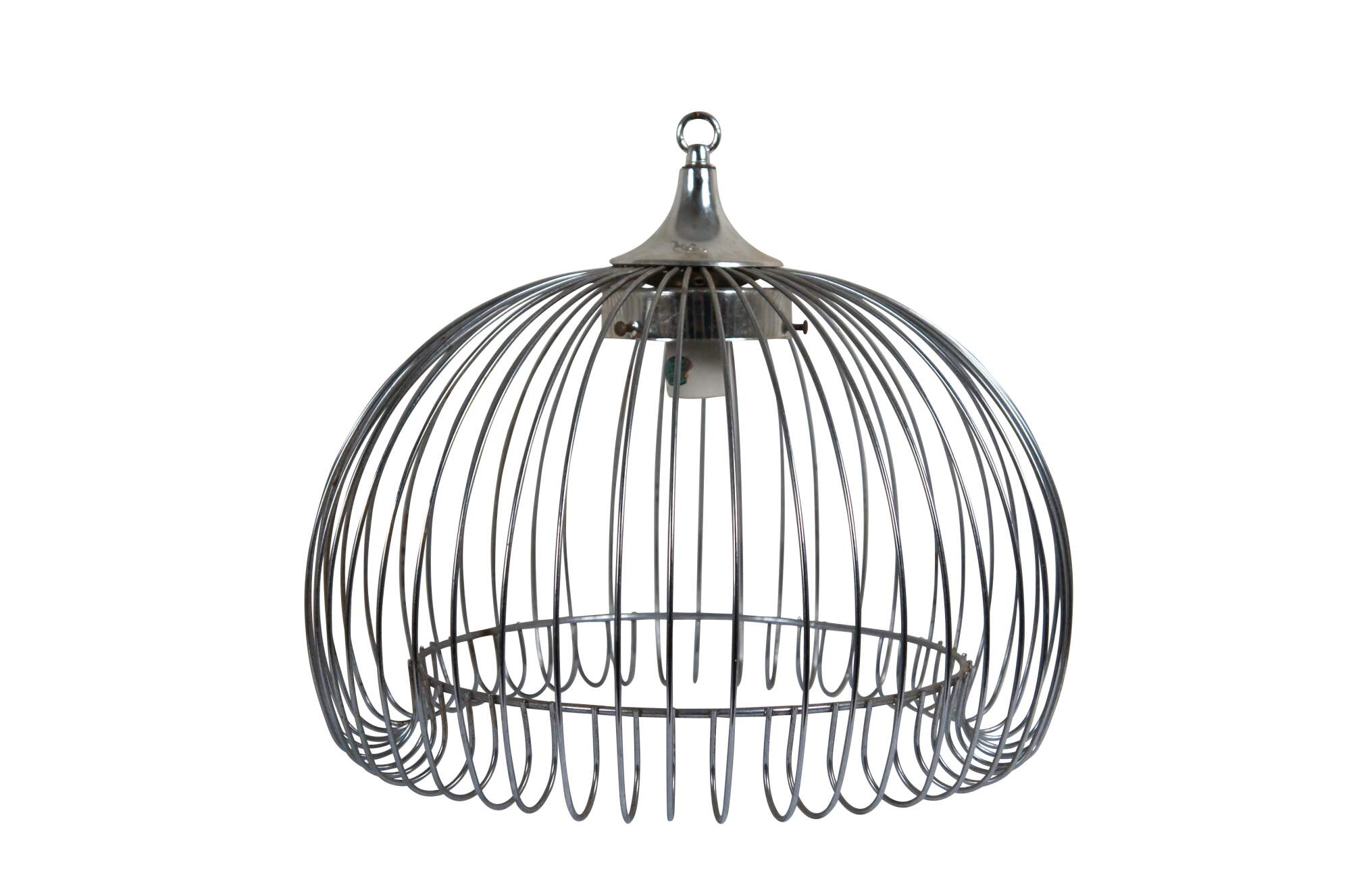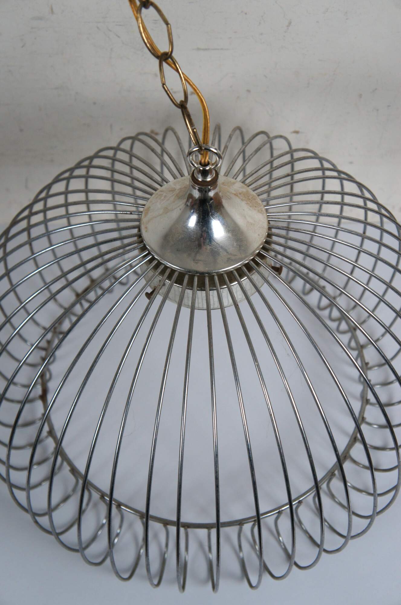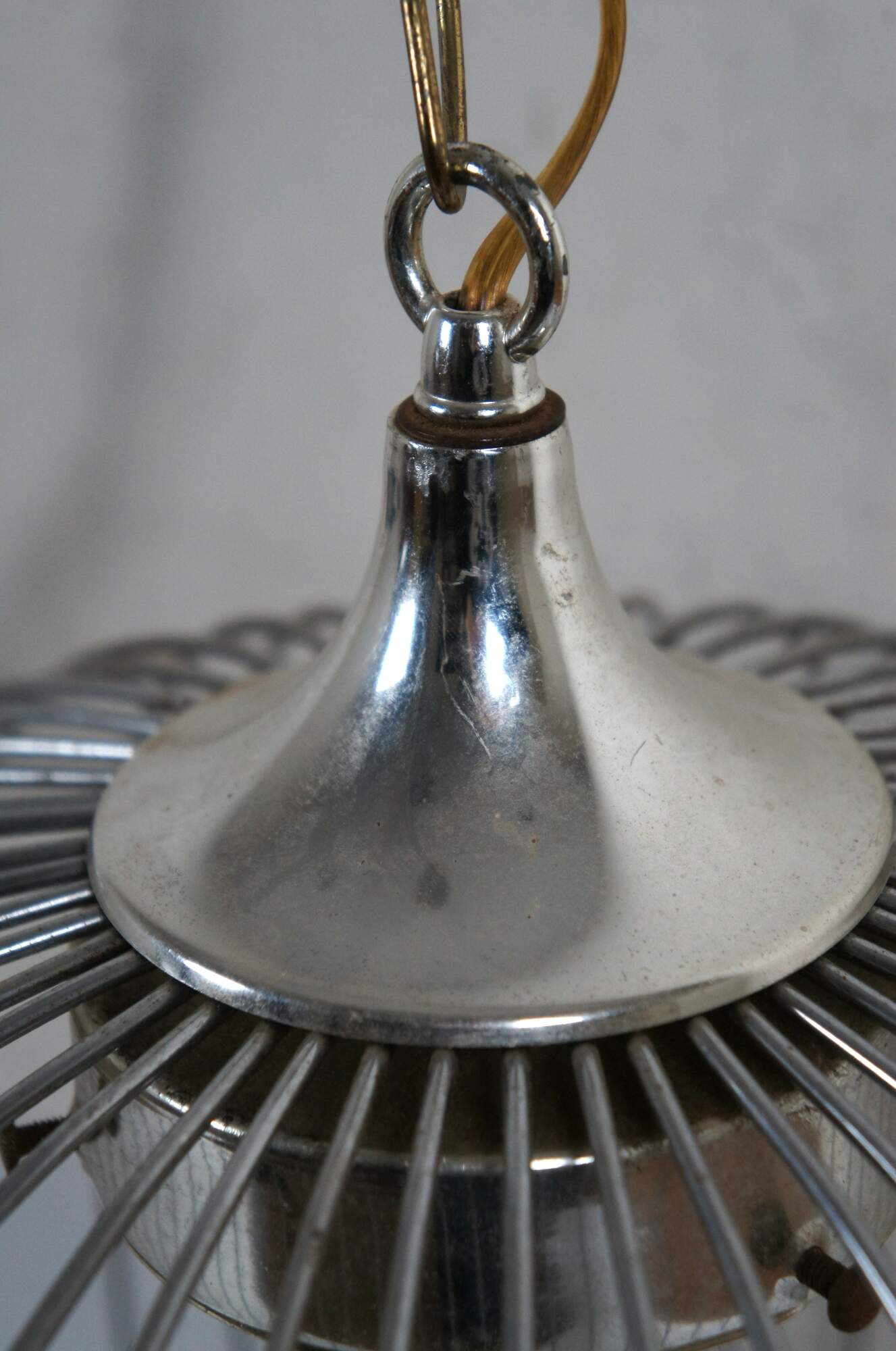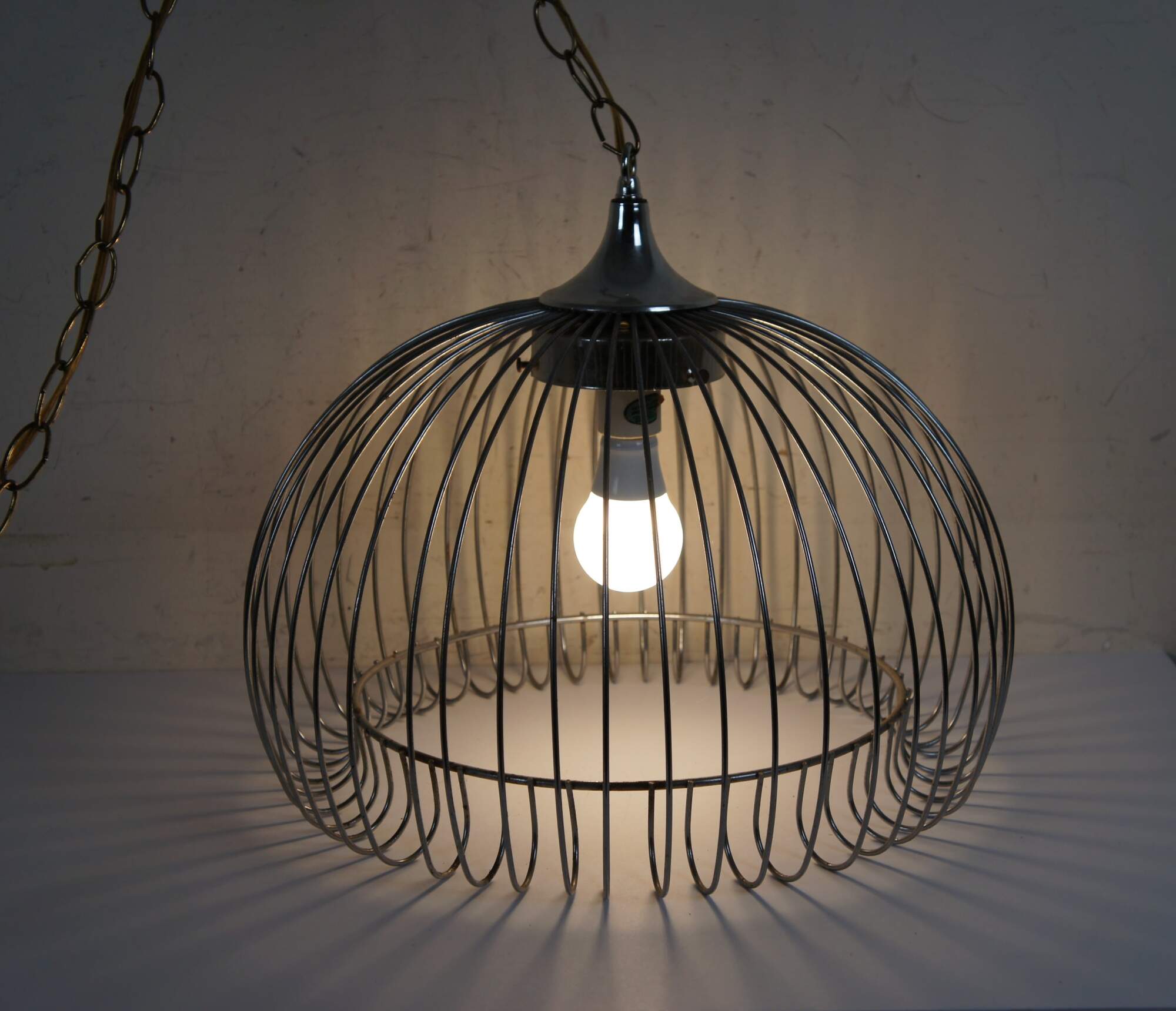 Mid 20th century chrome bird cage style swag / pendant light. Round cage form with curled in lower edge. Missing globe shade. Plug in. Gold tone chain.