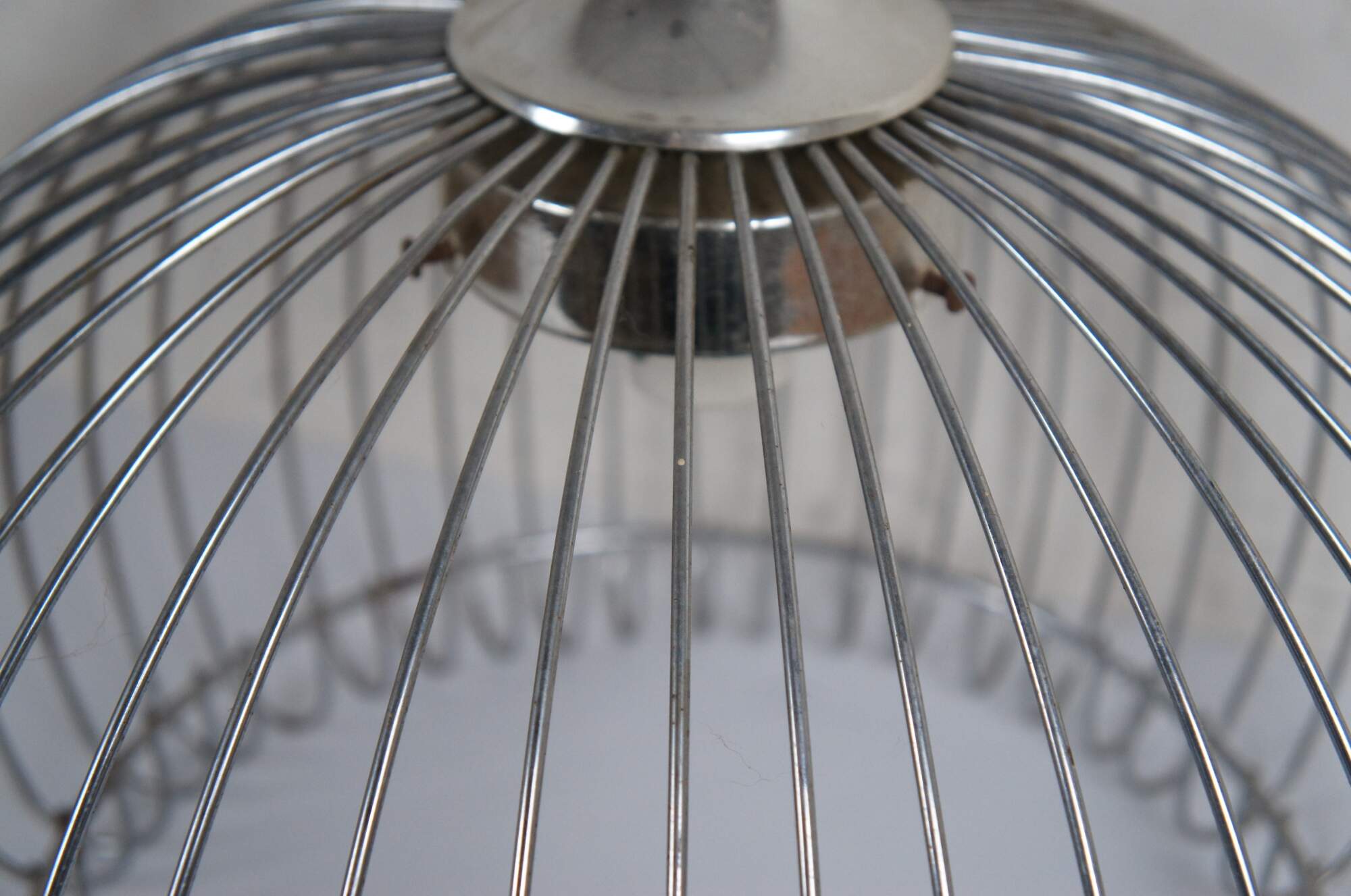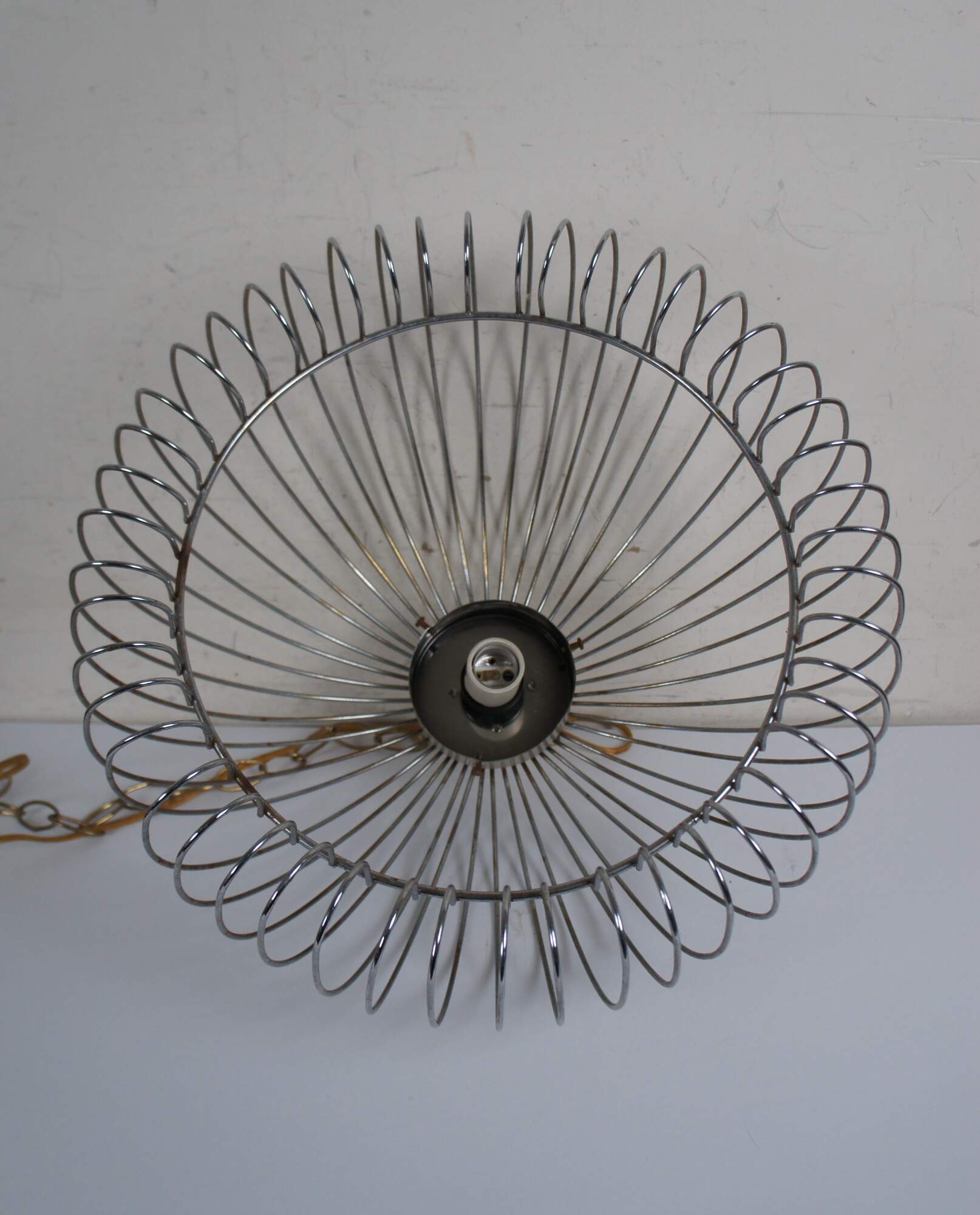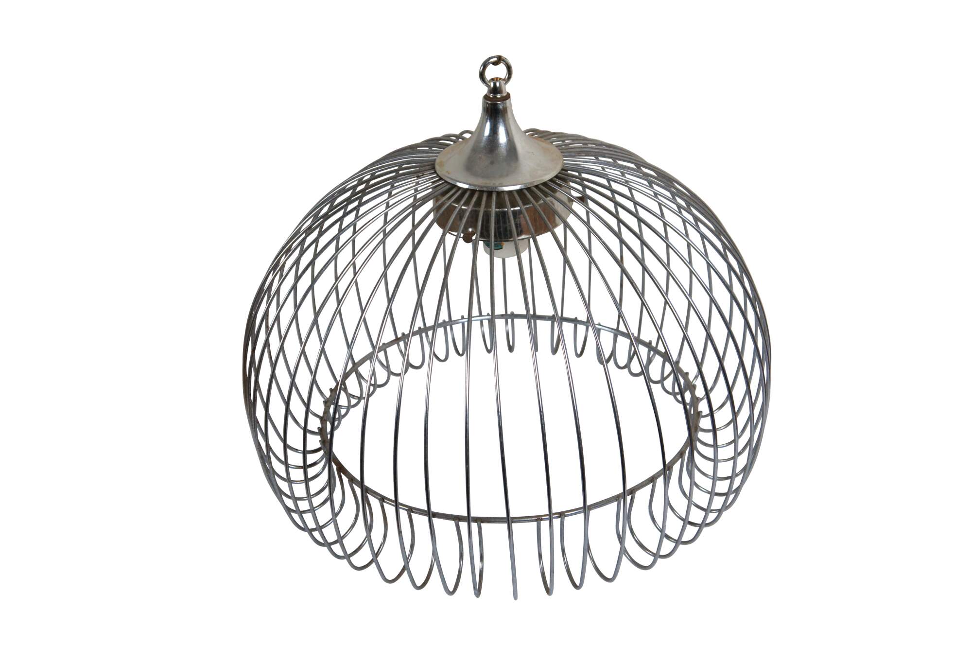 Mid 20th century chrome bird cage style swag / pendant light. Round cage form with curled in lower edge. Missing globe shade. Plug in. Gold tone chain.