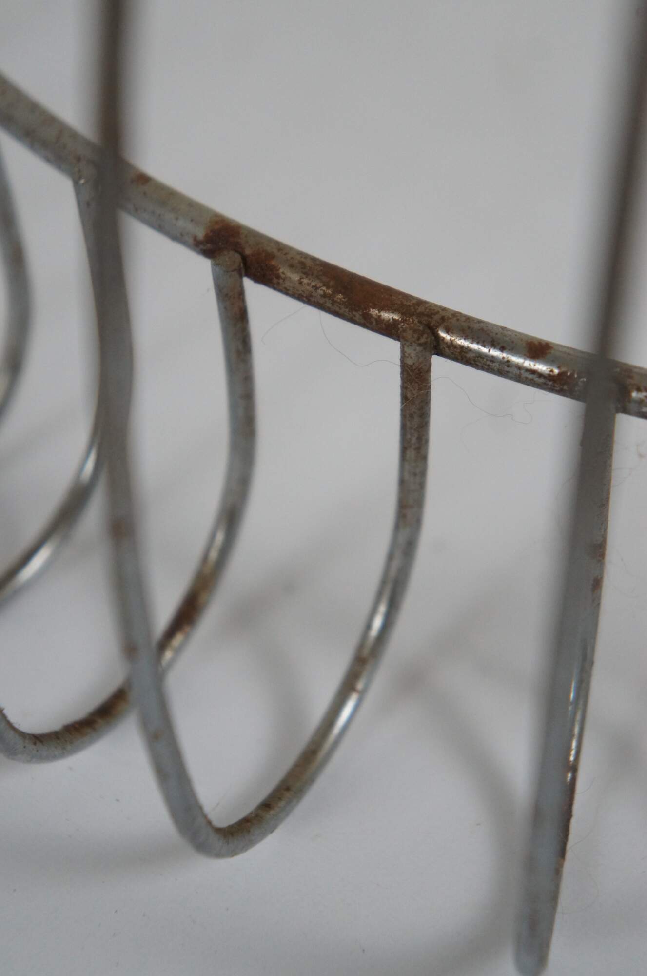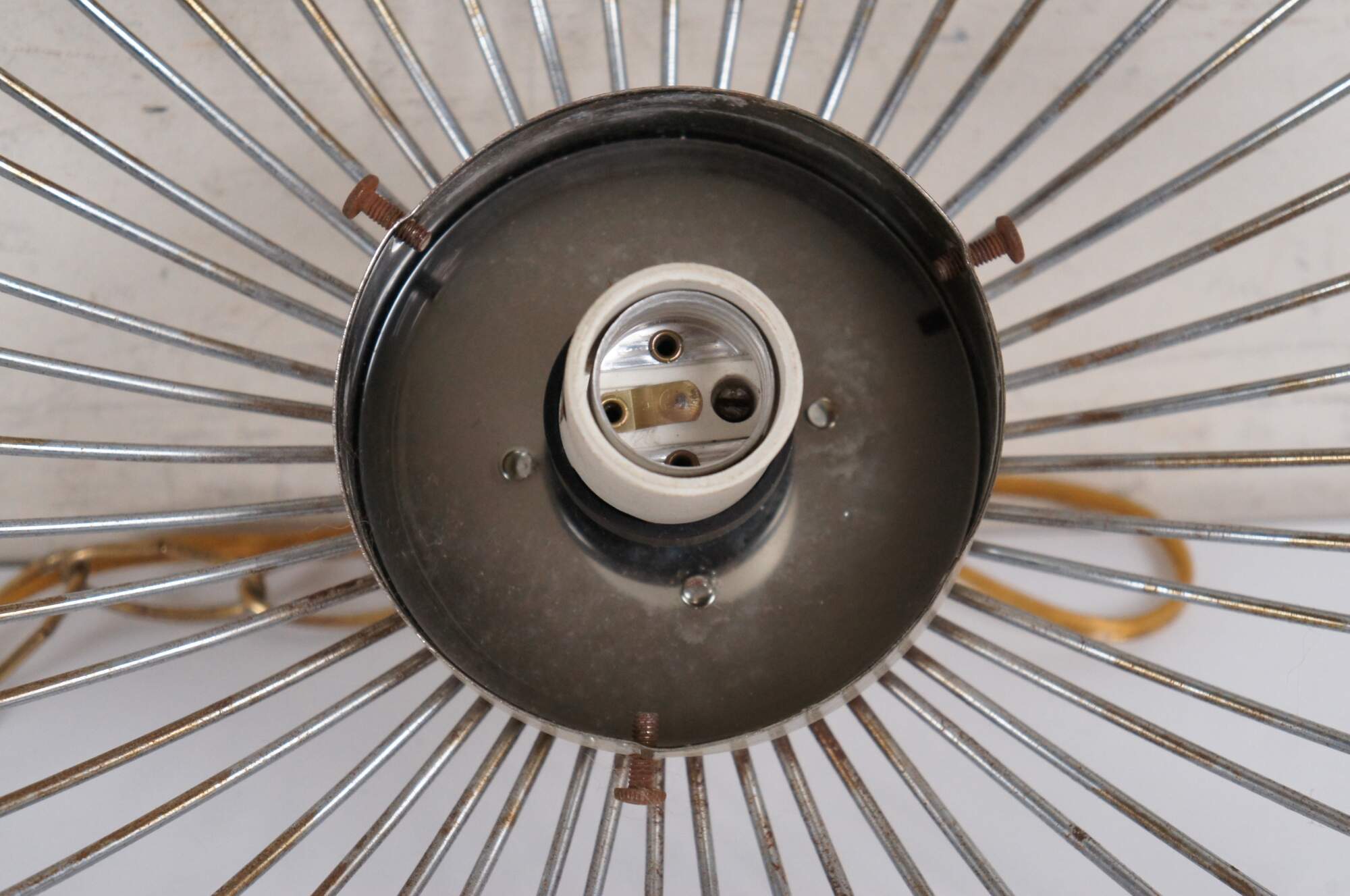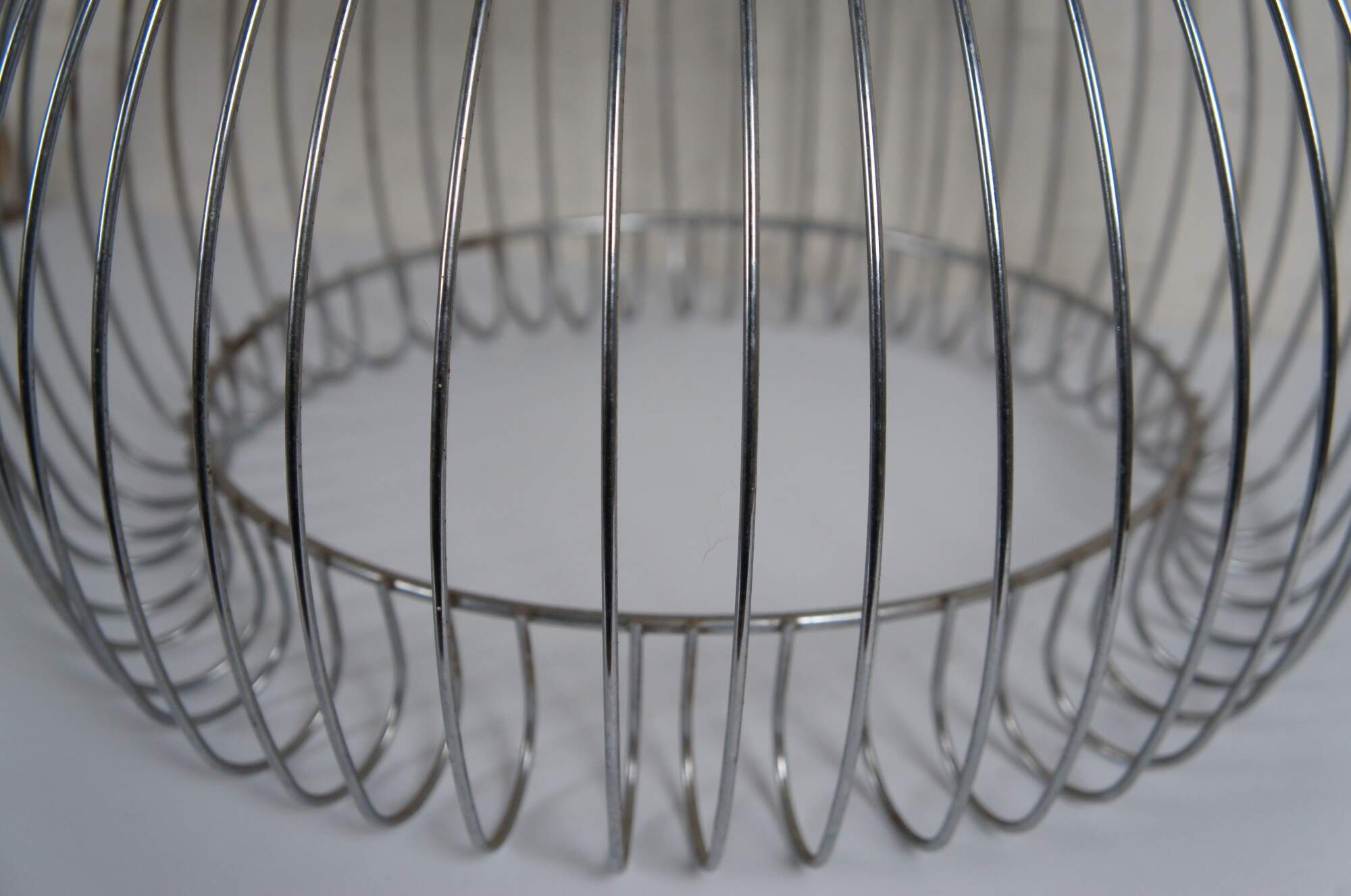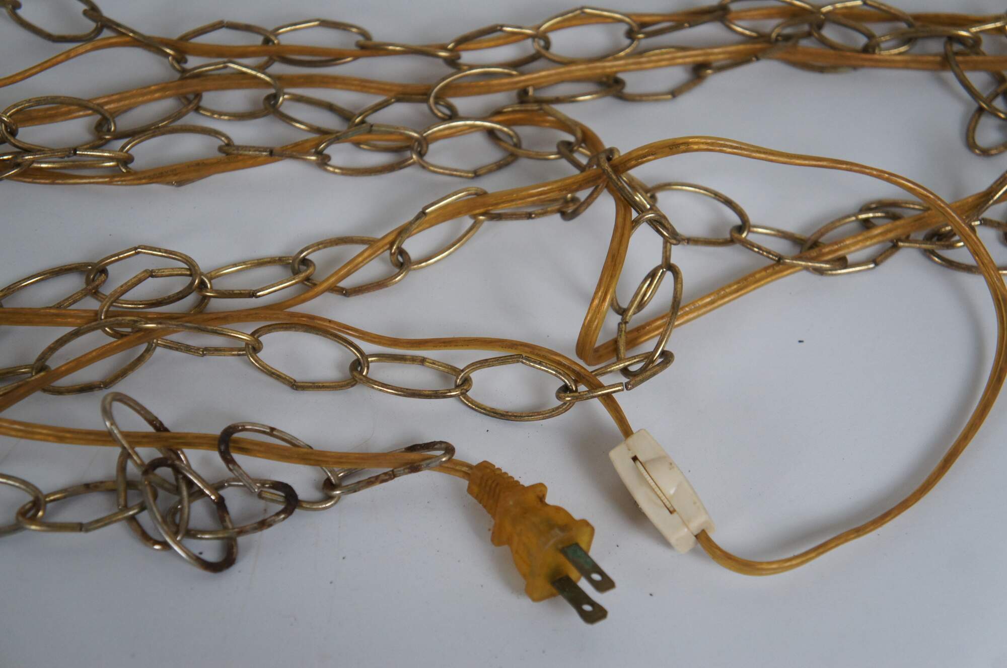 Mid 20th century chrome bird cage style swag / pendant light. Round cage form with curled in lower edge. Missing globe shade. Plug in. Gold tone chain.