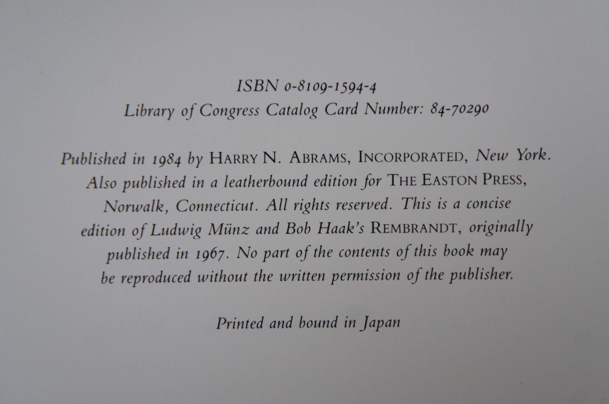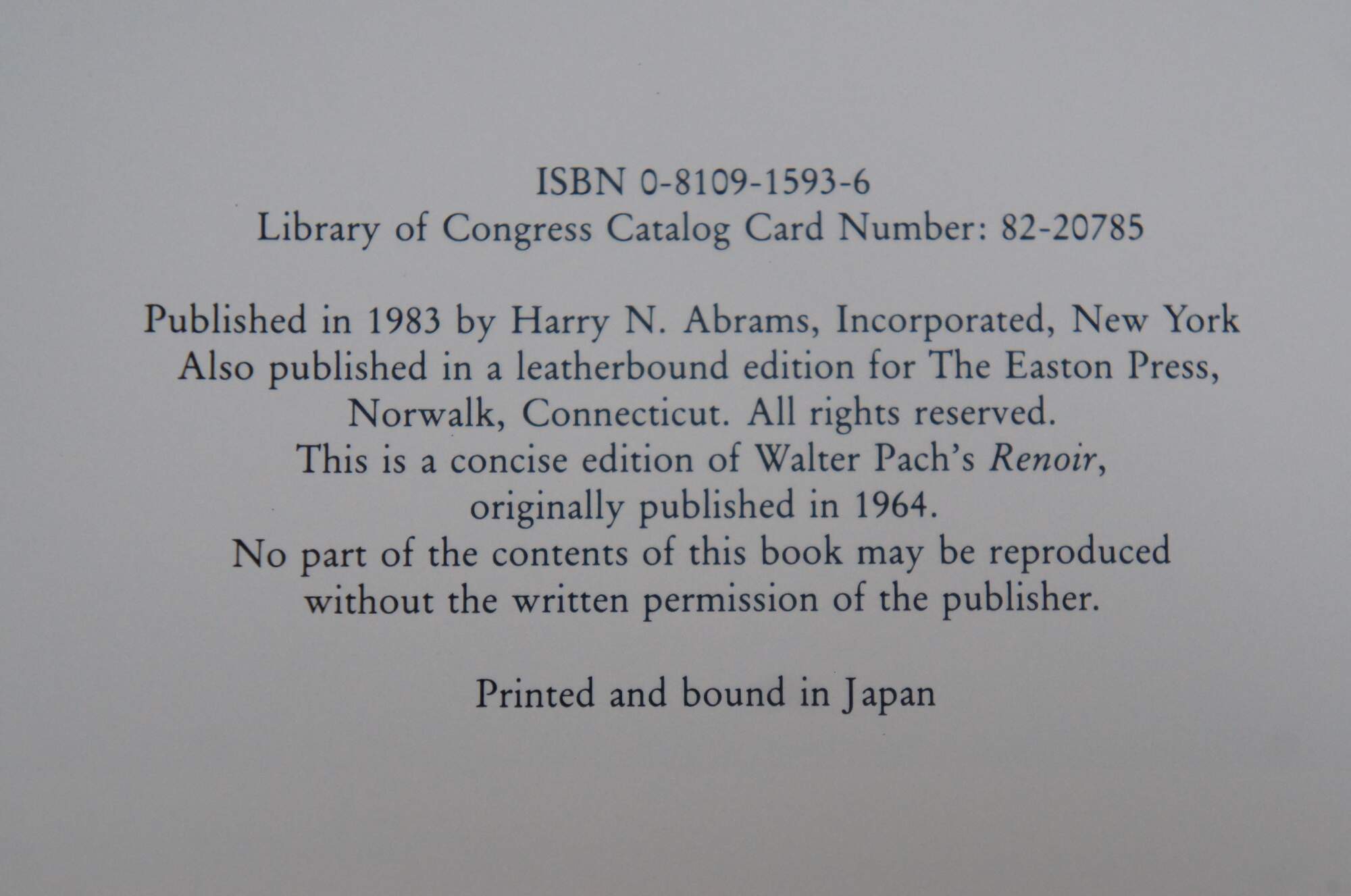 Renoir: Pierre Auguste Renoir" - Introduction by Walter Pach - ISBN: 0-8109-1593-6 - Published 1983 by Harry N. Abrams Inc - A concise edition of Walter Pach's Renoir, originally published in 1964. - Printed and bound in Japan. "Rembrandt: Rembrandt Harmensz Van Rijn" - Text by Ludwig Munz with Additional Commentaries by Bob Haak - ISBN: 0-8109-1594-4 - Published 1984 by Harry N. Abrams Inc - A concise edition of Ludwig Munz and Bob Haak's Rembrandt, originally published in 1967. Printed and bound in Japan. Both hard bound / hard back beige cloth / fabric cover with jacket.