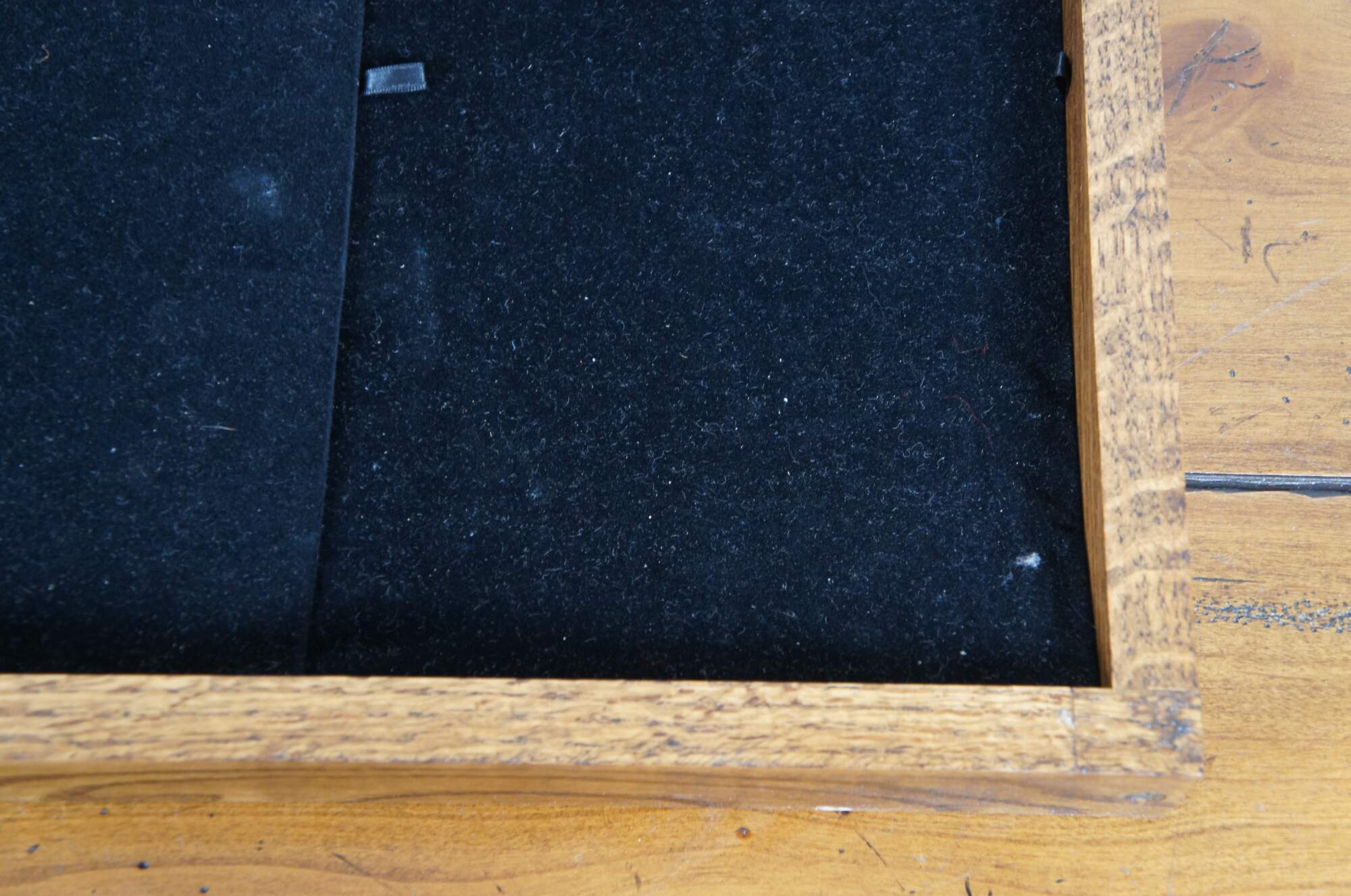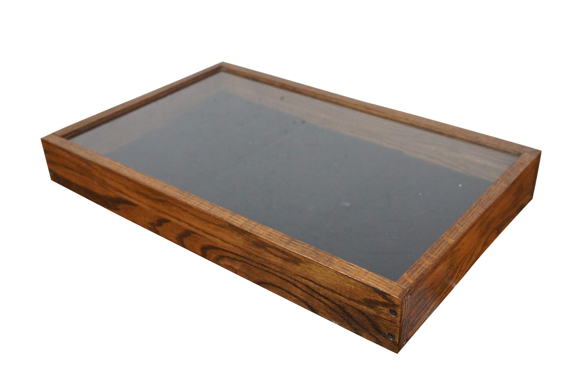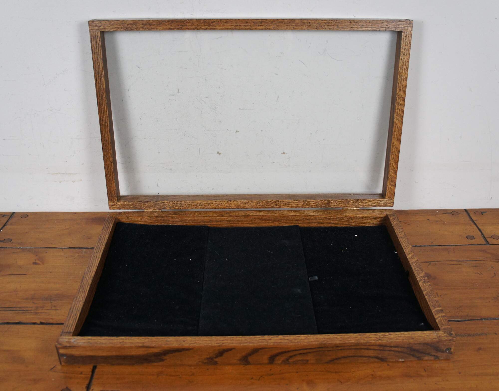 20th century counter top / tabletop display case / showcase / shadow box, made of oak with glass fronted lid. Three black velvet jewlery pads line the interior. Particle board base. Perfect for displaying jewelry or trinkets.