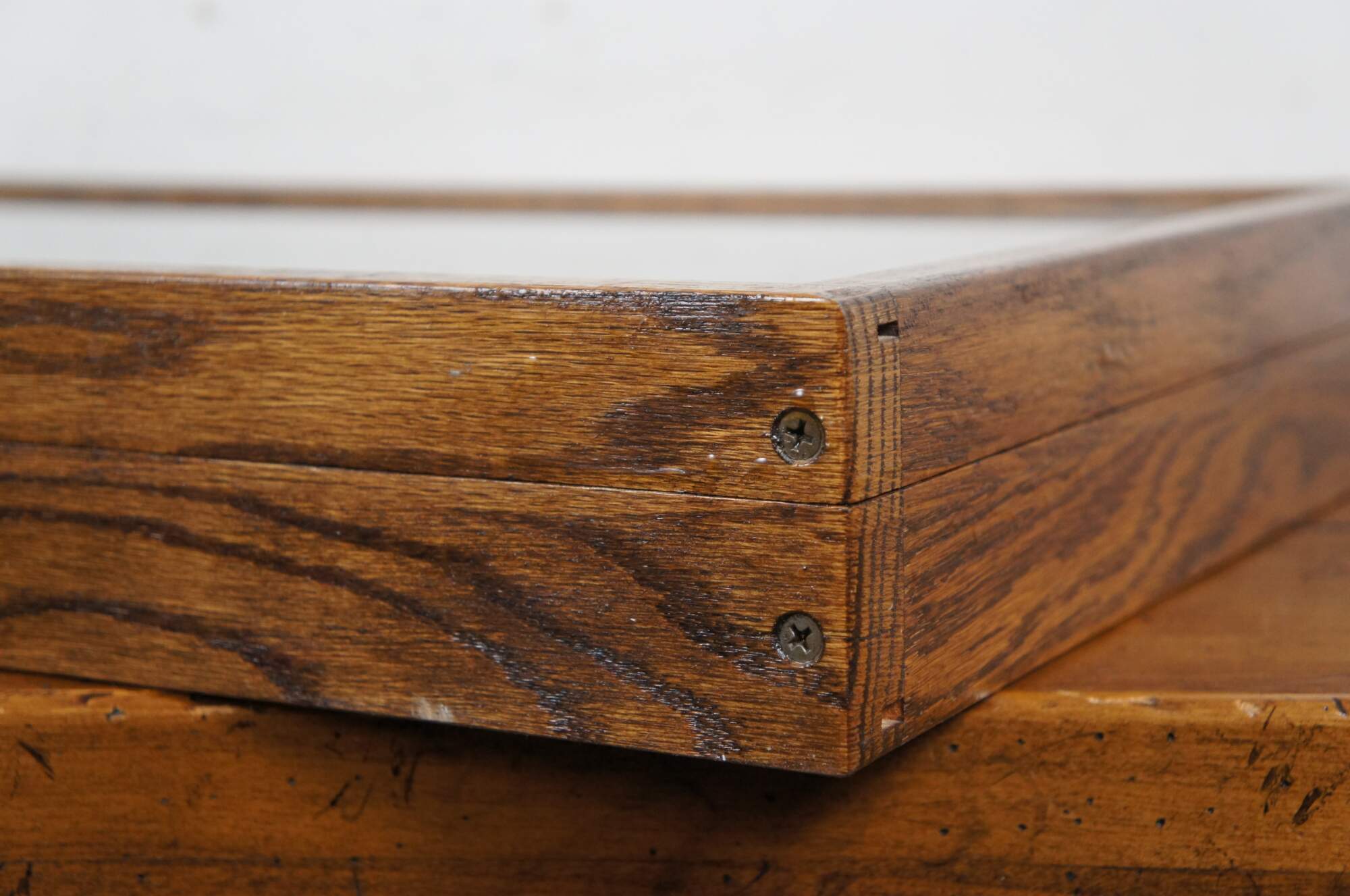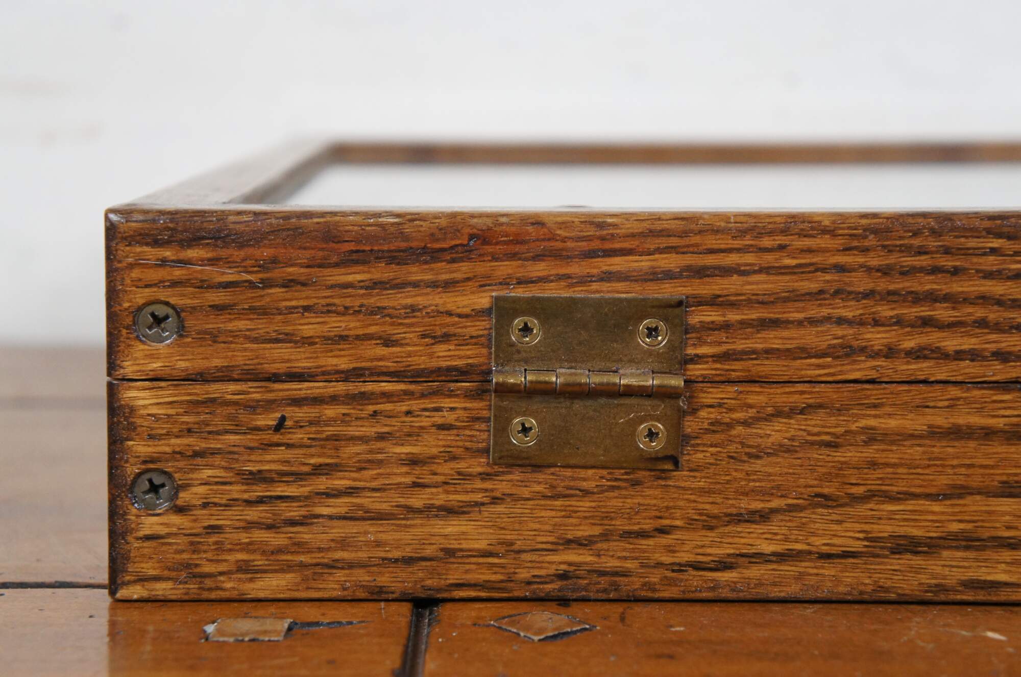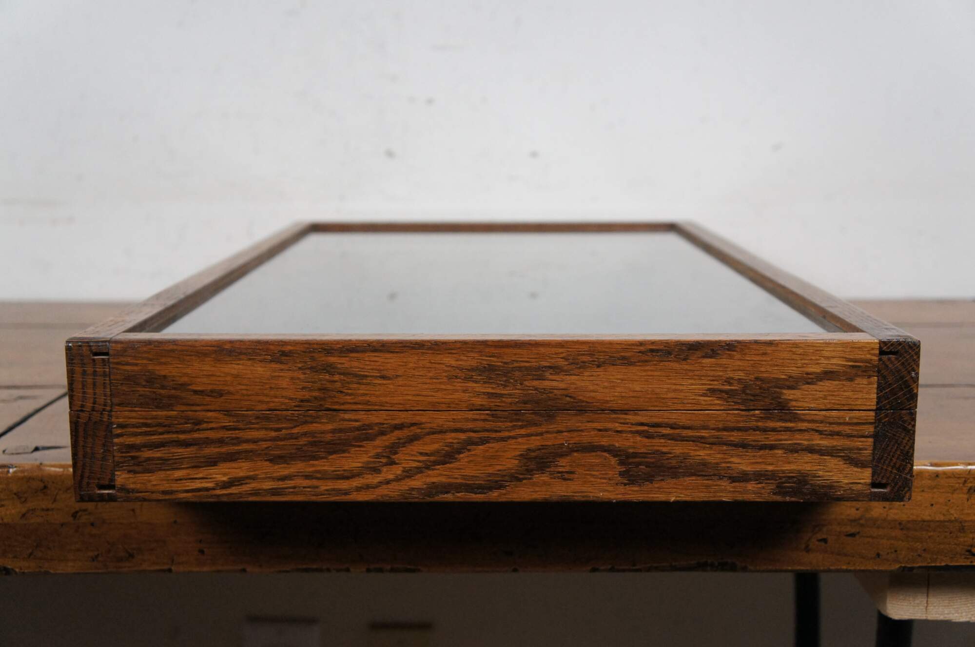 20th century counter top / tabletop display case / showcase / shadow box, made of oak with glass fronted lid. Three black velvet jewlery pads line the interior. Particle board base. Perfect for displaying jewelry or trinkets.