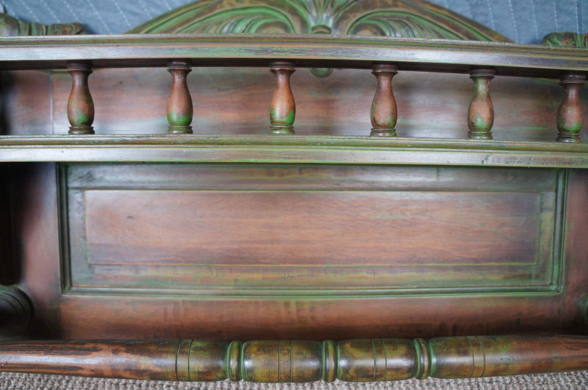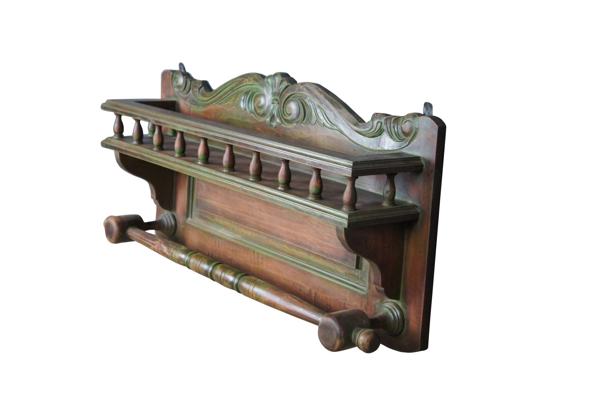 Antique Victorian mahogany wall shelf and towel bar. Great for use near a bathroom vanity or in the kitchen. Features a mahogany frame with a serpentine "S" scrolled backsplash. A shelf with spindled gallery and lower towel bar. Hangs along the backside via two metal plates.