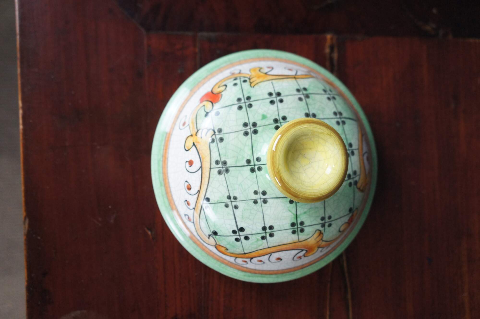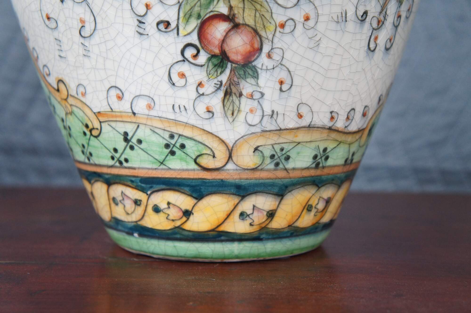 Late 20th Century urn or vase in Italian majolica manner. Features rope twisted handles and a painted fruit design with crackle glaze. Inspired by the Italian artisans behind Deruta. Marked China along the base.