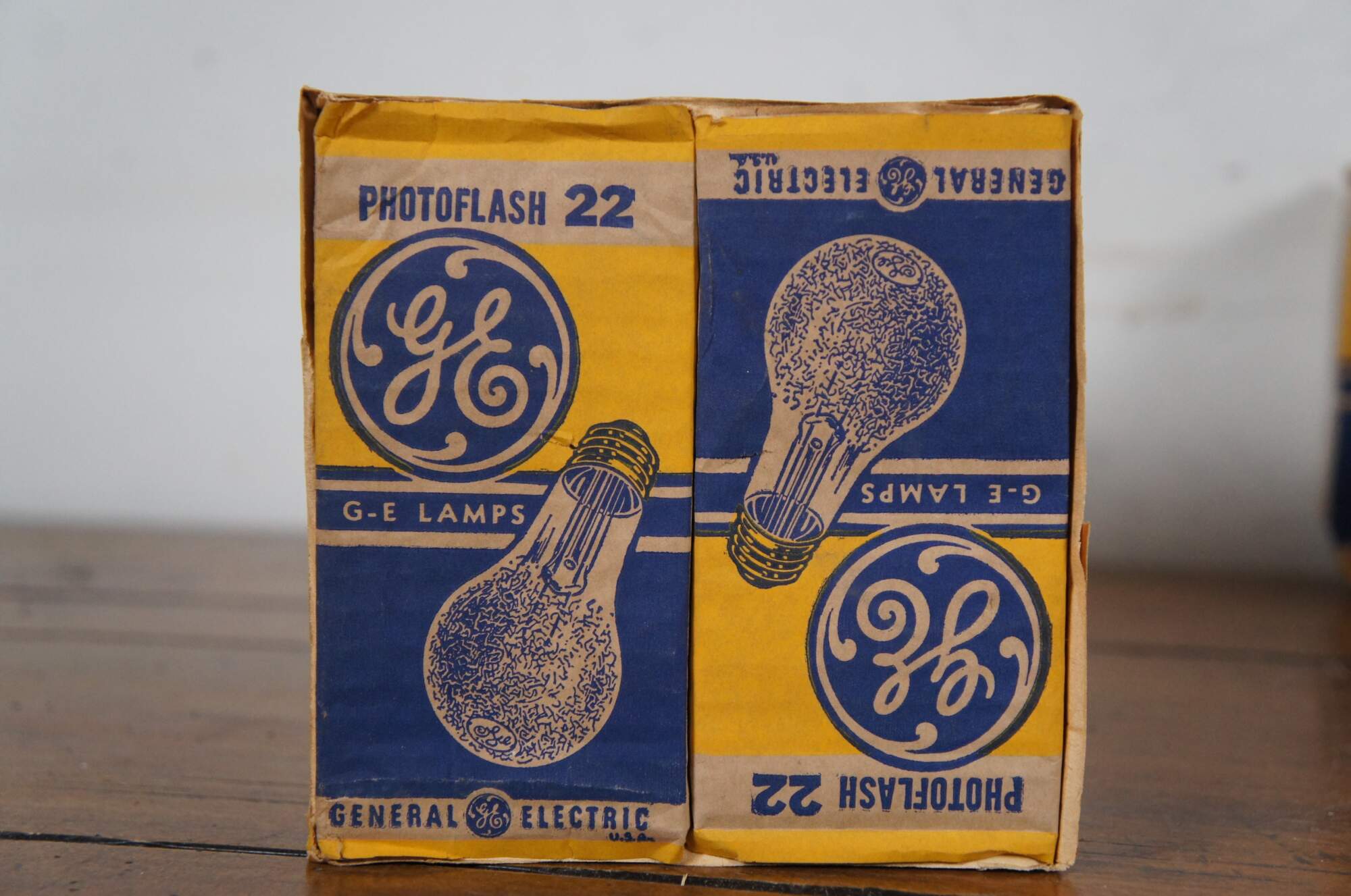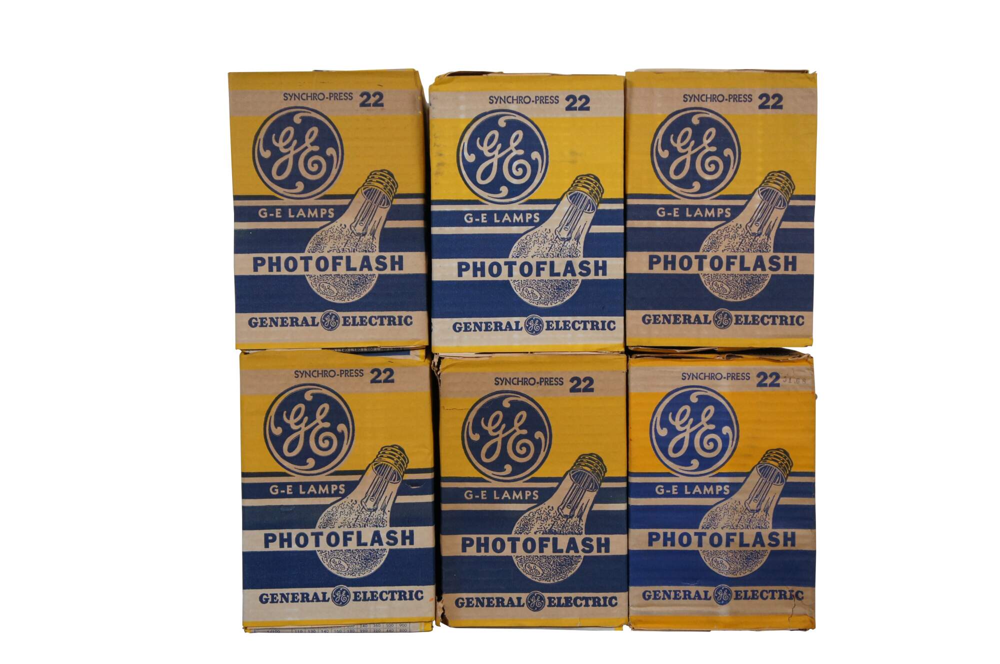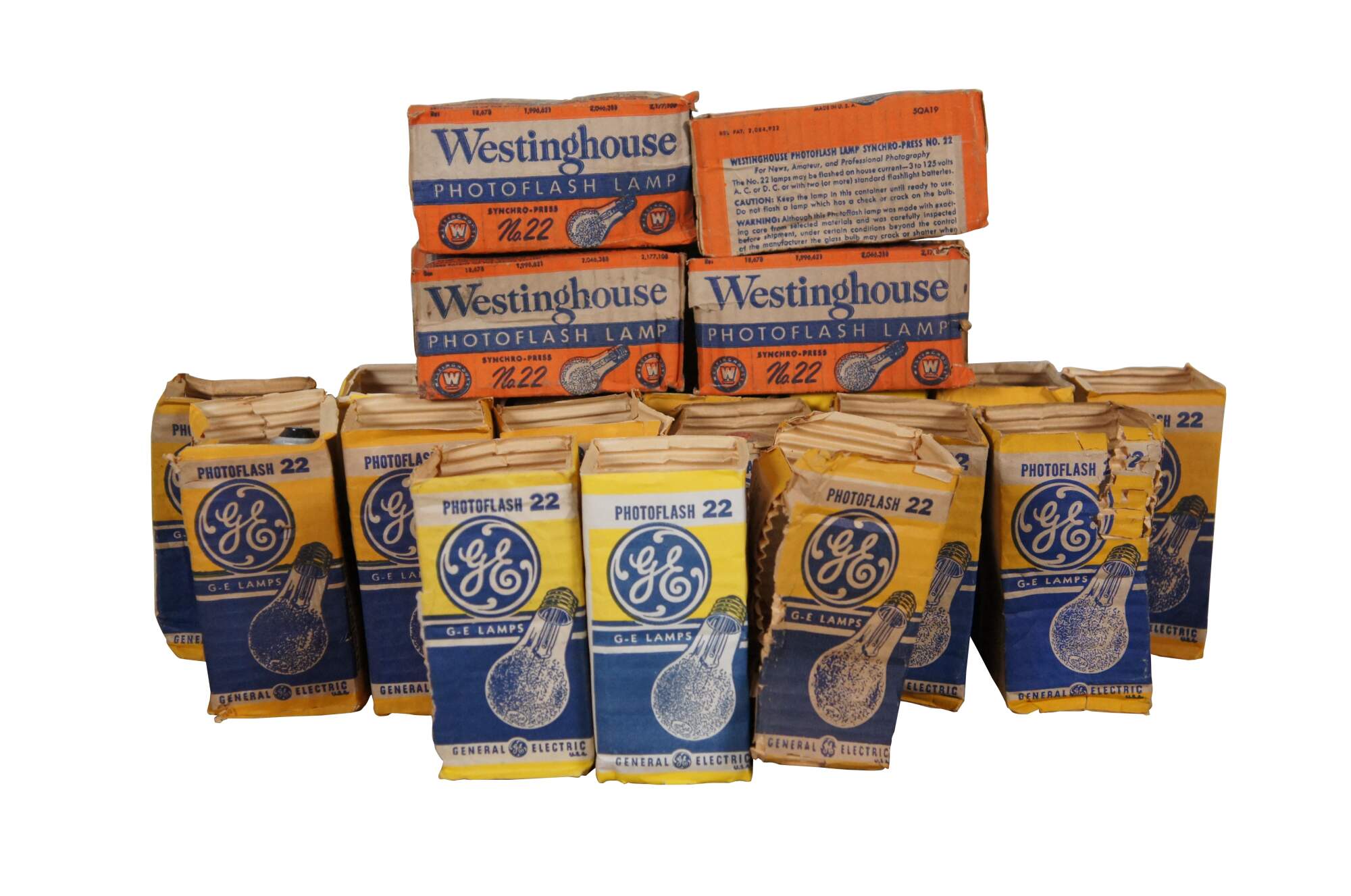 Lot of 119 mid to late 20th century Westinghouse and General electric No 22 Photoflash lamp / flash bulbs, some loose, some in original packaging. Inludes: 63 loose; 20 singles boxed; 6 boxes of 6.