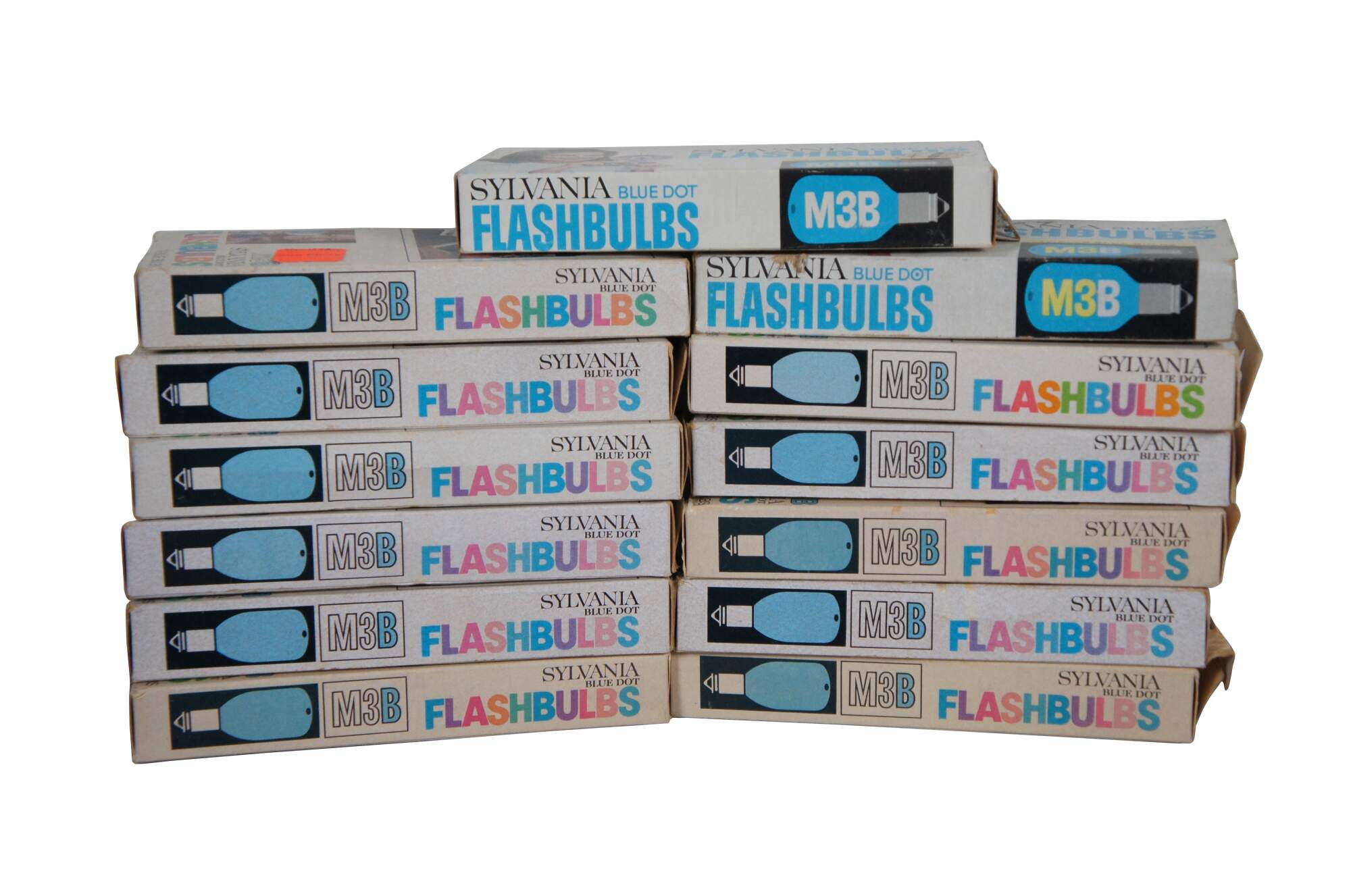 Vintage mid to late 20th century lot of 168 Sylvania Blue Dot camera flash bulbs, misture of No. M3 and M3B. 14 boxes of 12.