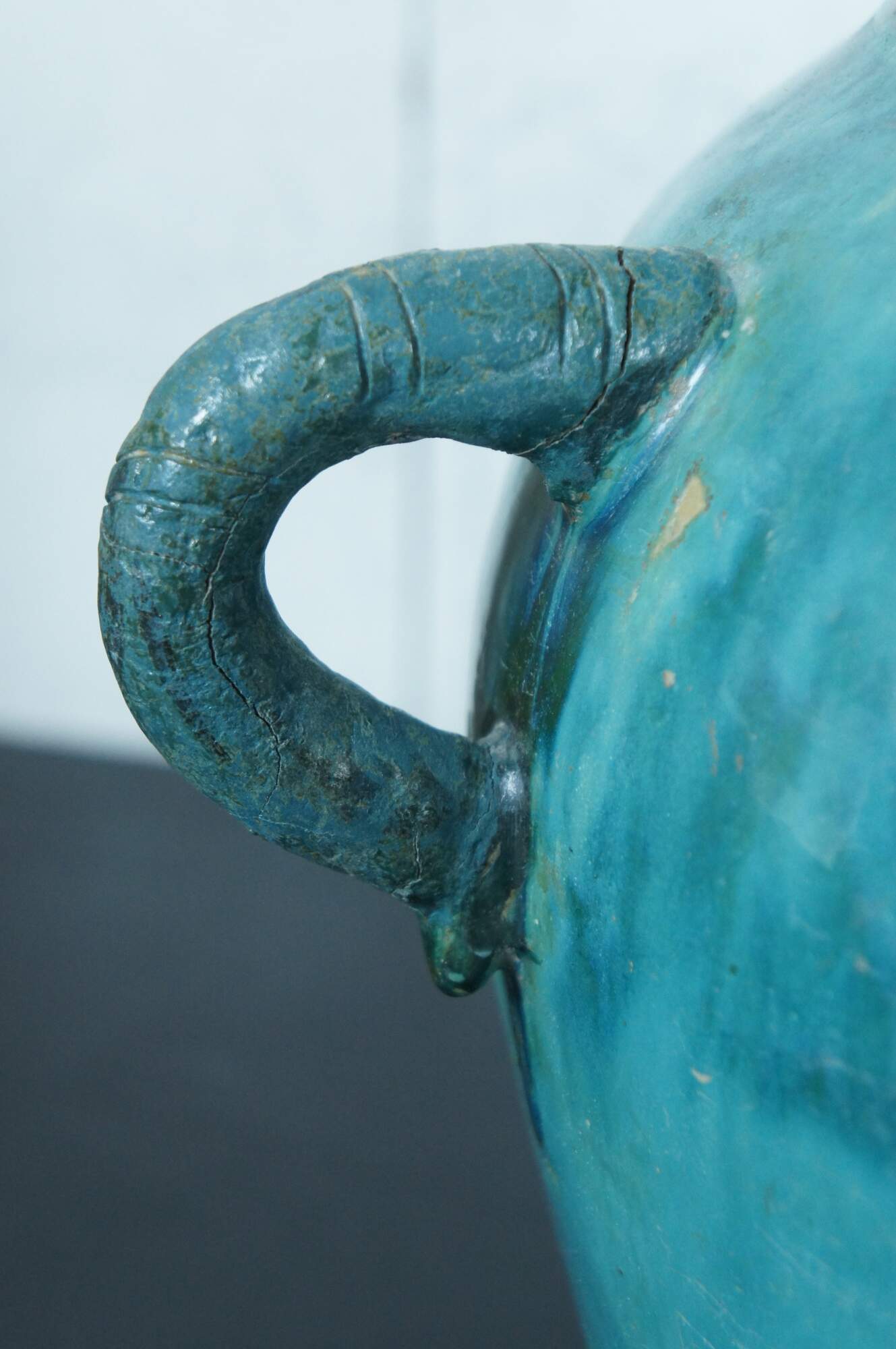 Antique Chinese Chinoiserie medicine or wine jug / mantel urn / jar - turquoise / blue-green glaze with small handle, upsidedown dragon head spout, ginger jar shaped lid, and plaque on front.
