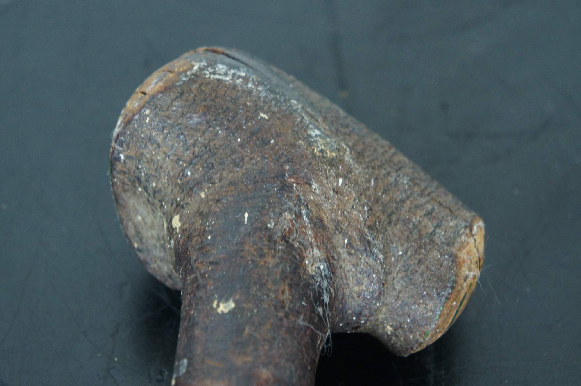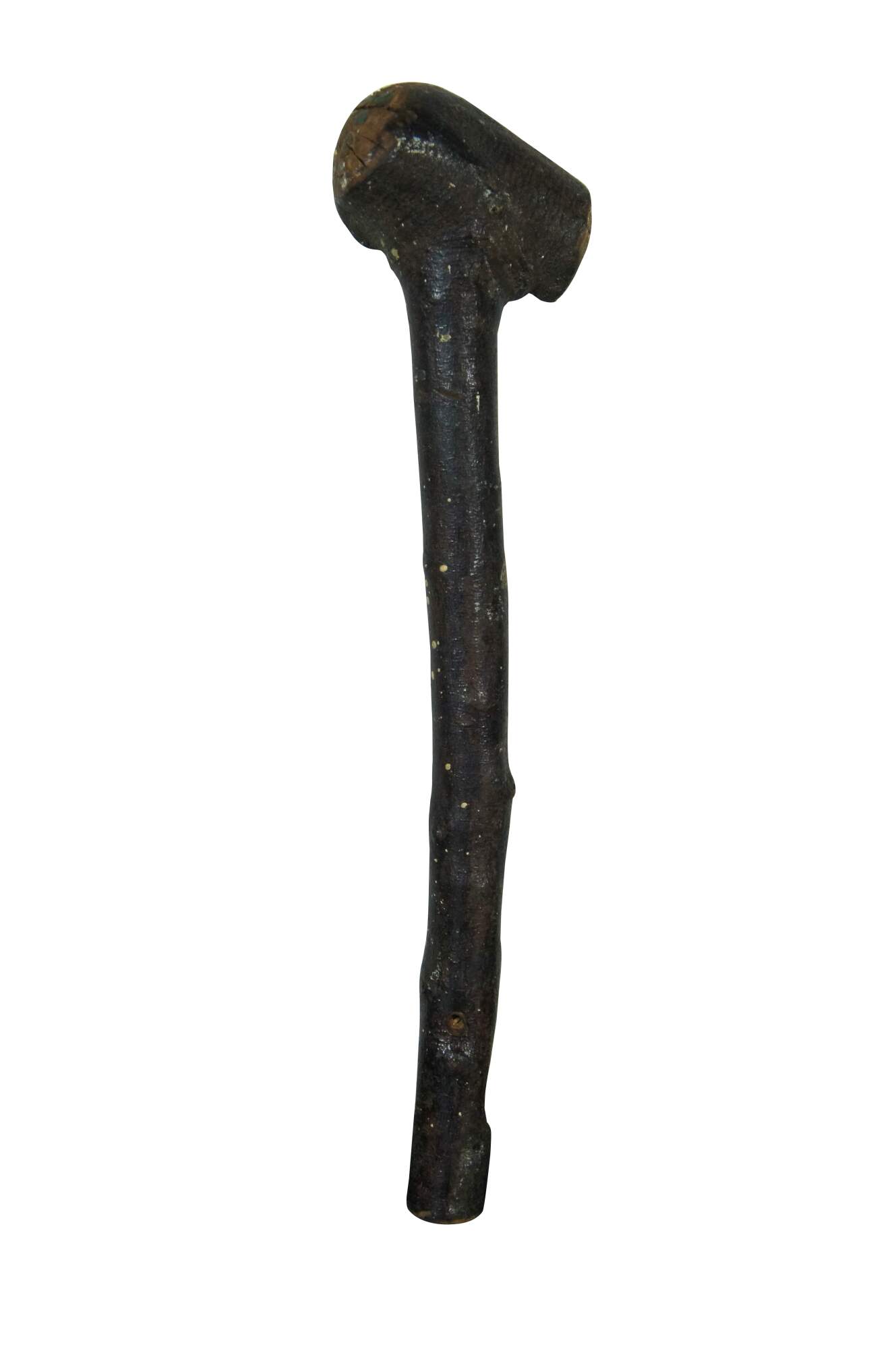 Early 20th century primitive brutalist style Irish bog blackthorn knobkerrie / shillelagh / club, featuring carved designs of a harp, three leaf clovers / shamrocks, and Erin painted in green on the cut ends. Drilled hole on handle for leather thong / wrist strap.