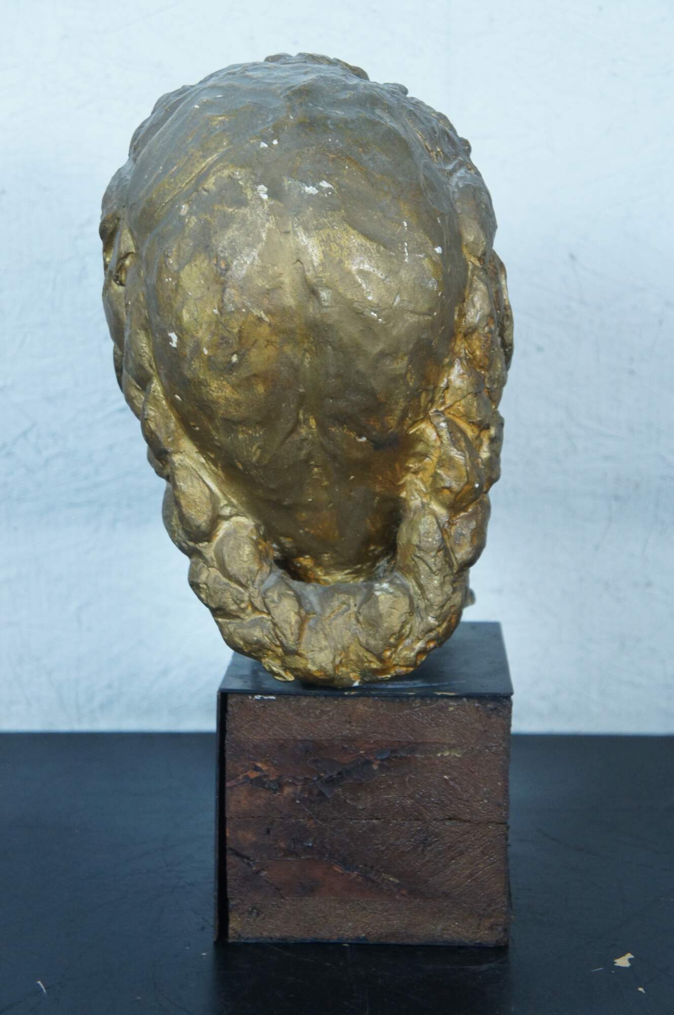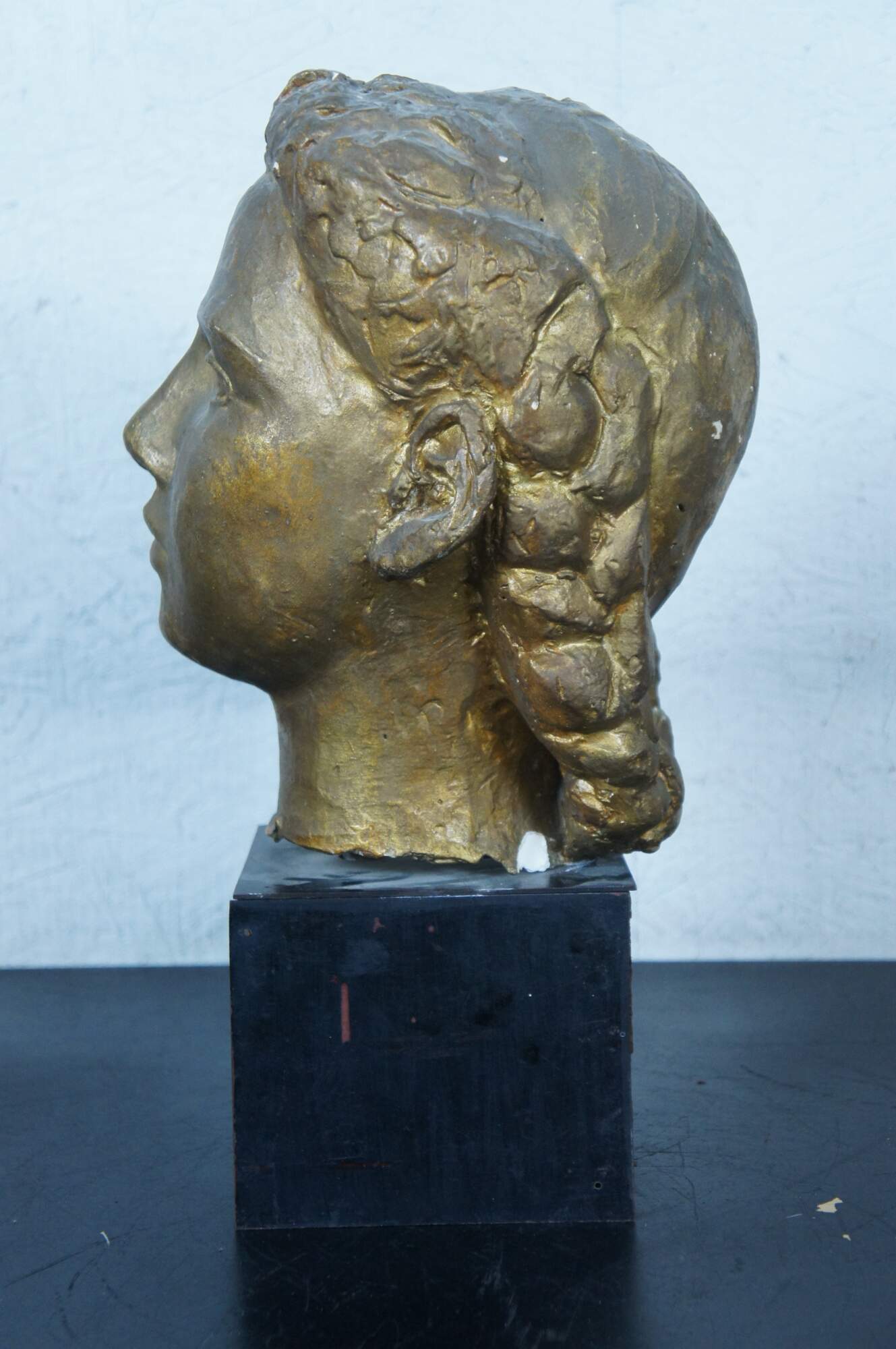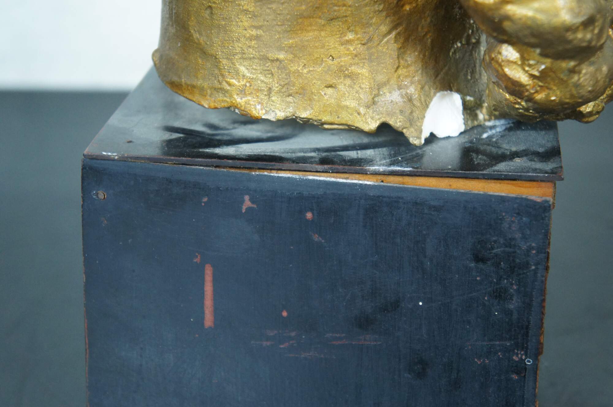 Vintage plaster library bust statue or sculpture depicting a female face with beaded hair, painting gold. Mounted on a wooden base clad with black lacquer panels