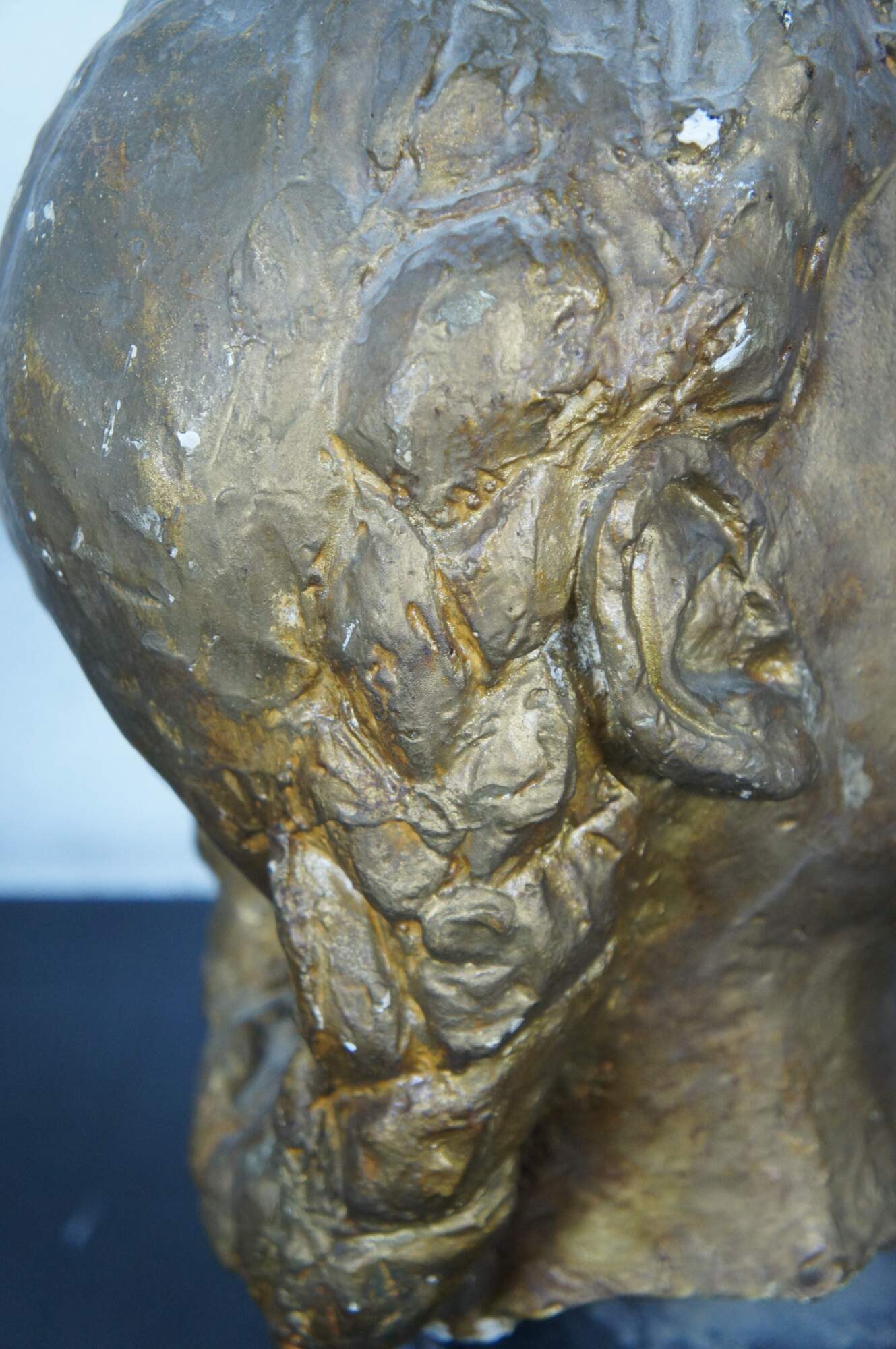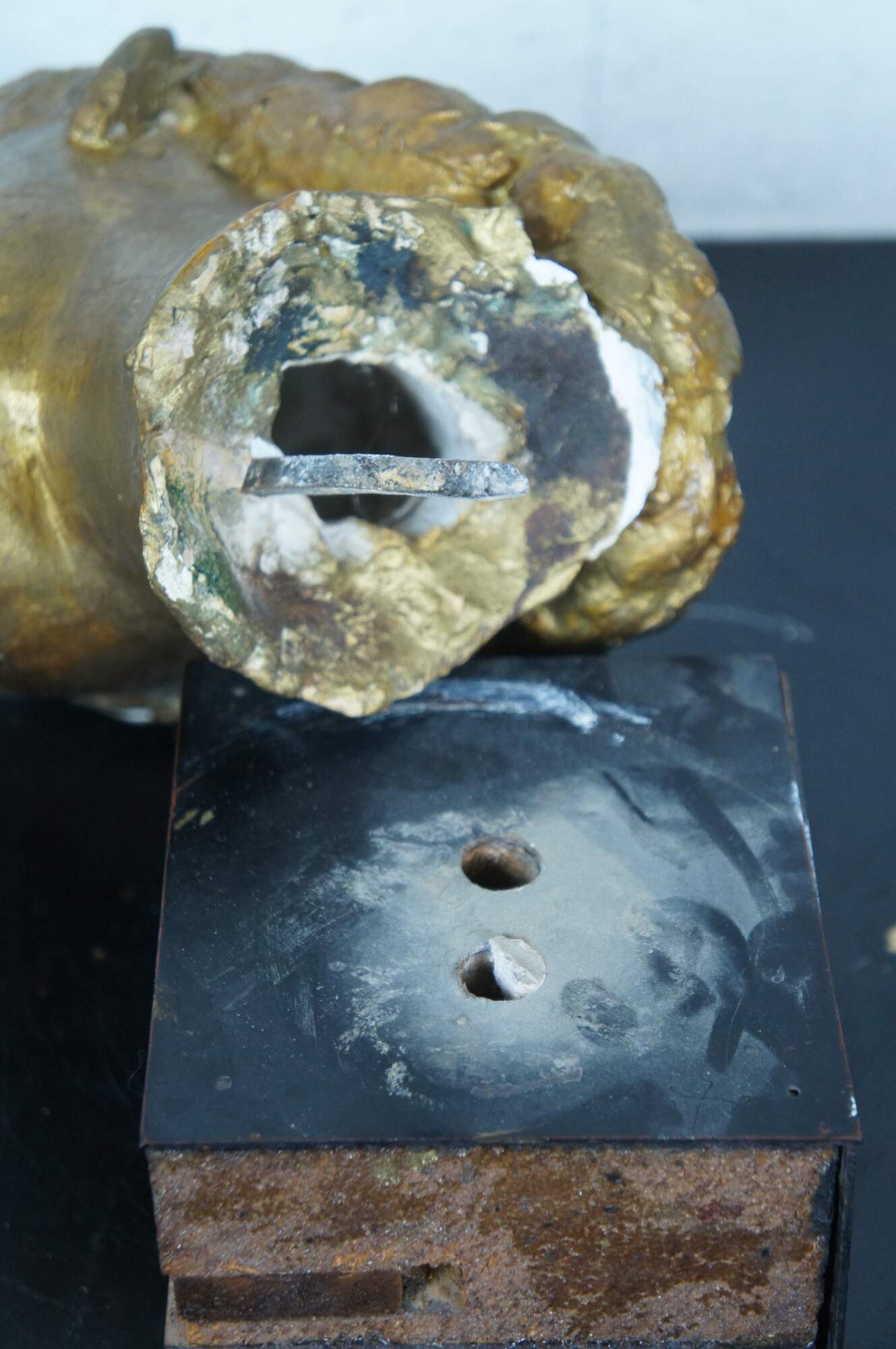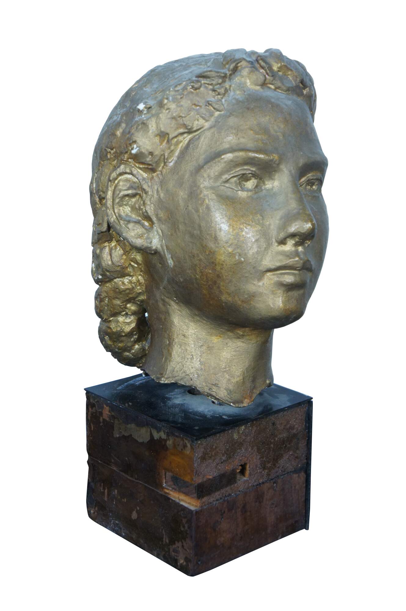Vintage plaster library bust statue or sculpture depicting a female face with beaded hair, painting gold. Mounted on a wooden base clad with black lacquer panels