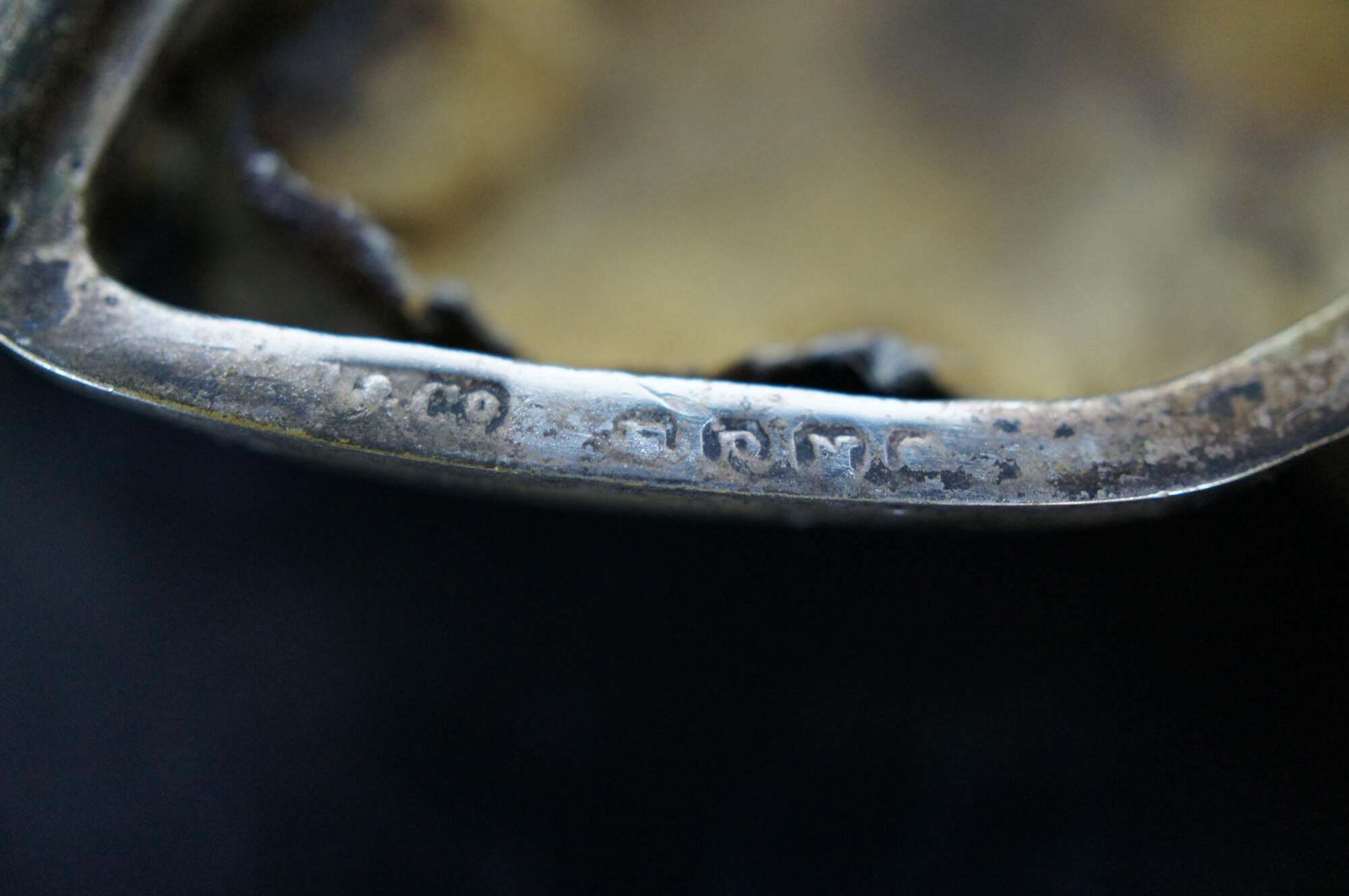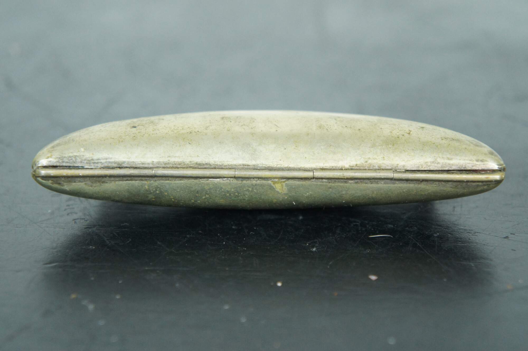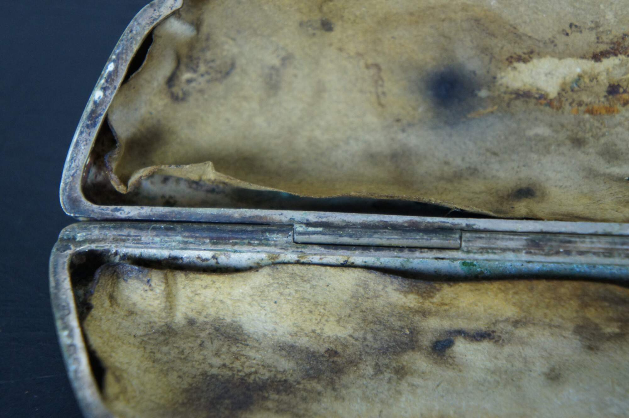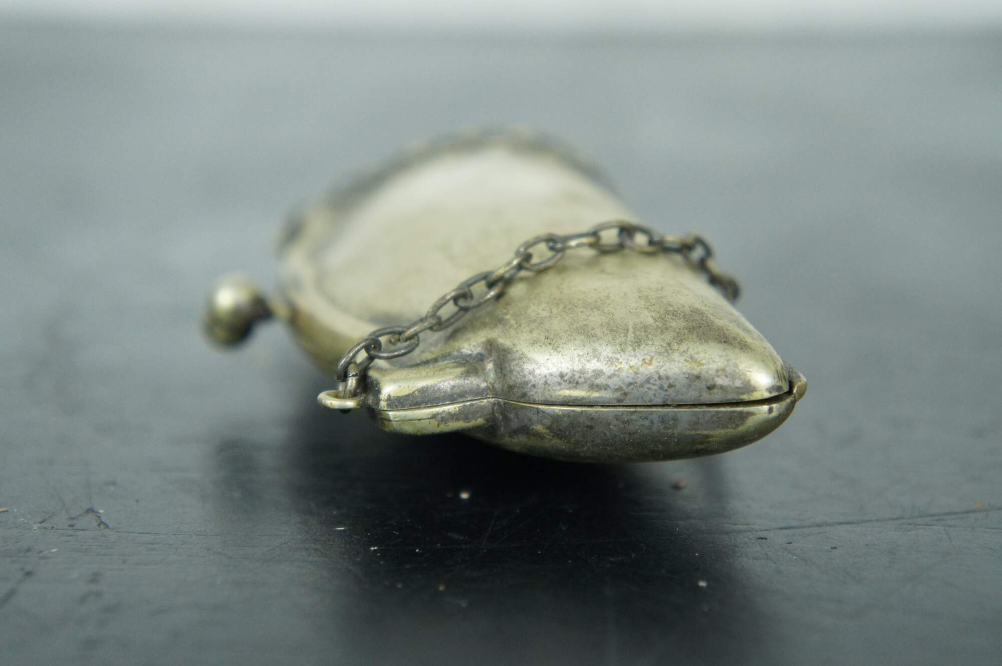 Early 20th century EPNS / silverplate coin purse or case for a small pair of eye glasses / spectacles / pince nez. Clamshell style with chain and finger ring for carrying on the hand or securing to a chatelaine.