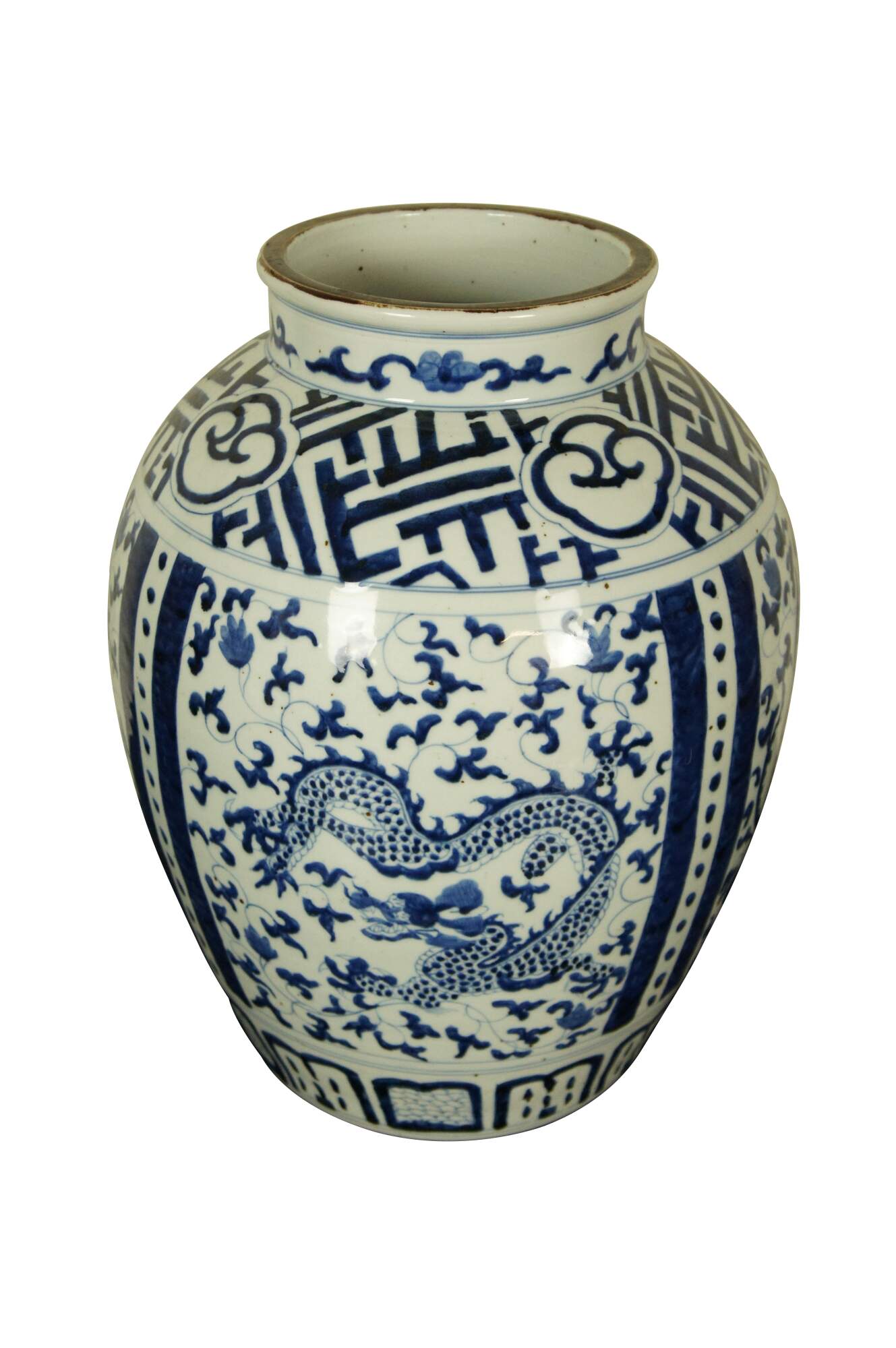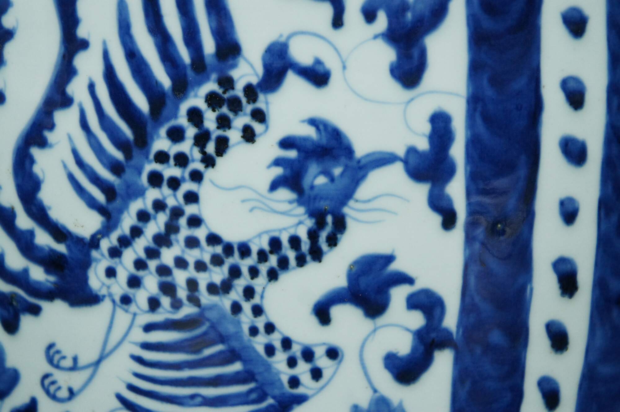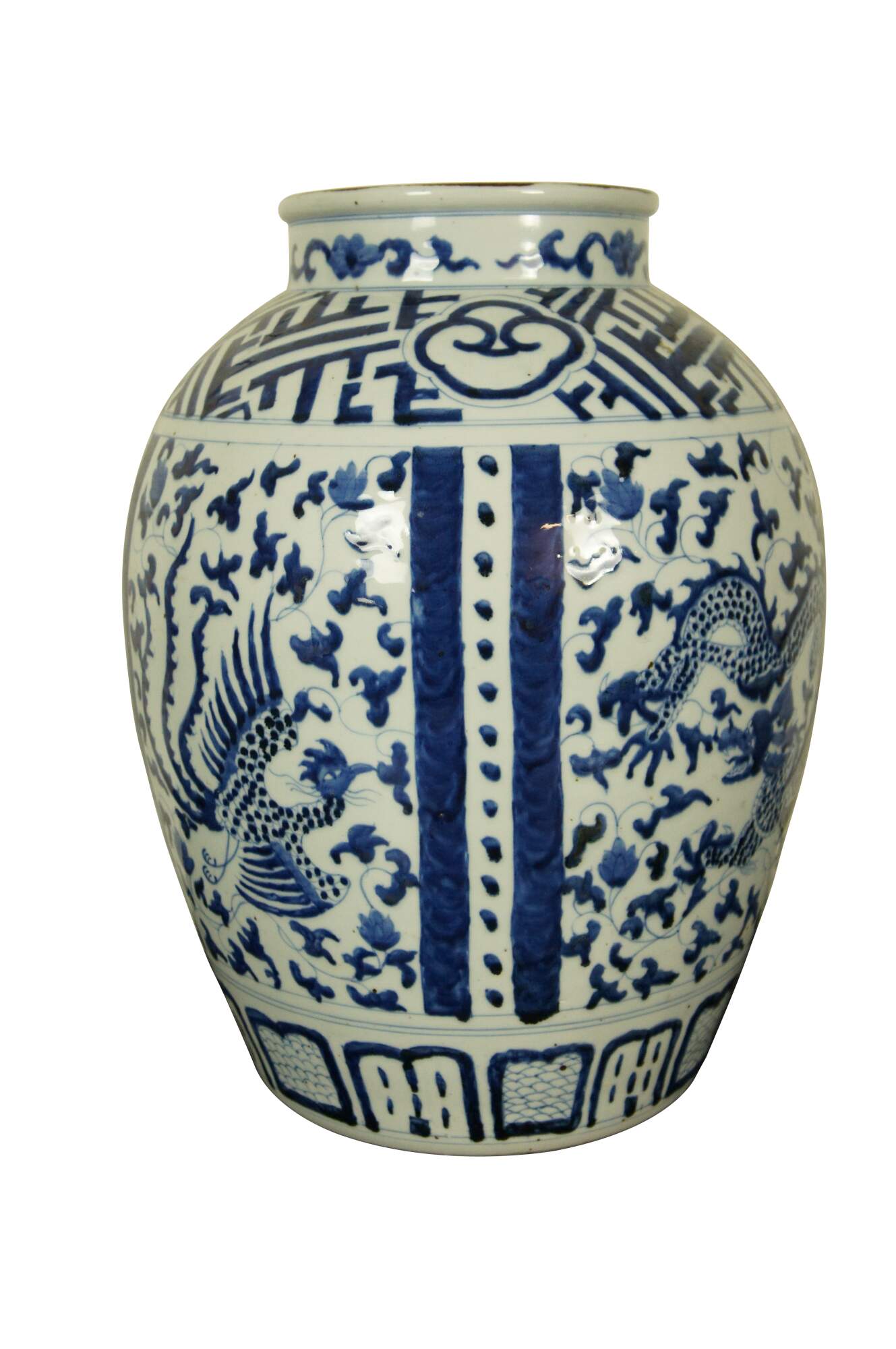 A large and impressive antique Chinese Qing dynasty blue and white ceramic mantel urn / floor vase / jardiniere / planter, hand painted with alternating panels showing a phoenix and dragon framed with flowers and geometric designs.