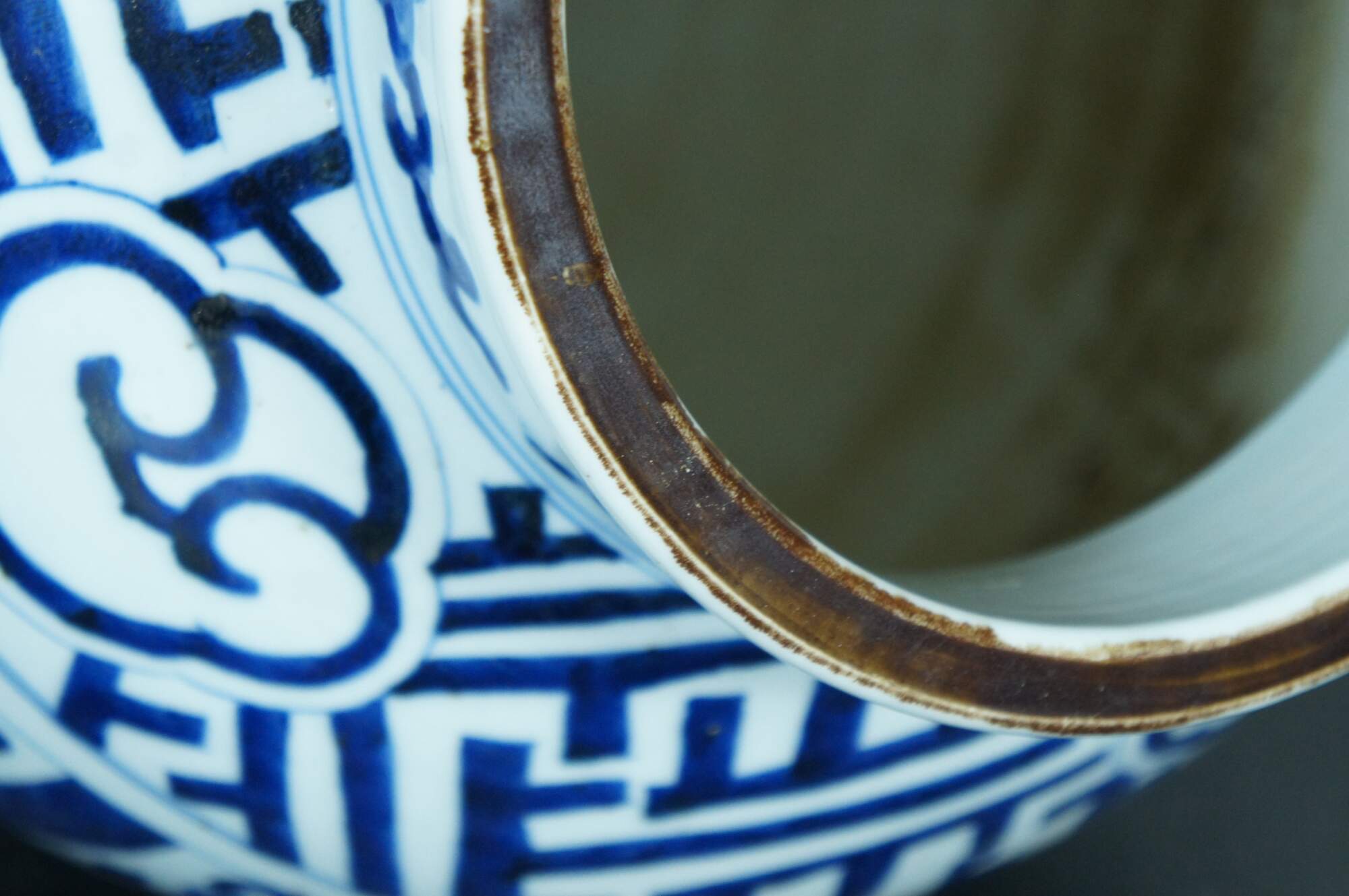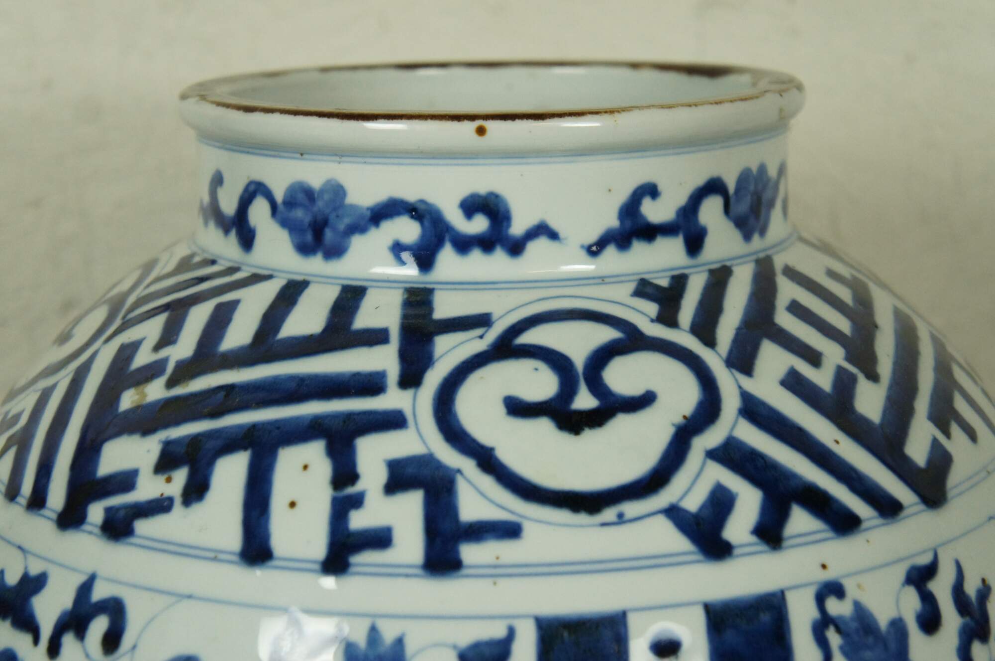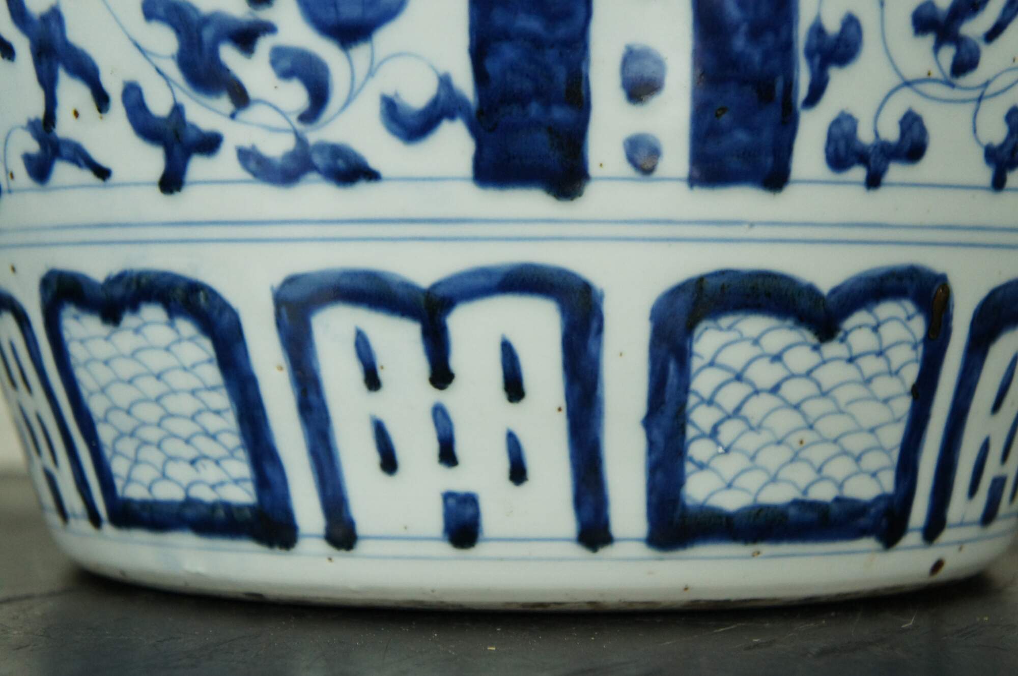 A large and impressive antique Chinese Qing dynasty blue and white ceramic mantel urn / floor vase / jardiniere / planter, hand painted with alternating panels showing a phoenix and dragon framed with flowers and geometric designs.