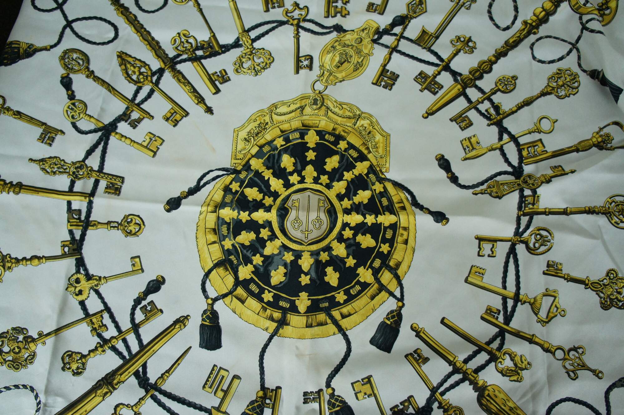 Late 20th century Hermes-Paris 100% silk scarf in black and gold with a motif of locks, keys and tassels.