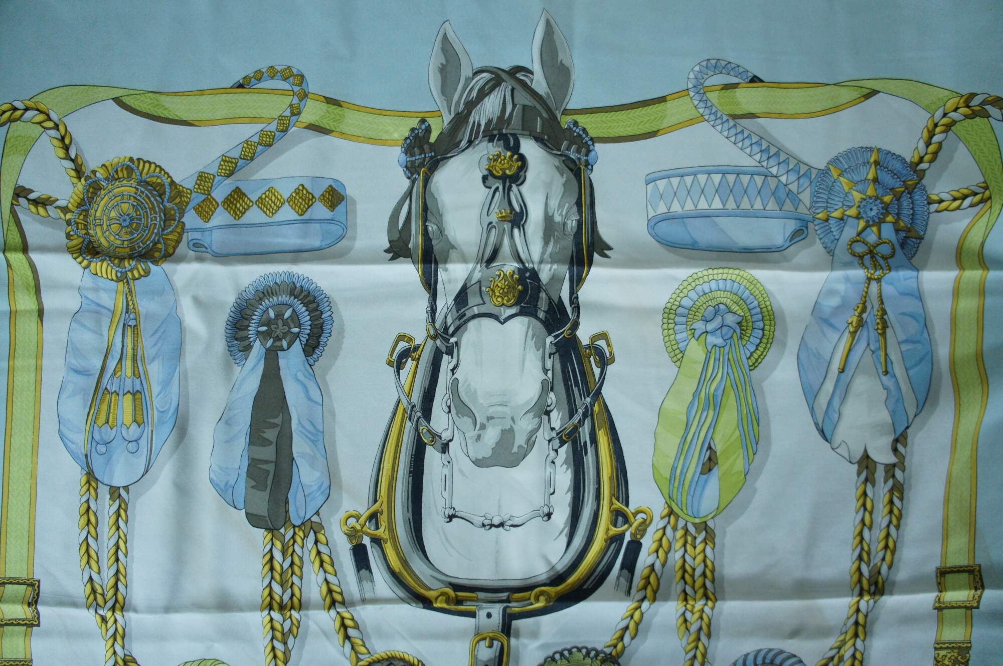 Late 20th century Hermes-Paris Frontaux et Cocardes 100% silk scarf featuring motif of a horse bust and array of prize ribbons in blue, white and chartreuse. Includes box.