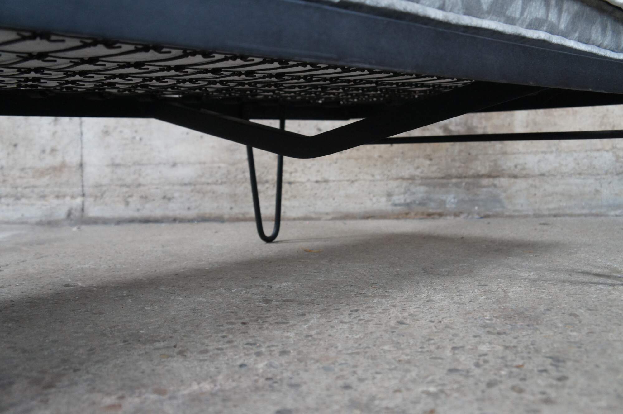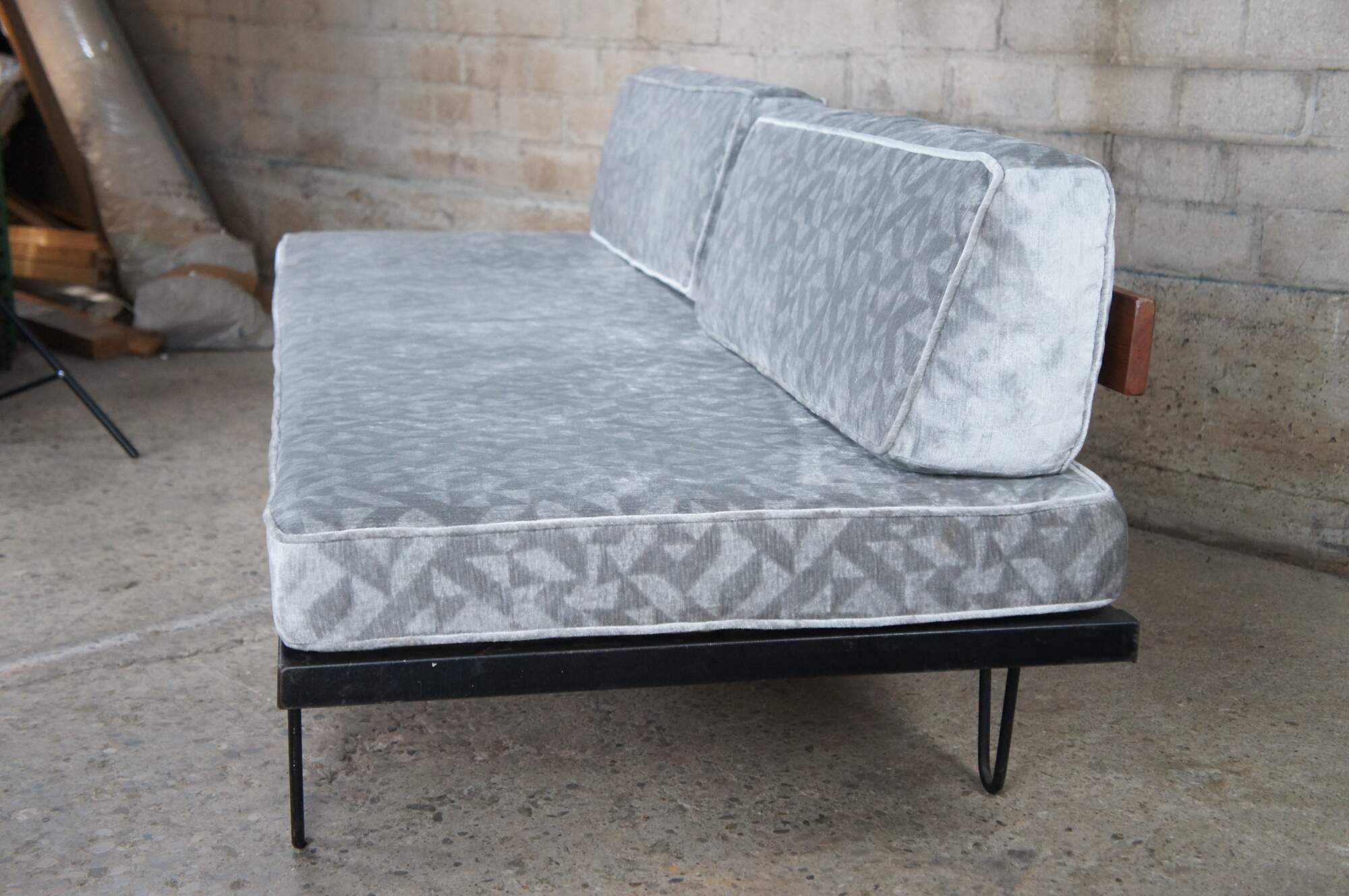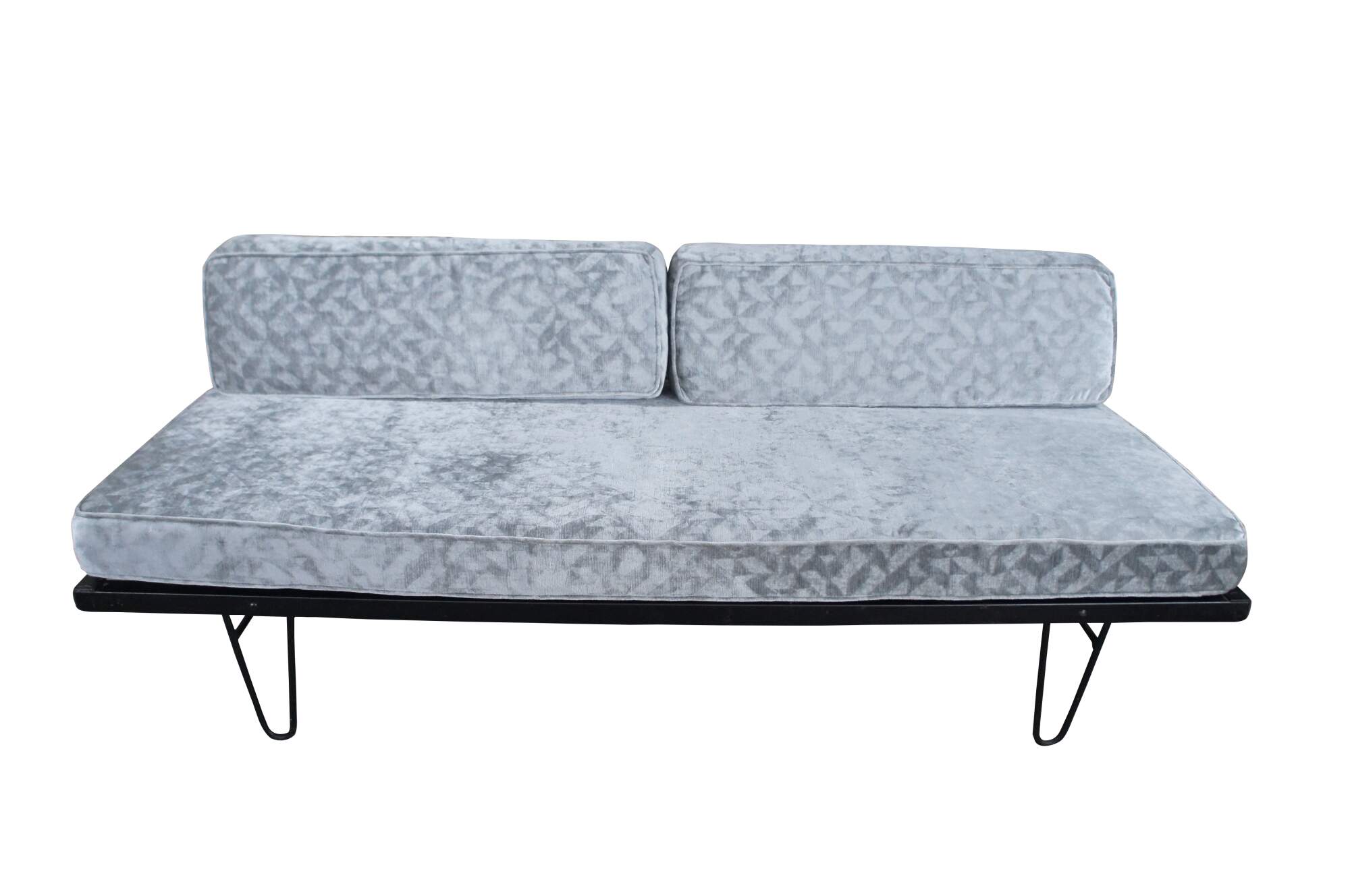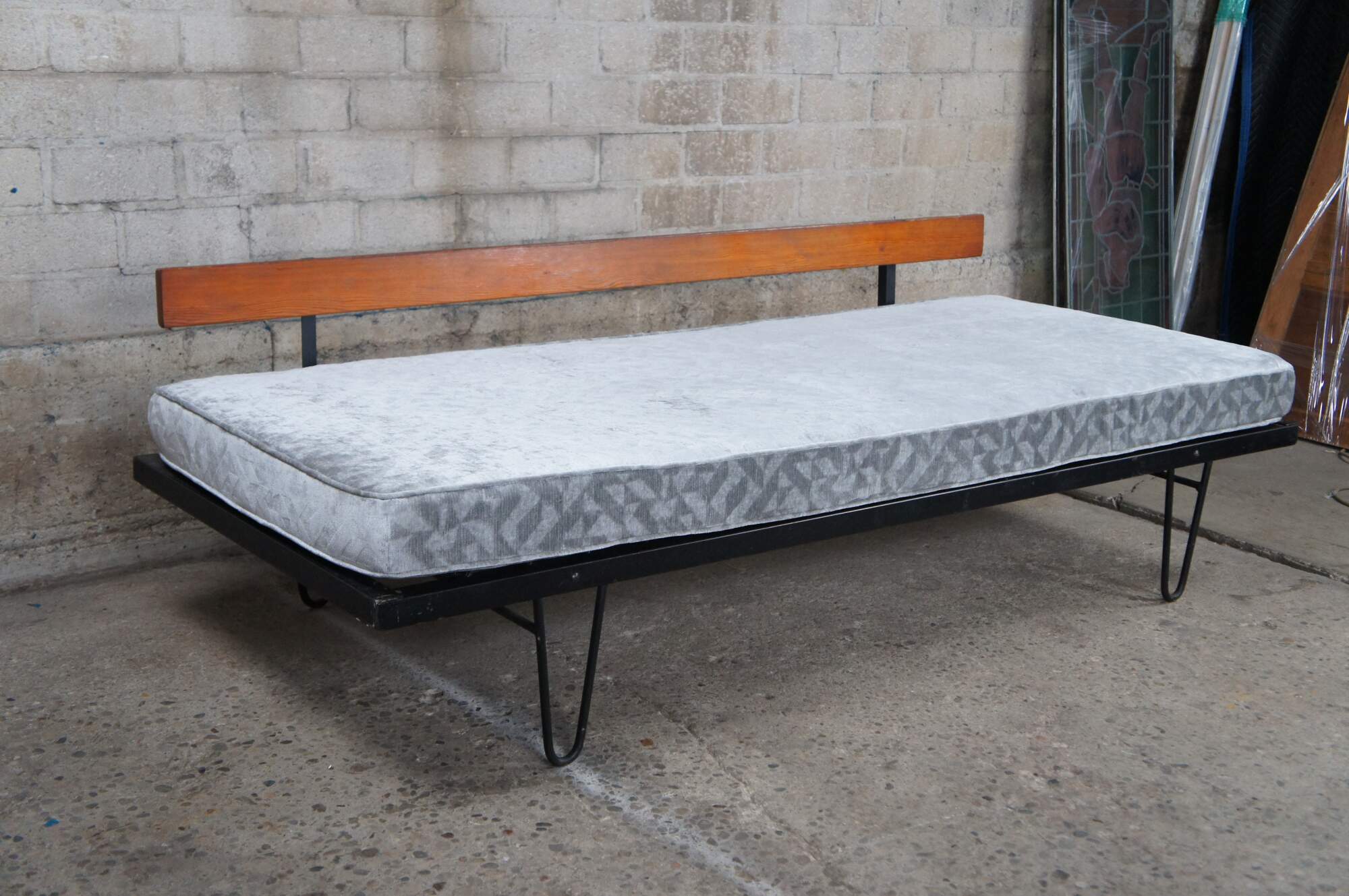 Mid century modern George Nelson for Herman Miller Case Study daybed / sofa / couch / chaise lounge featuring iron hairpin legs with pine back support and upholstered cushions.