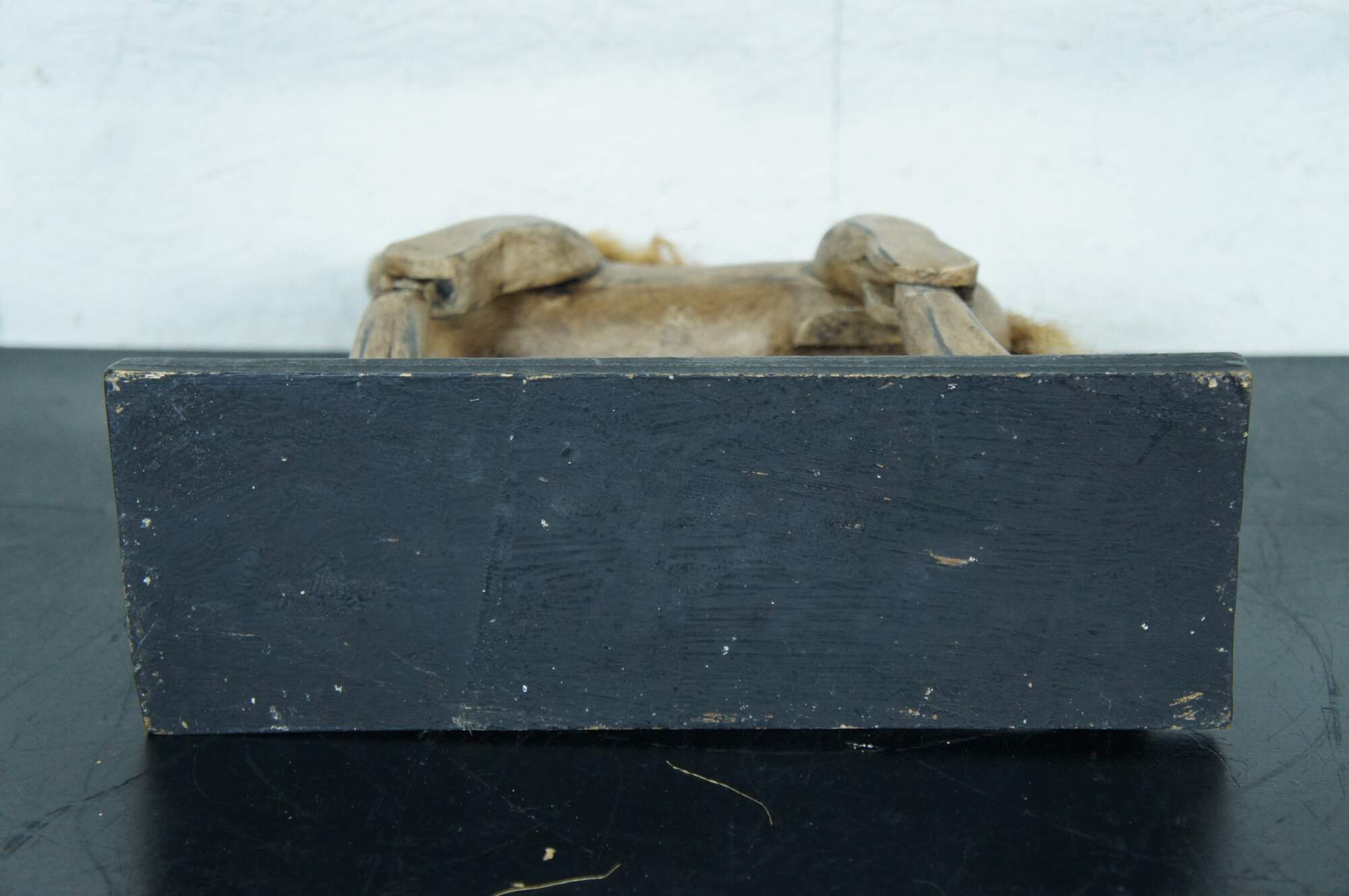 Vintage 20th century hand carved toy horse statue / sculpture / puppet with articulated legs. Artistically distressed paint; worn raffia / straw mane and tail. Mounted with two rods on a black wood stand.