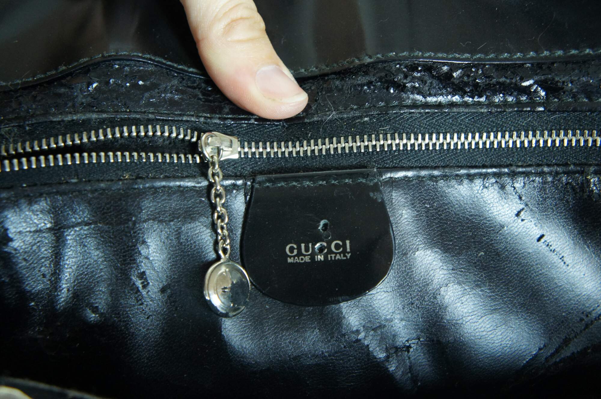 Vintage early Gucci black paptent leather tote bag / purse. Rectangular body with double handles. Open top with two corner snaps. Two open compartments (one with zippered side pocket) divided by a central zippered compartment. Made in Italy.