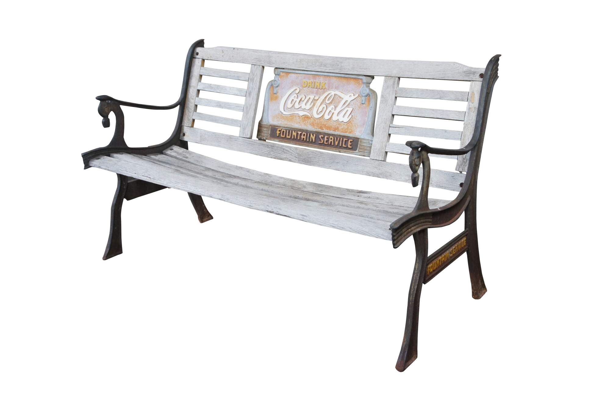 Antique Drink Coca Cola Fountain Service bench. Made of cast iron and wood featuring an inset advertising sign.