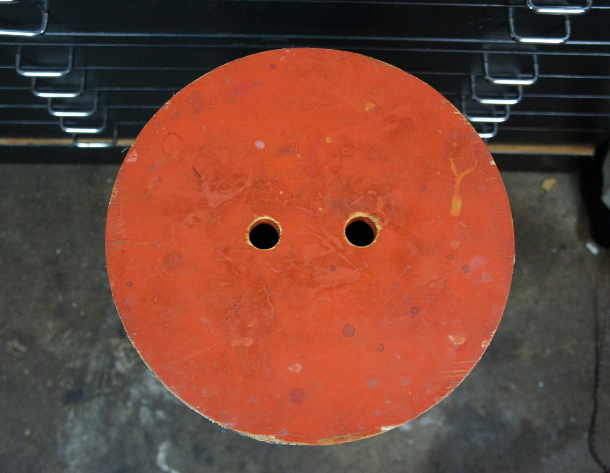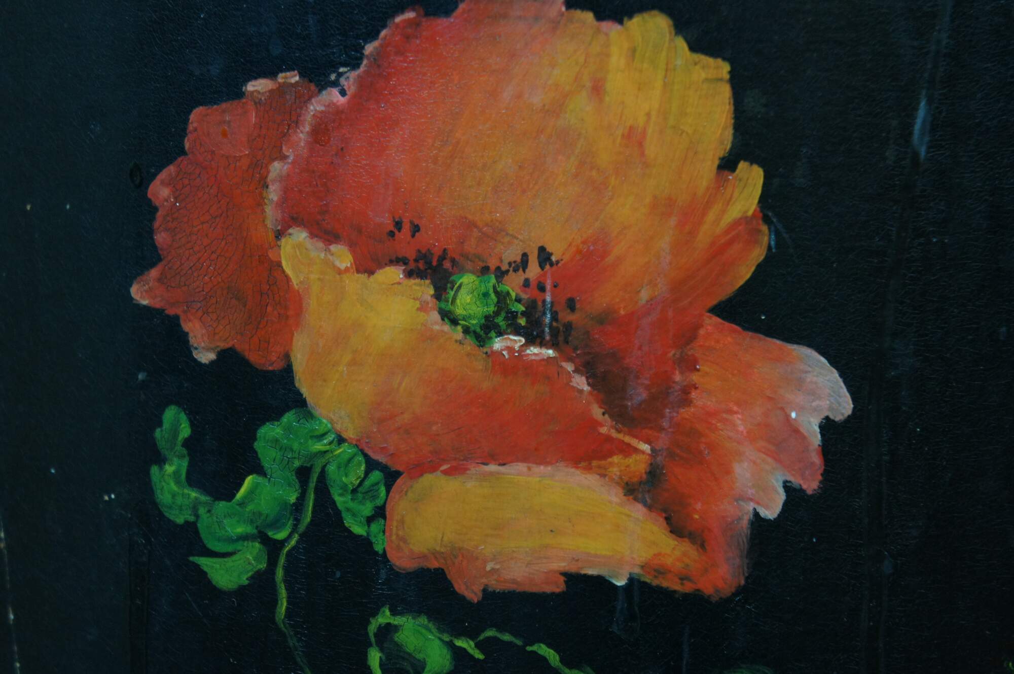 Vintage clothes hamper / waste basket / cane / umbrella stand - cylindrical thick paper mache body with wooden base and lid. Painted in the style of folk art toleware with green and red poppies on a black background.