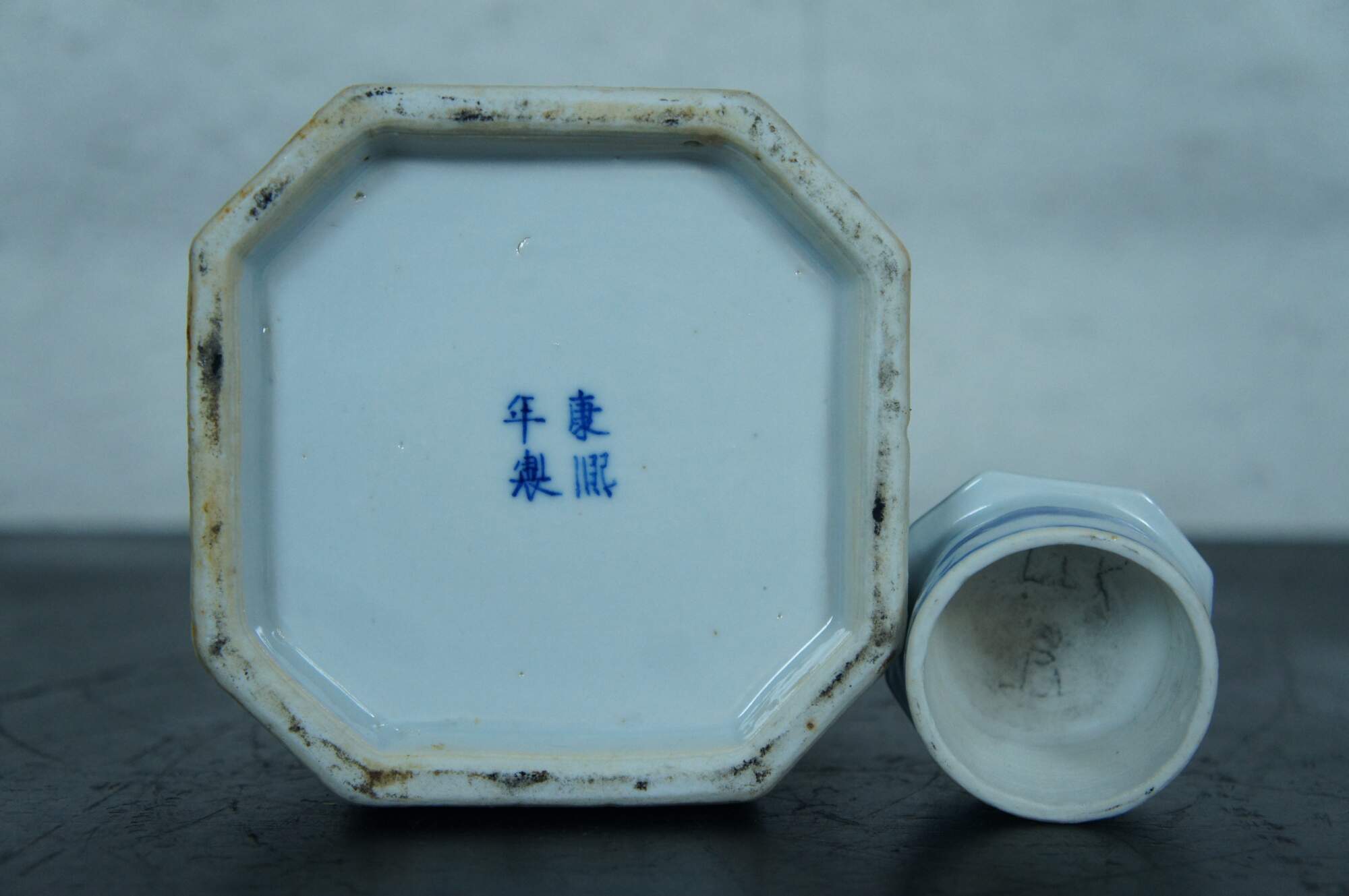 Blue and white Chinese porcelain octagonal tea caddy with round lid, painted with figures, boats and a village in a sweeping landscape surrounded by mountains, the top finished with a floral motif.