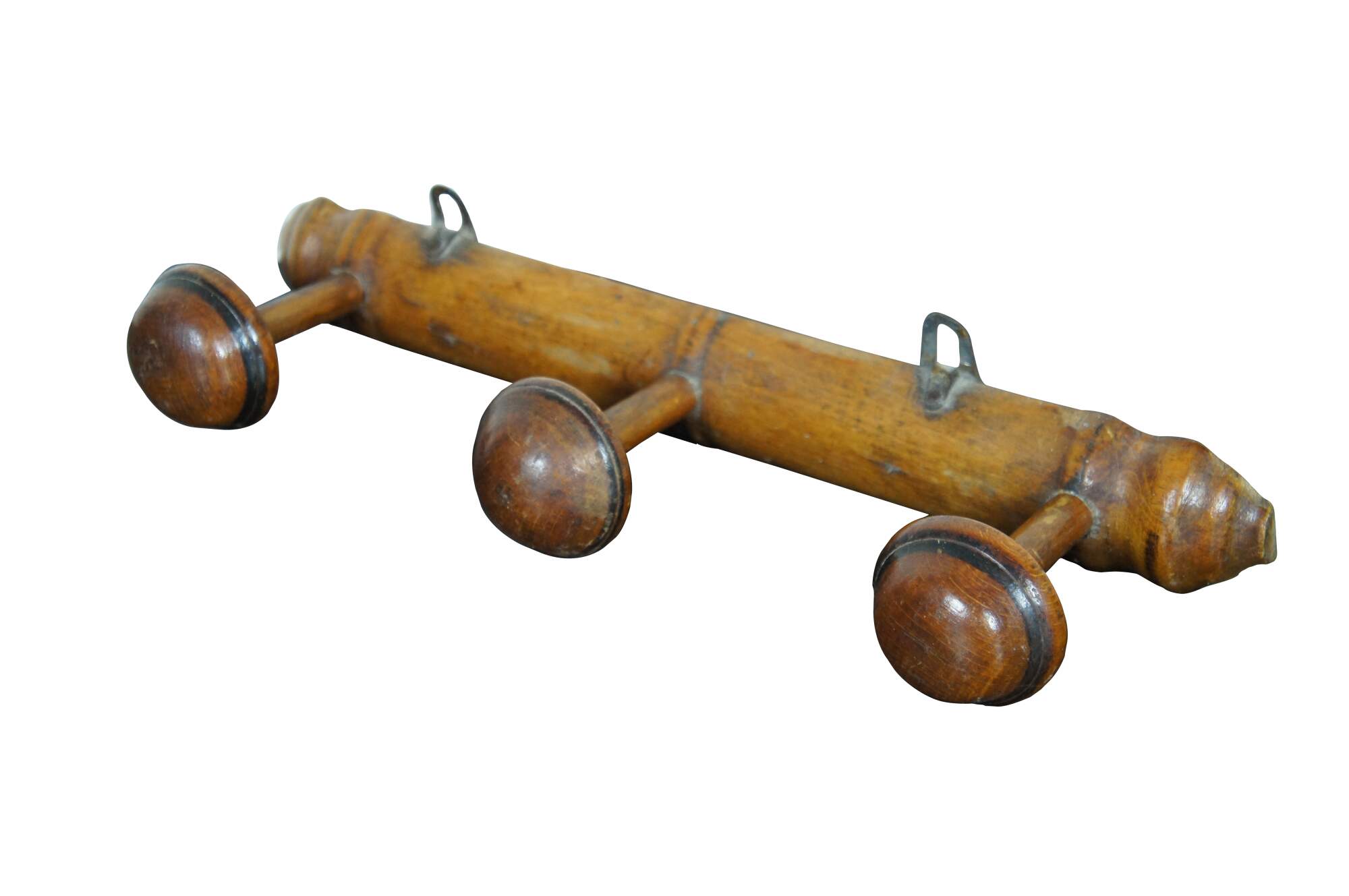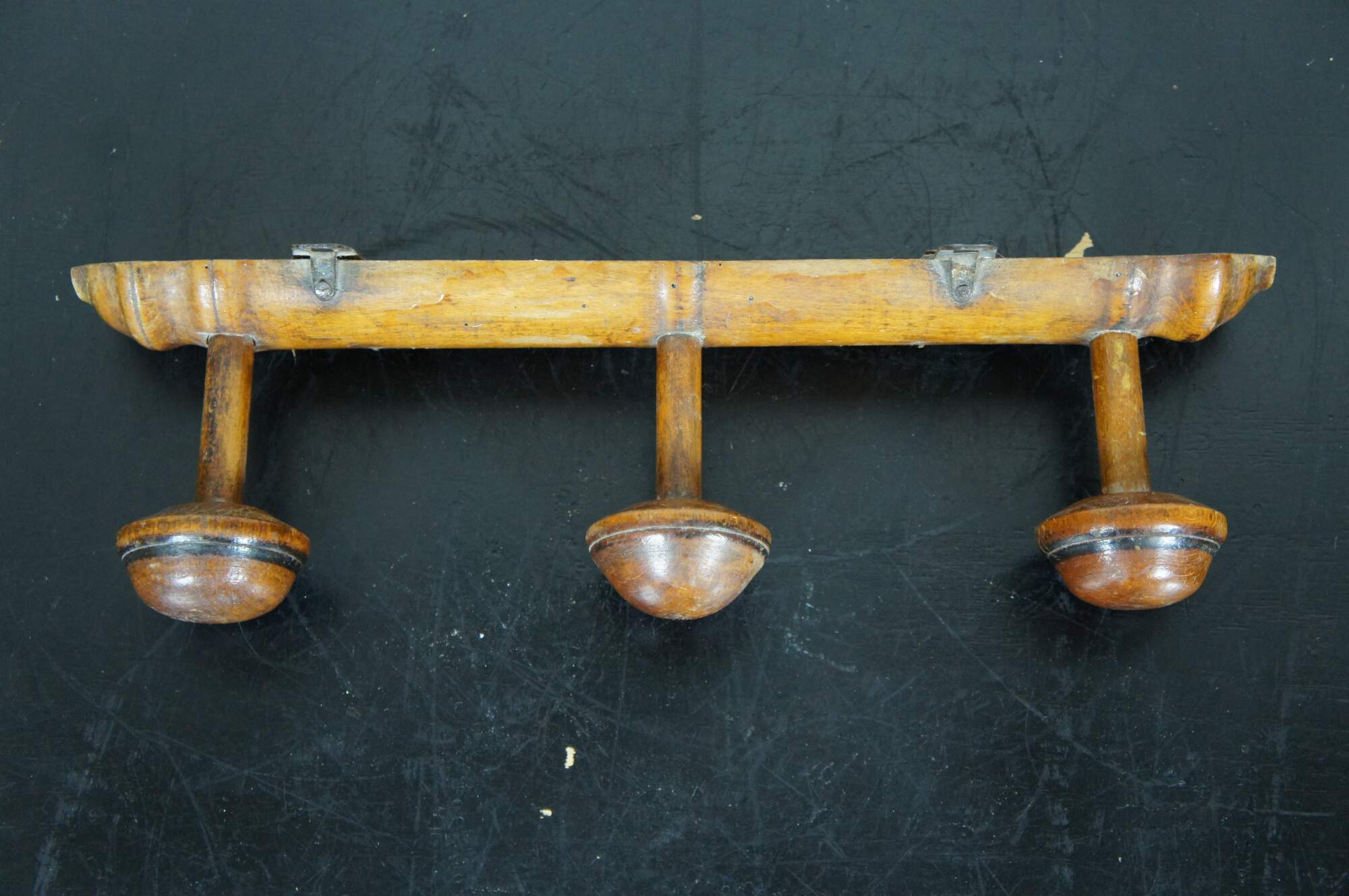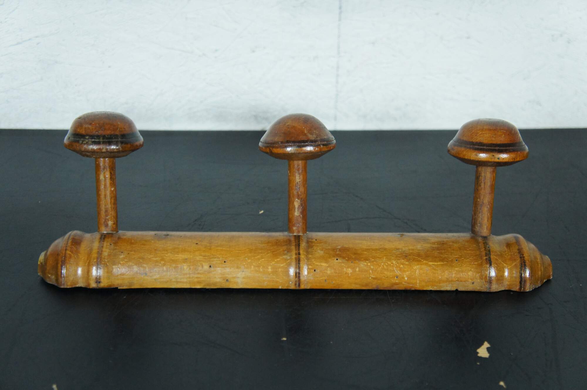Early to mid 20th century French country / rustic wooden coat hanging rack - half round turned bar with three mushroom shaped knobs / hooks.