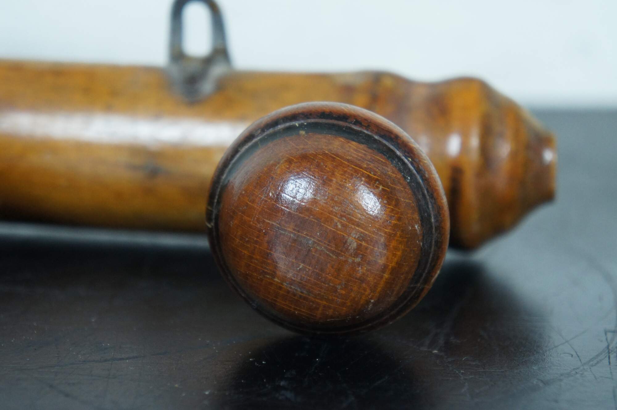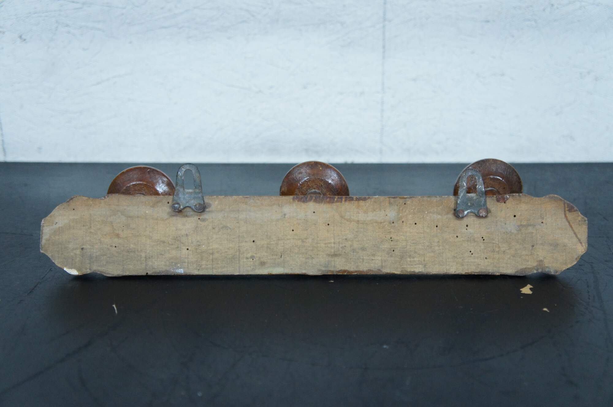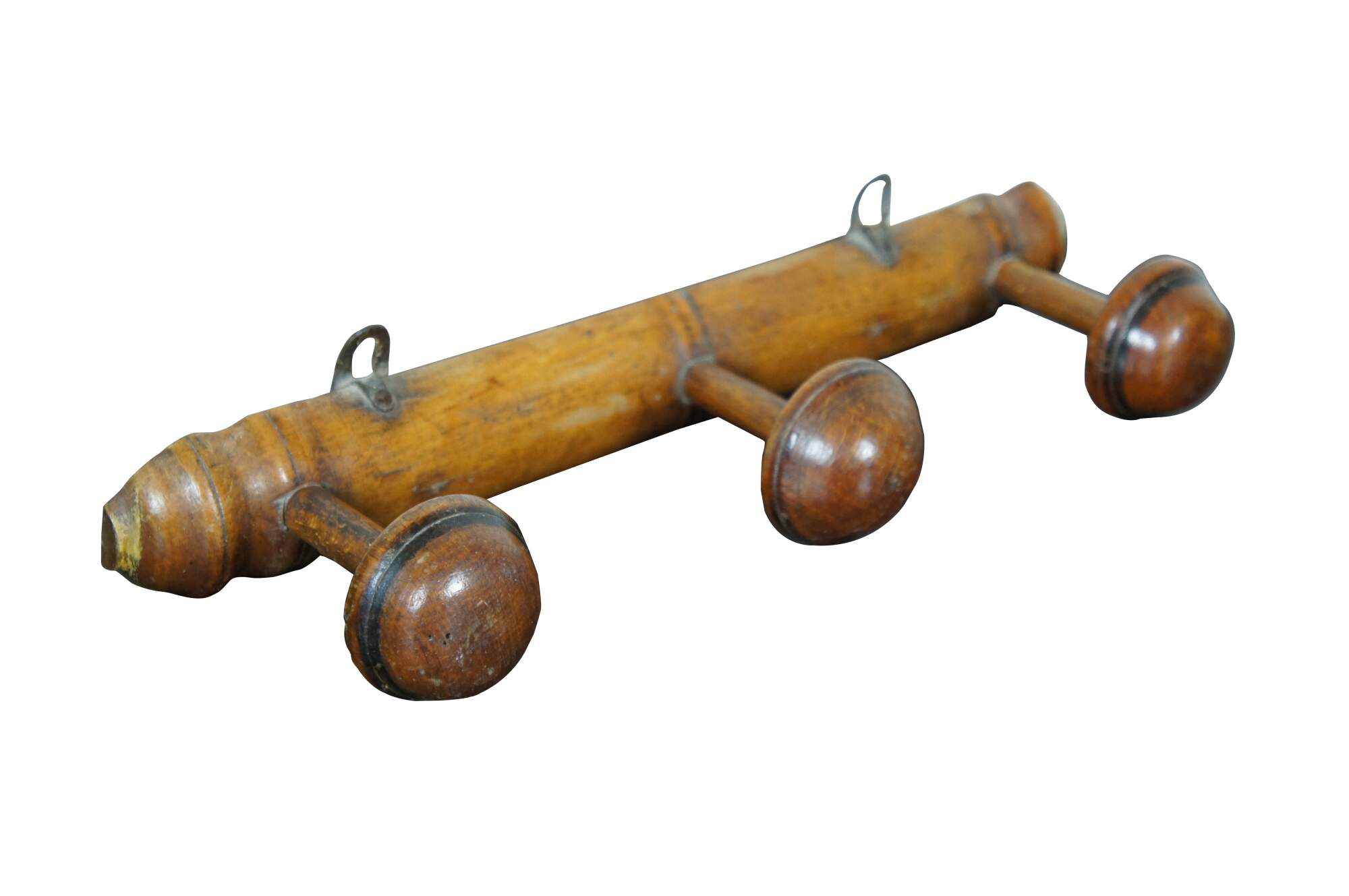 Early to mid 20th century French country / rustic wooden coat hanging rack - half round turned bar with three mushroom shaped knobs / hooks.