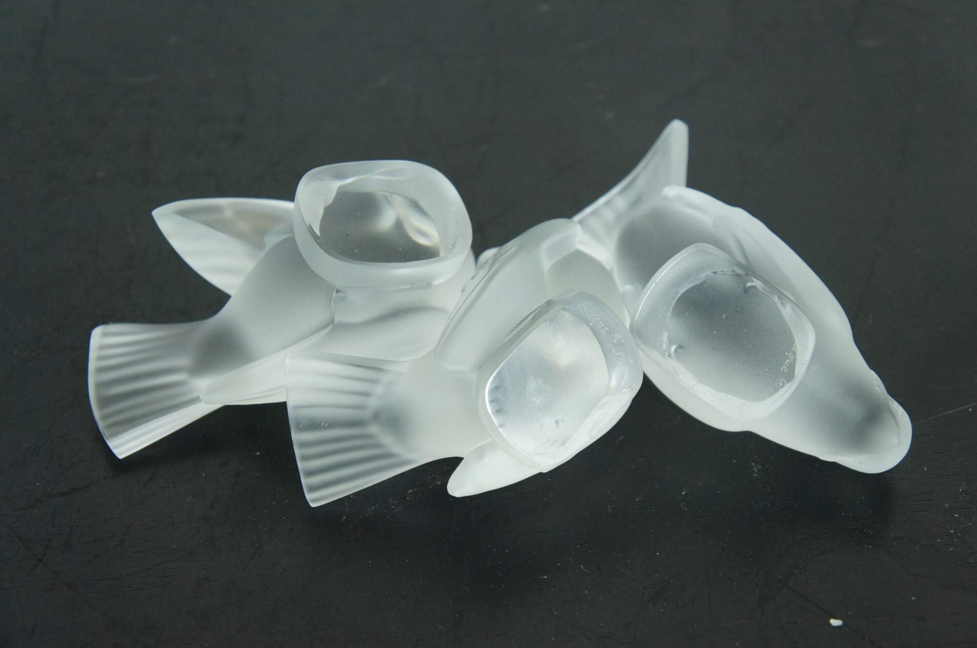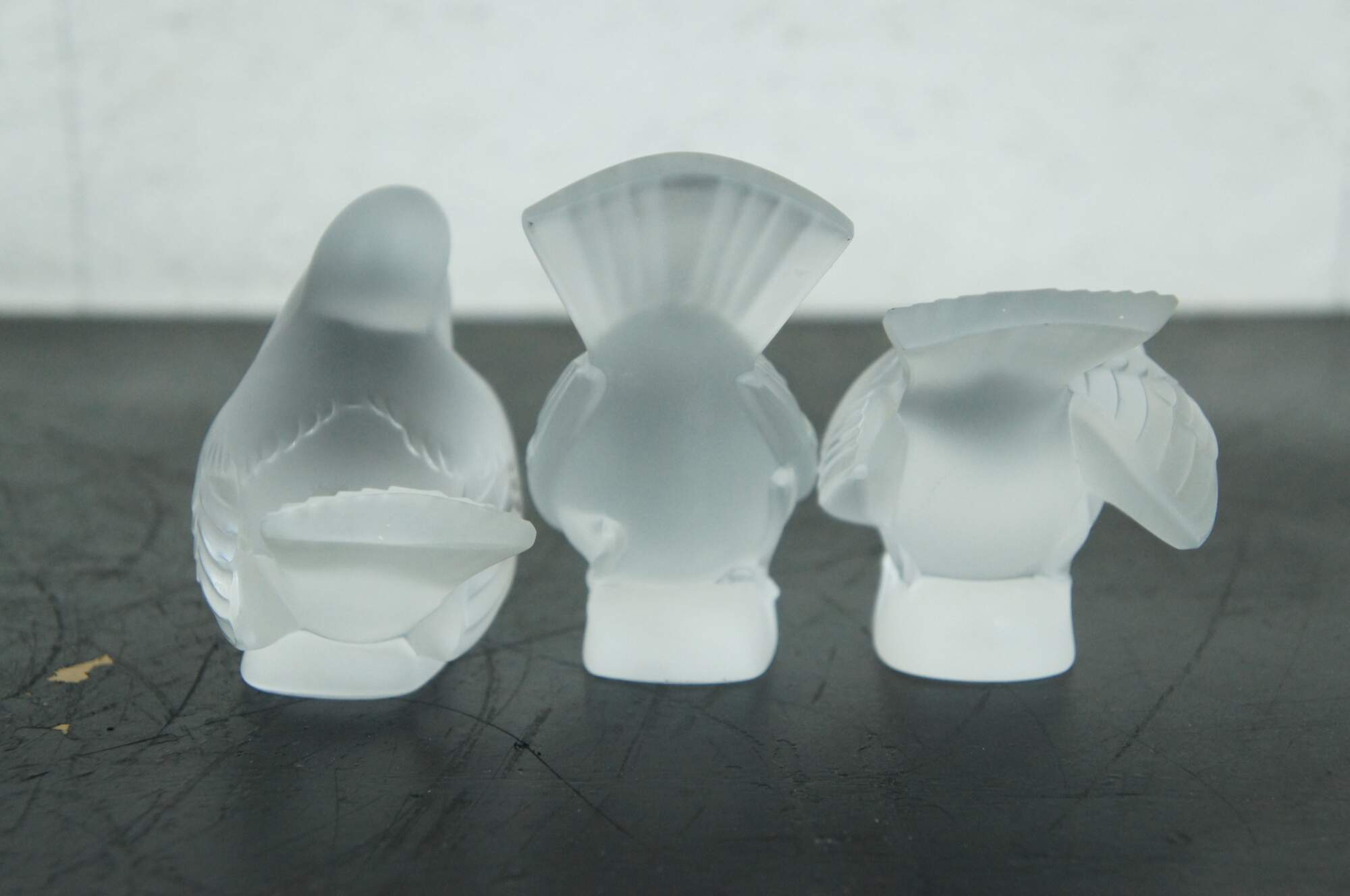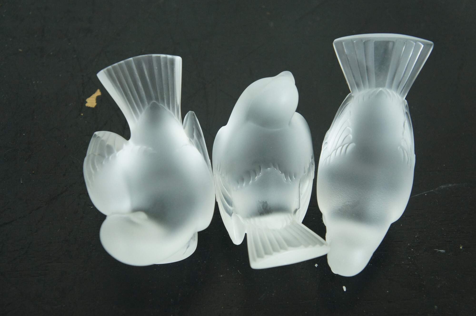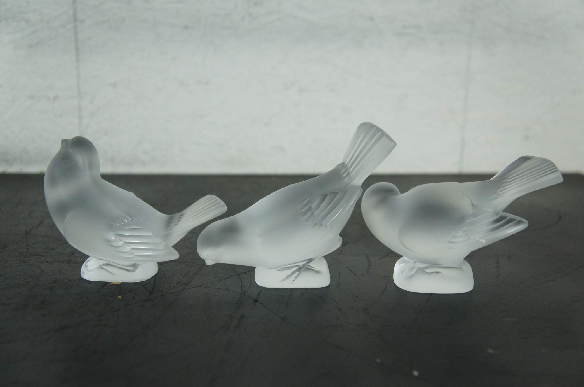 Set of three late 20th century Lalique frosted / satin crystal Moineaux (Sparrows), figurines or paperweights in the shape of small birds in different poses. Set includes: Hardi (Bold - head down), Moquer (Mocking - head up), and Coquet (Coquettish - head under wing). Made in France. Signed on base.