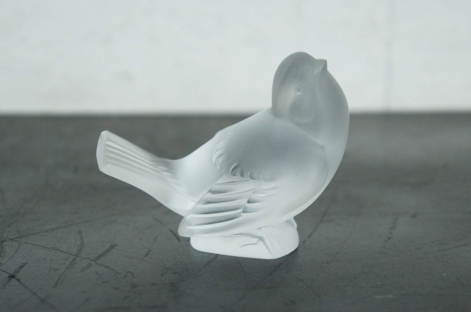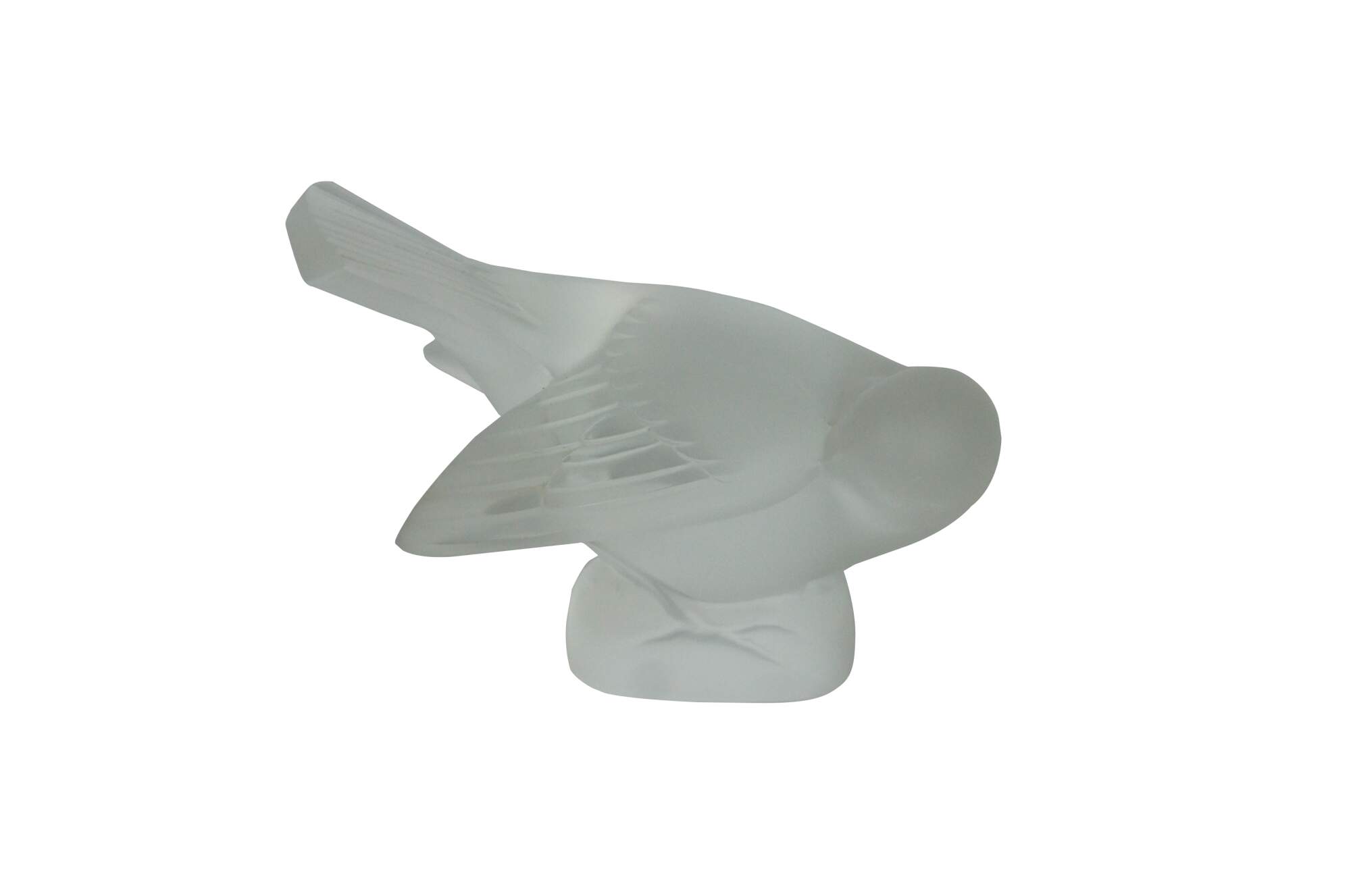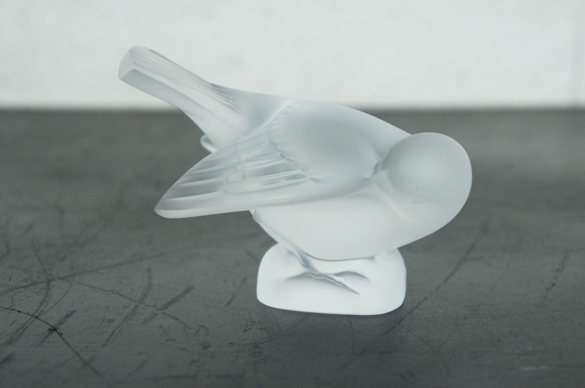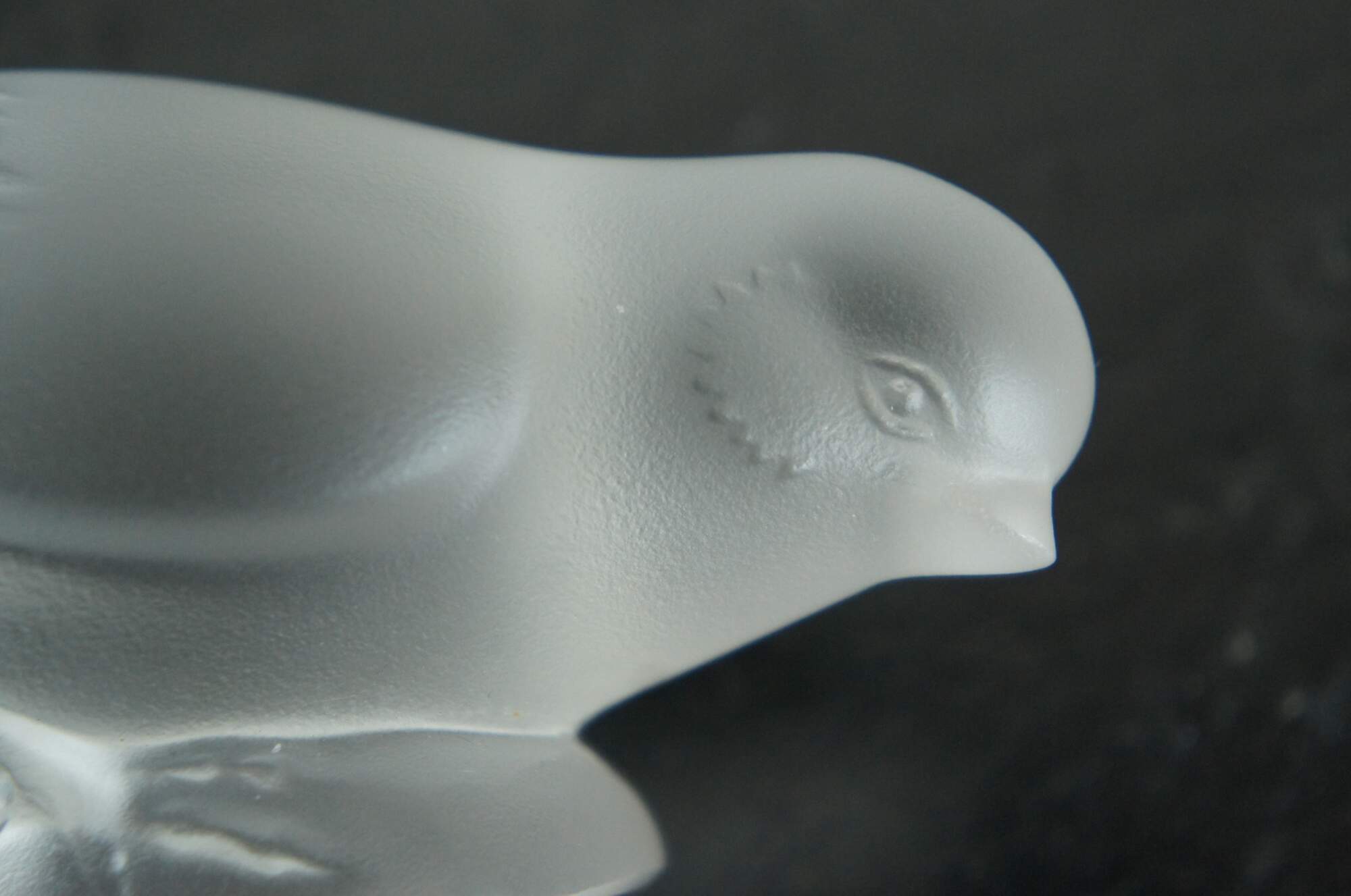 Set of three late 20th century Lalique frosted / satin crystal Moineaux (Sparrows), figurines or paperweights in the shape of small birds in different poses. Set includes: Hardi (Bold - head down), Moquer (Mocking - head up), and Coquet (Coquettish - head under wing). Made in France. Signed on base.