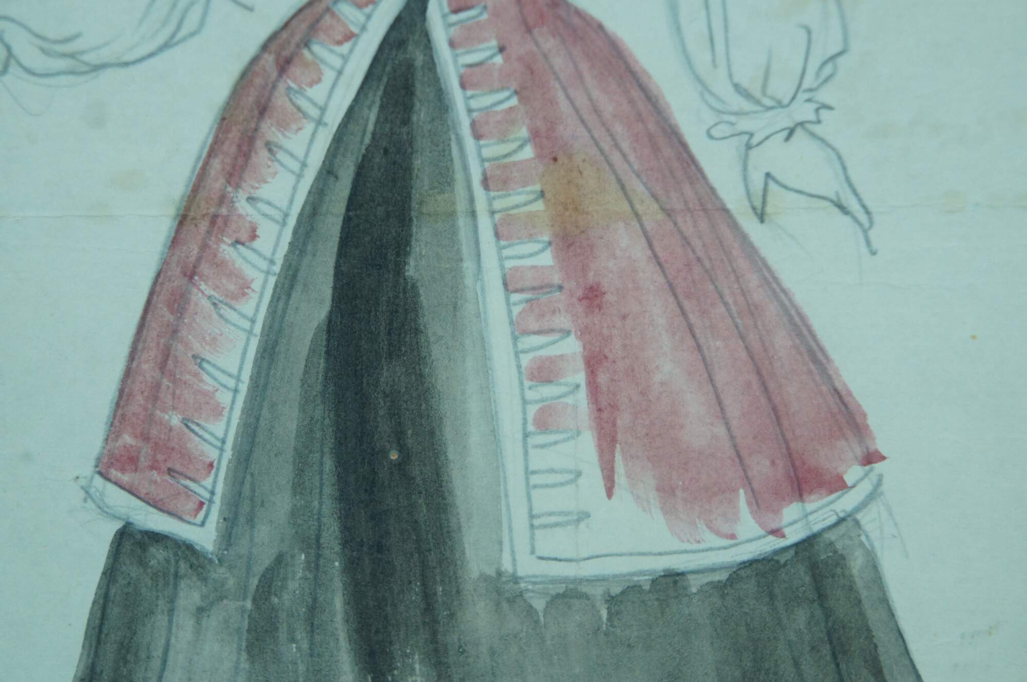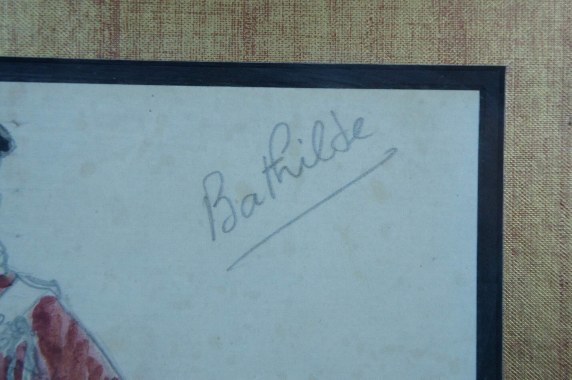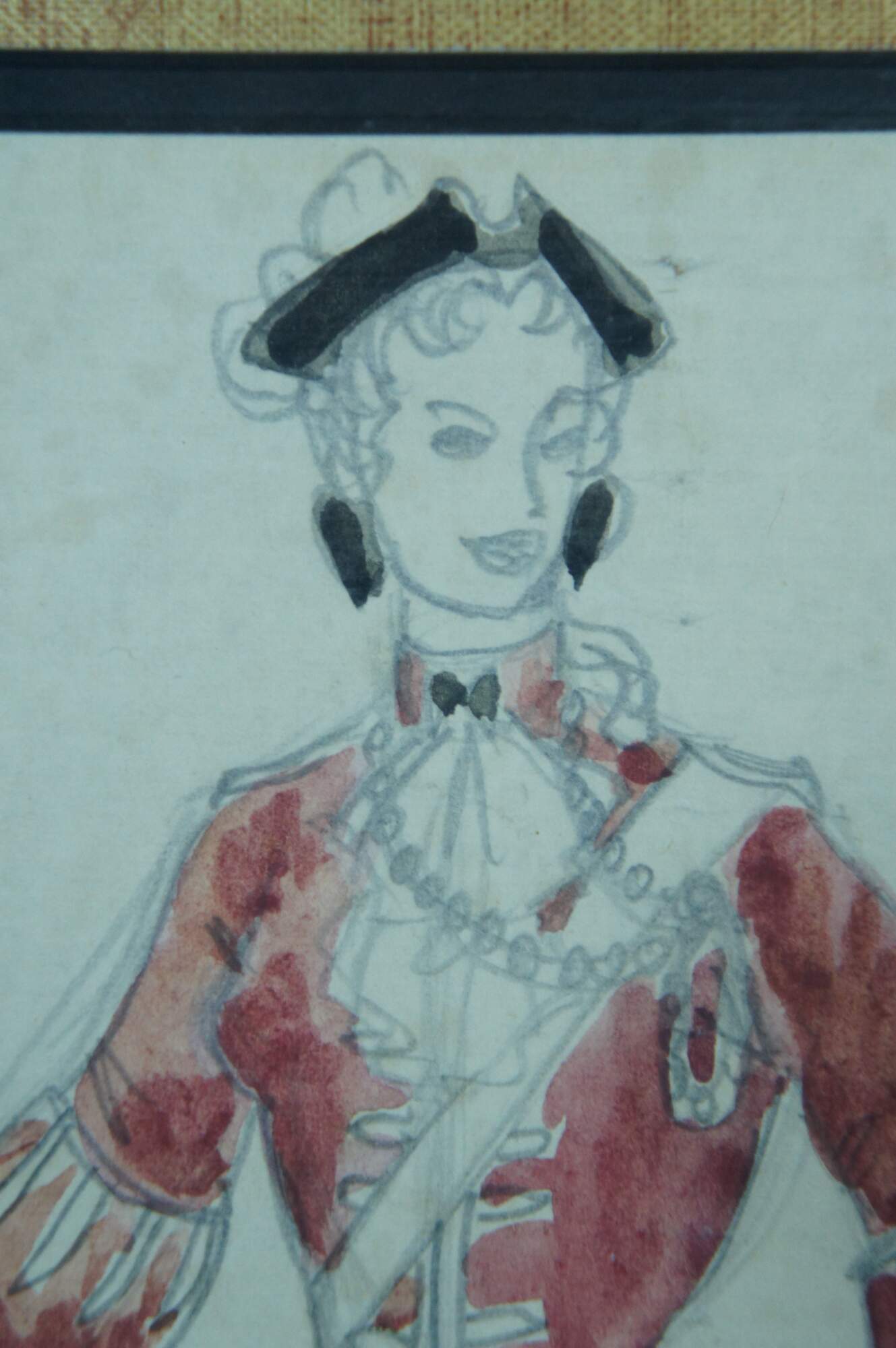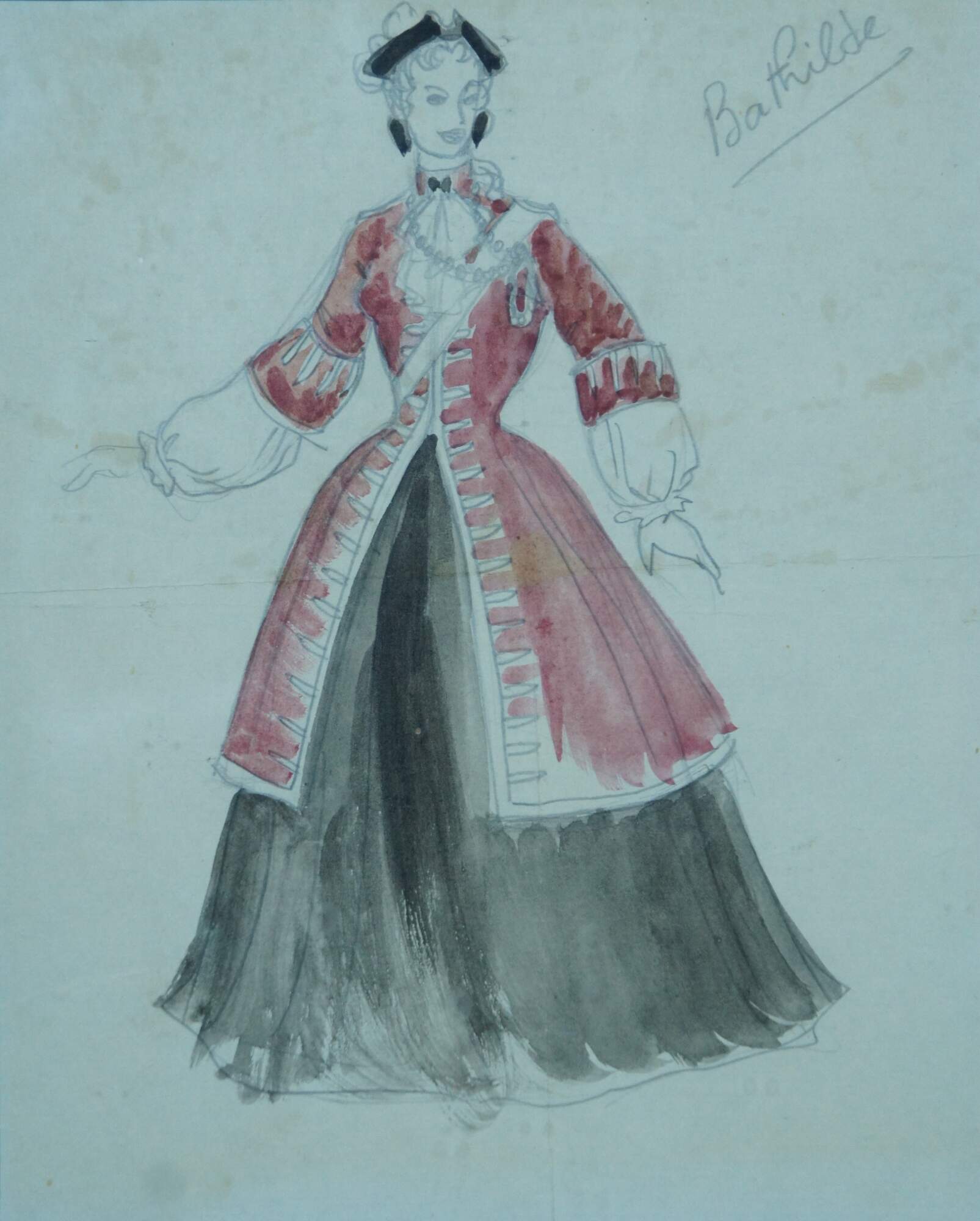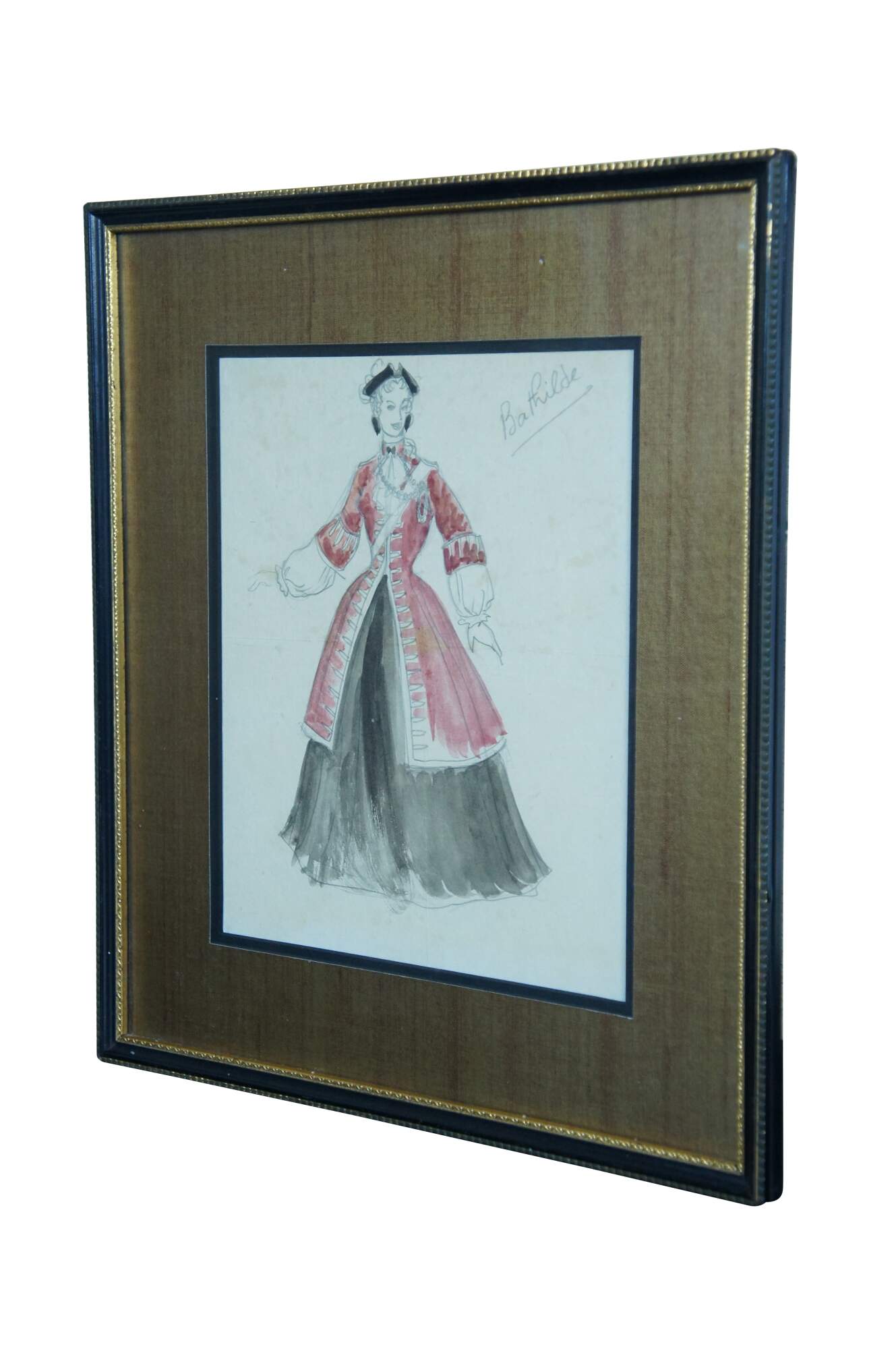 Vintage character sketch for a theatrical costume, showing a female figure in a 19th century interpretation of an 18th century pirate captain. Labeled Bathilde in the upper right. Pencil and watercolor on paper. Black beveled frame with carved gilded trim; mottle beige / red fabric mat.