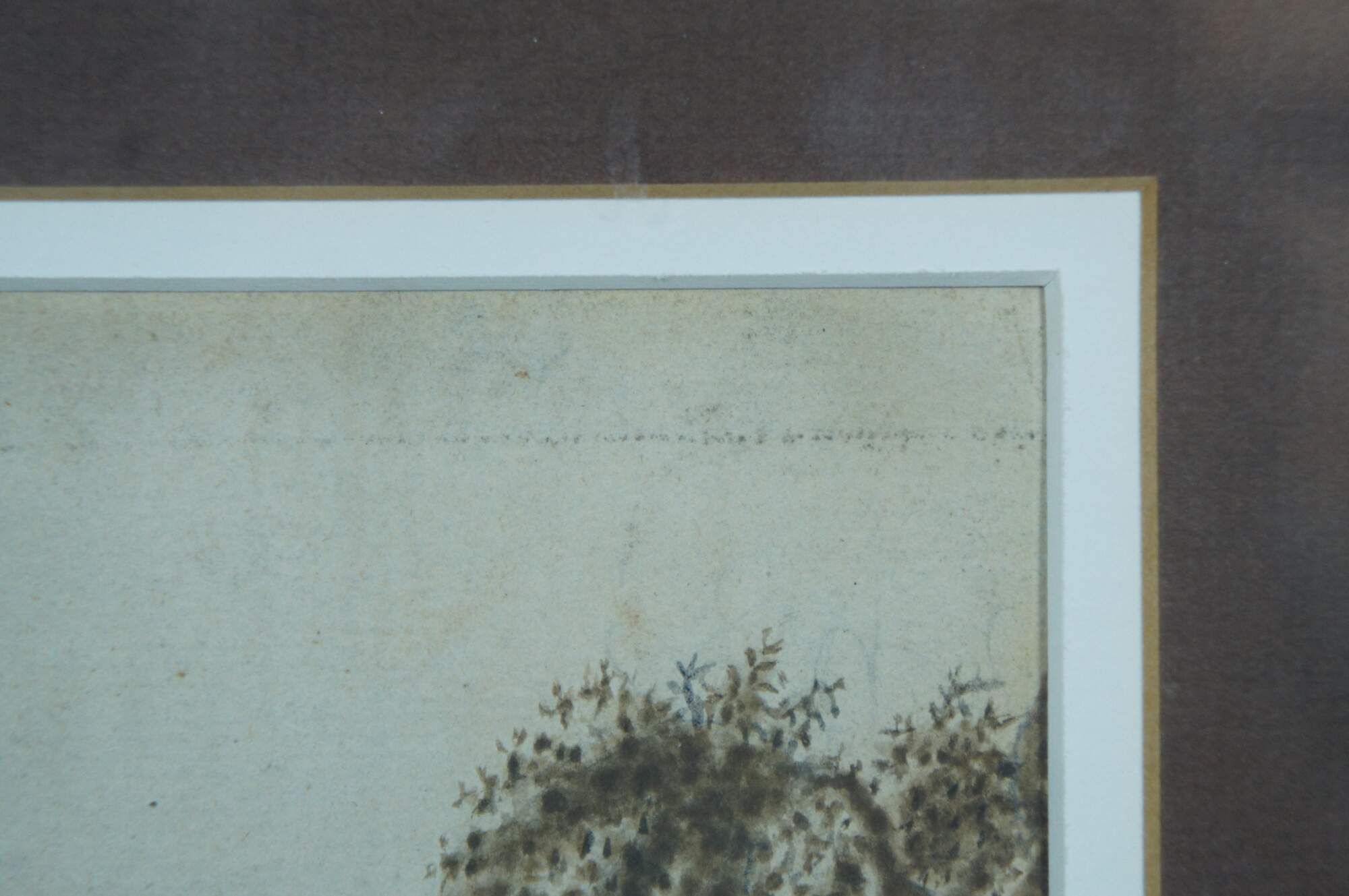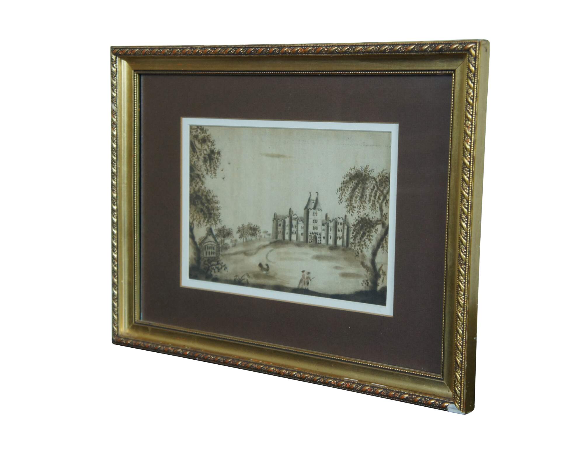 Antique late 18th century watercolor on paper landscape painting of "High Leigh, Cheshire, England" by A. Richmond, 1792. Shows a sepia toned landscape with a large manor house or castle on a hill, with trees, figures and a large dog. Beveled gilt wood frame with carved grapevine detail; brown and white layered mat.