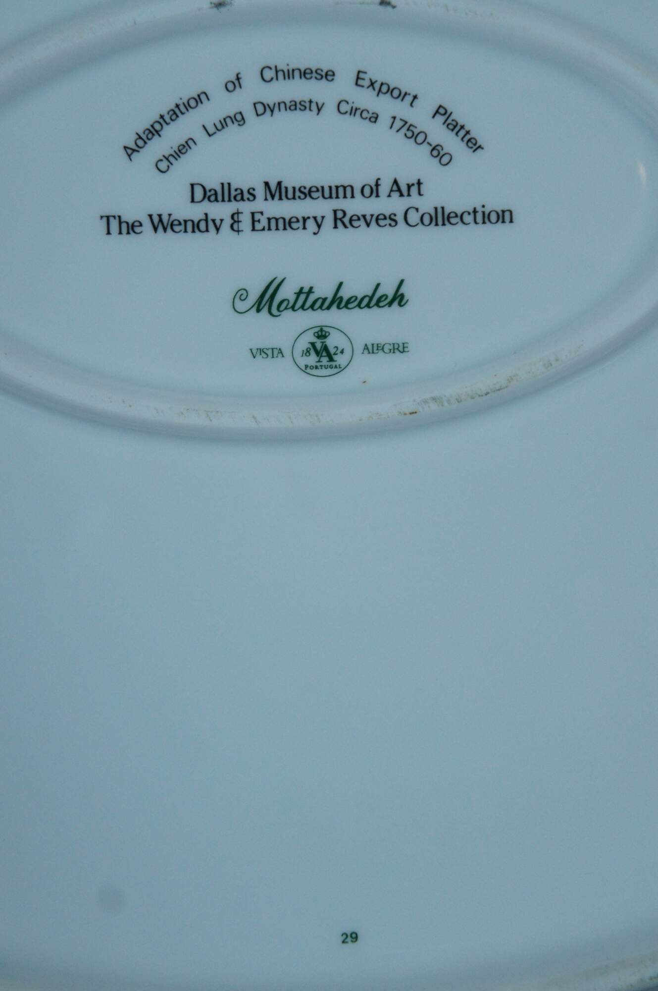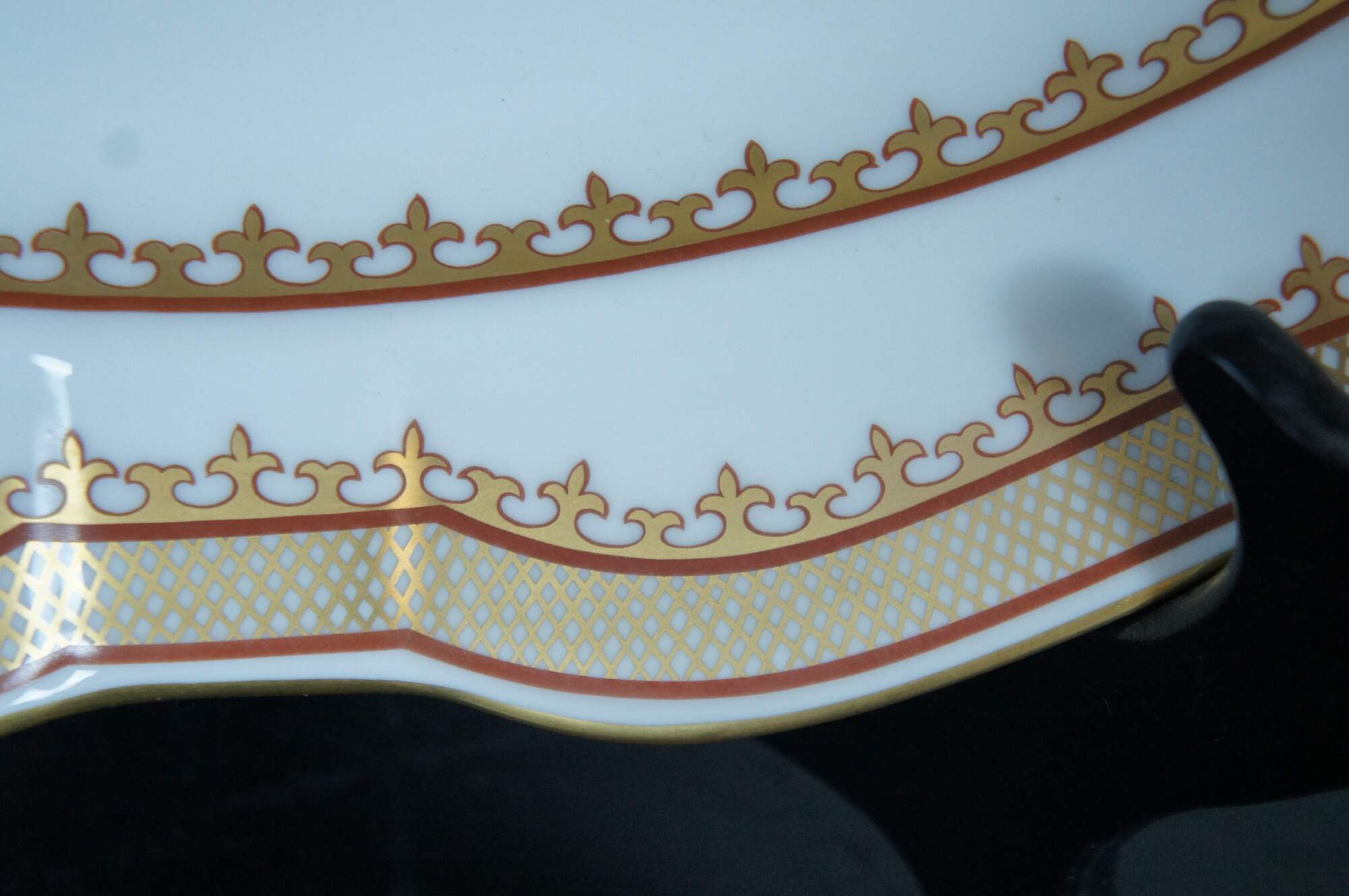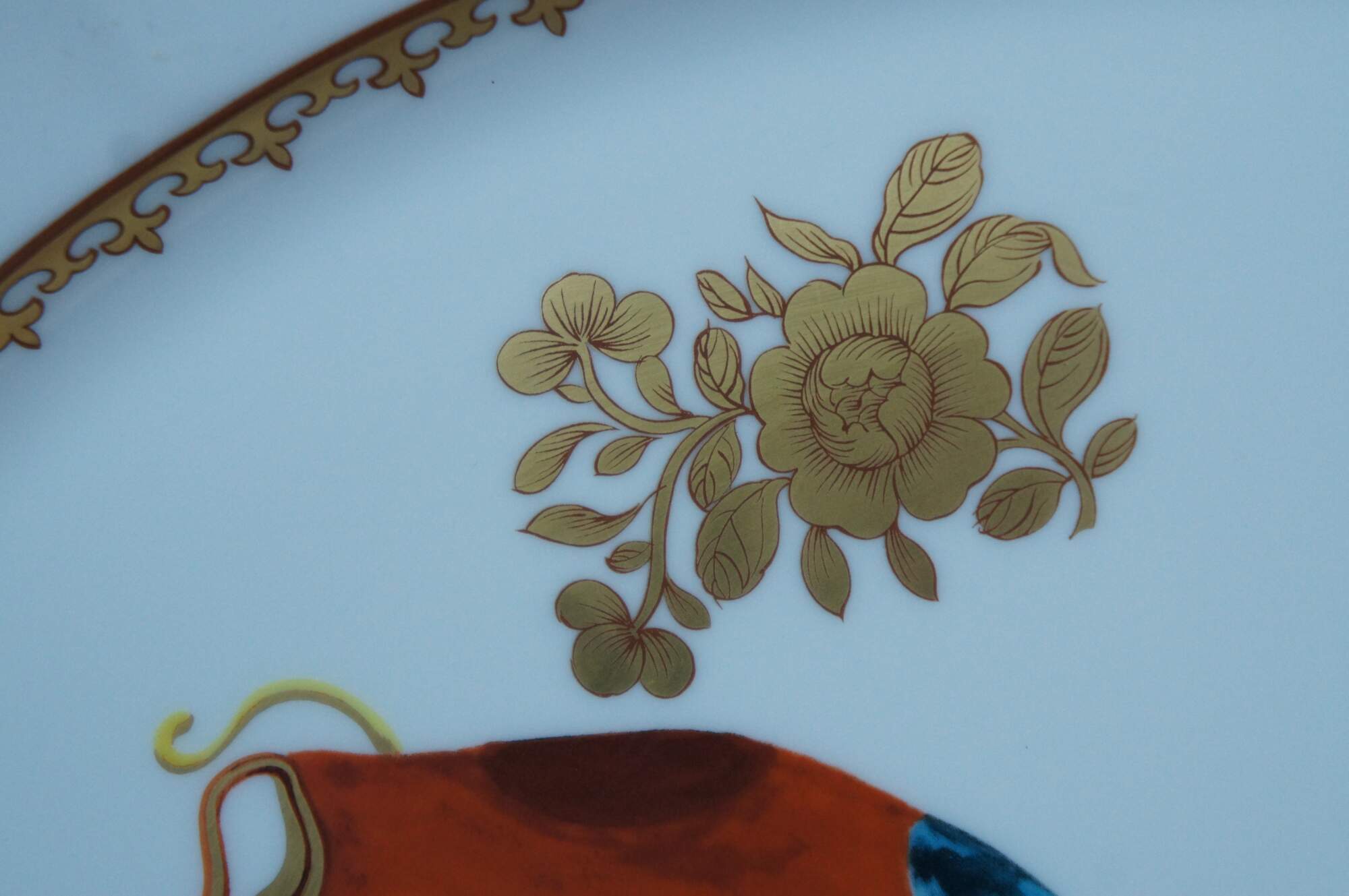 Large porcelain serving platter; oval with scalloped edges, painted / gilded border around gilt flowers and a brightly colored carp / koi / gold fish. "Adaptation of Chinese Export Platter - Chien Lung Dynasty Circa 1750-60 - Dallas Museum of Art - The Wendy & Emery Reves Collection." Produced by Mottahedeh and Vista Alegre. Includes folding wood stand for display.