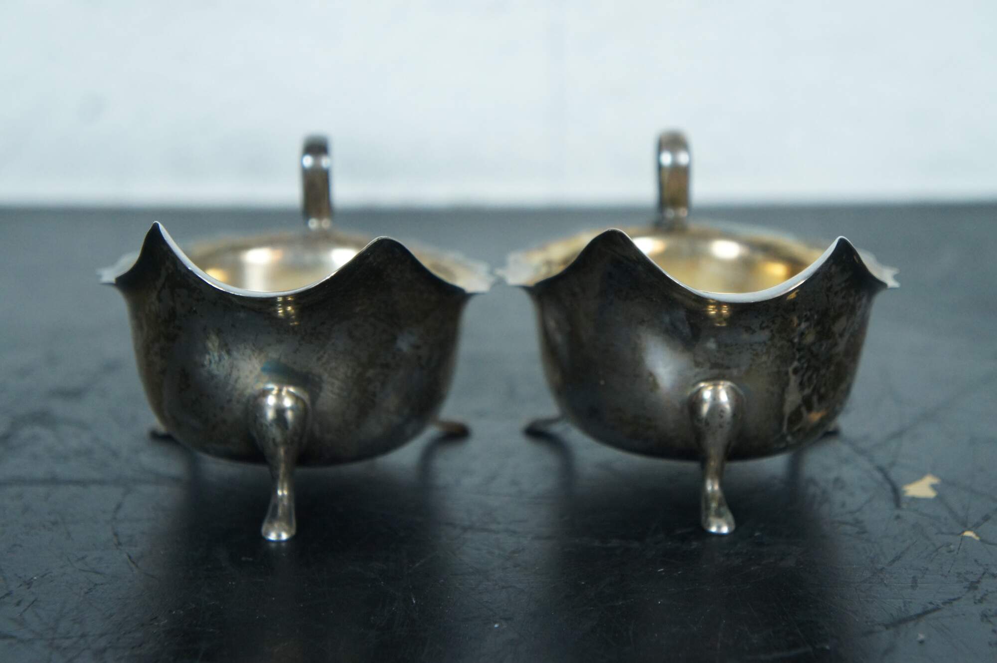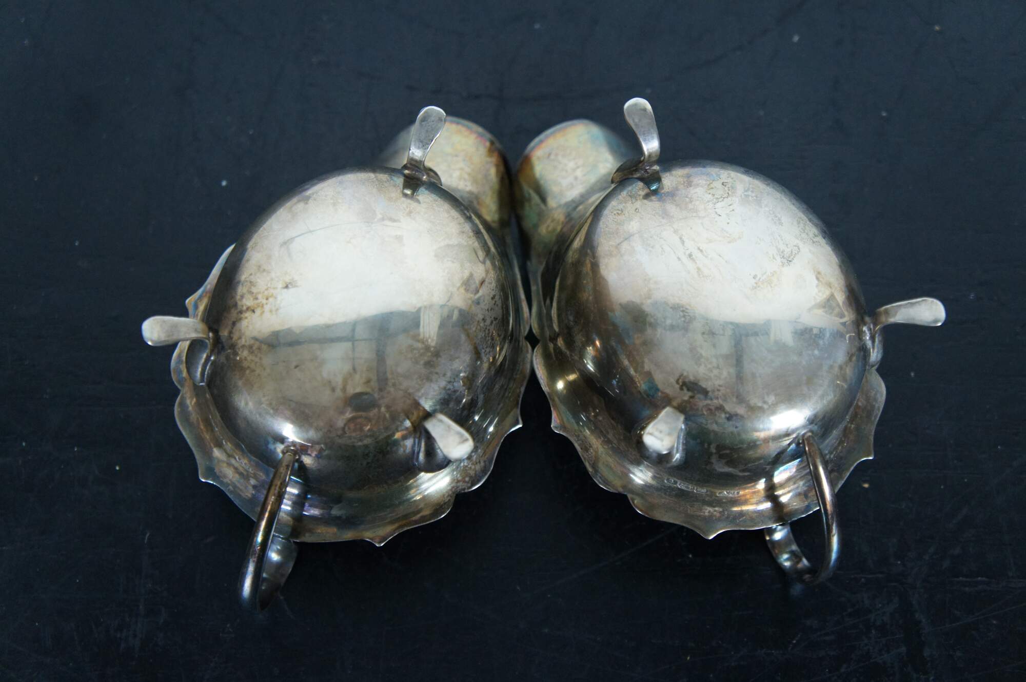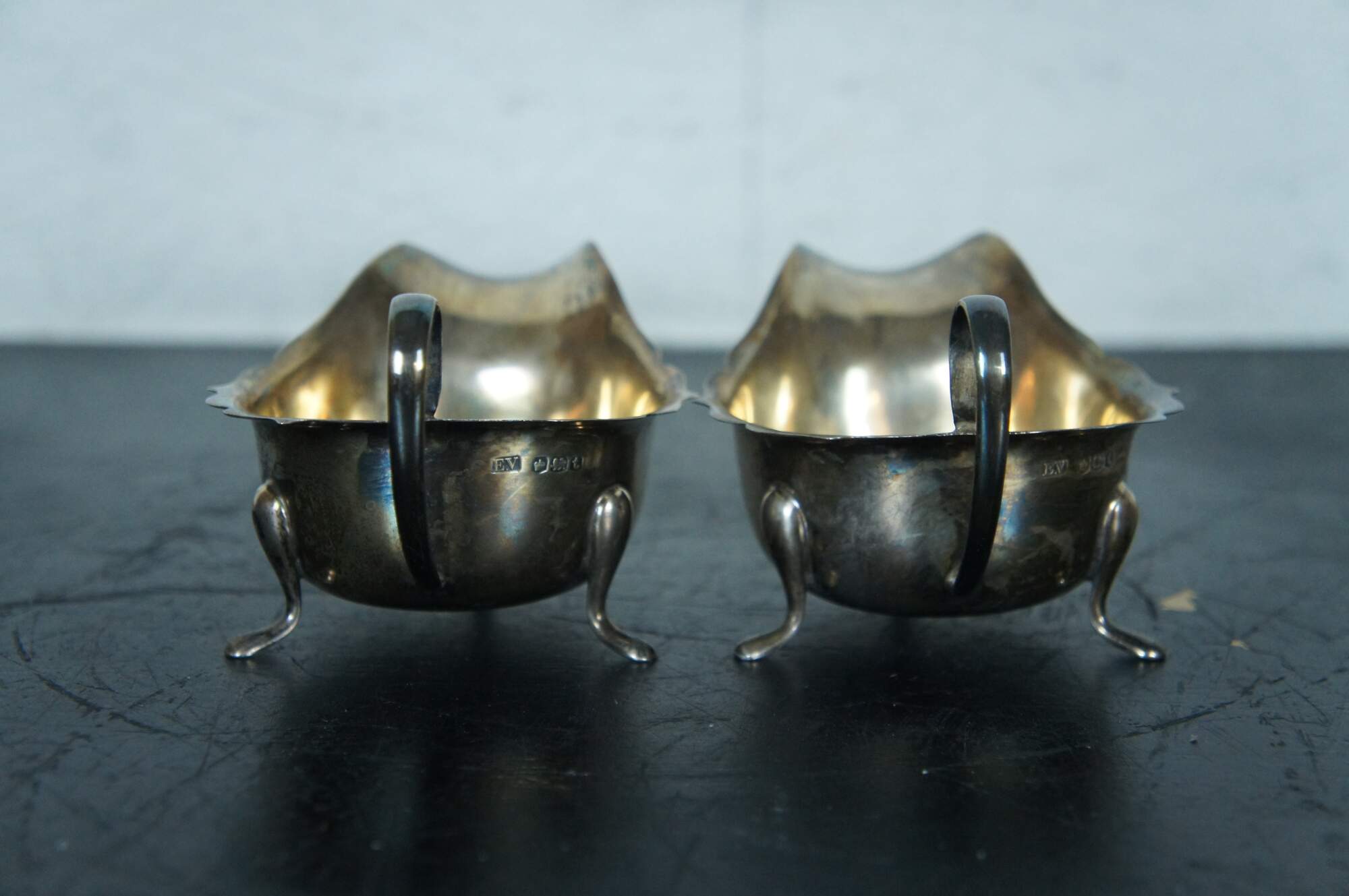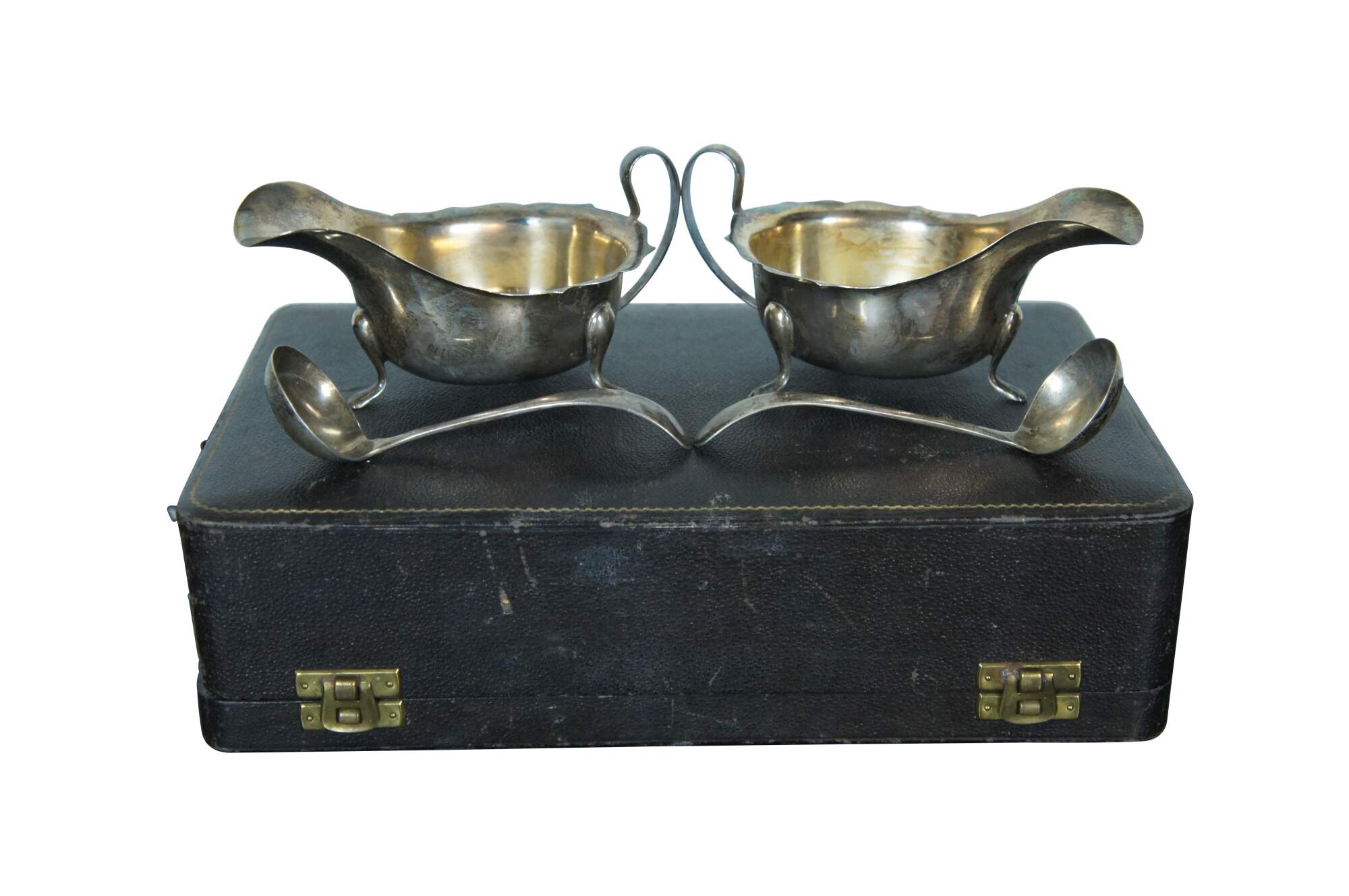 Antique 1936 four piece Sheffield sterling silver gravy boat and sauce ladle set by Edward Viners Ltd. Includes two gravy / sauce boats with pad feet and scalloped rims, two ladles, plus a storage case.