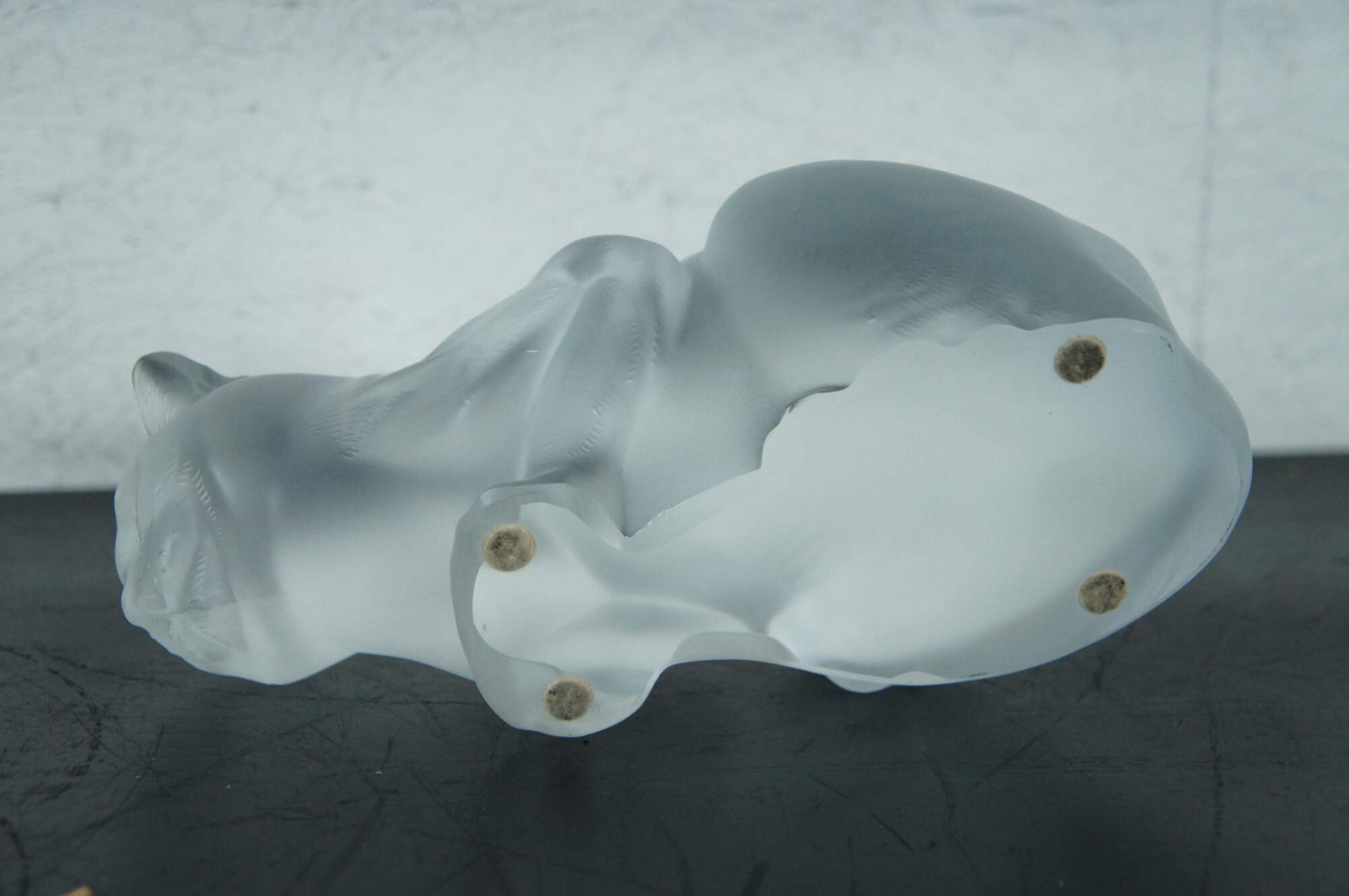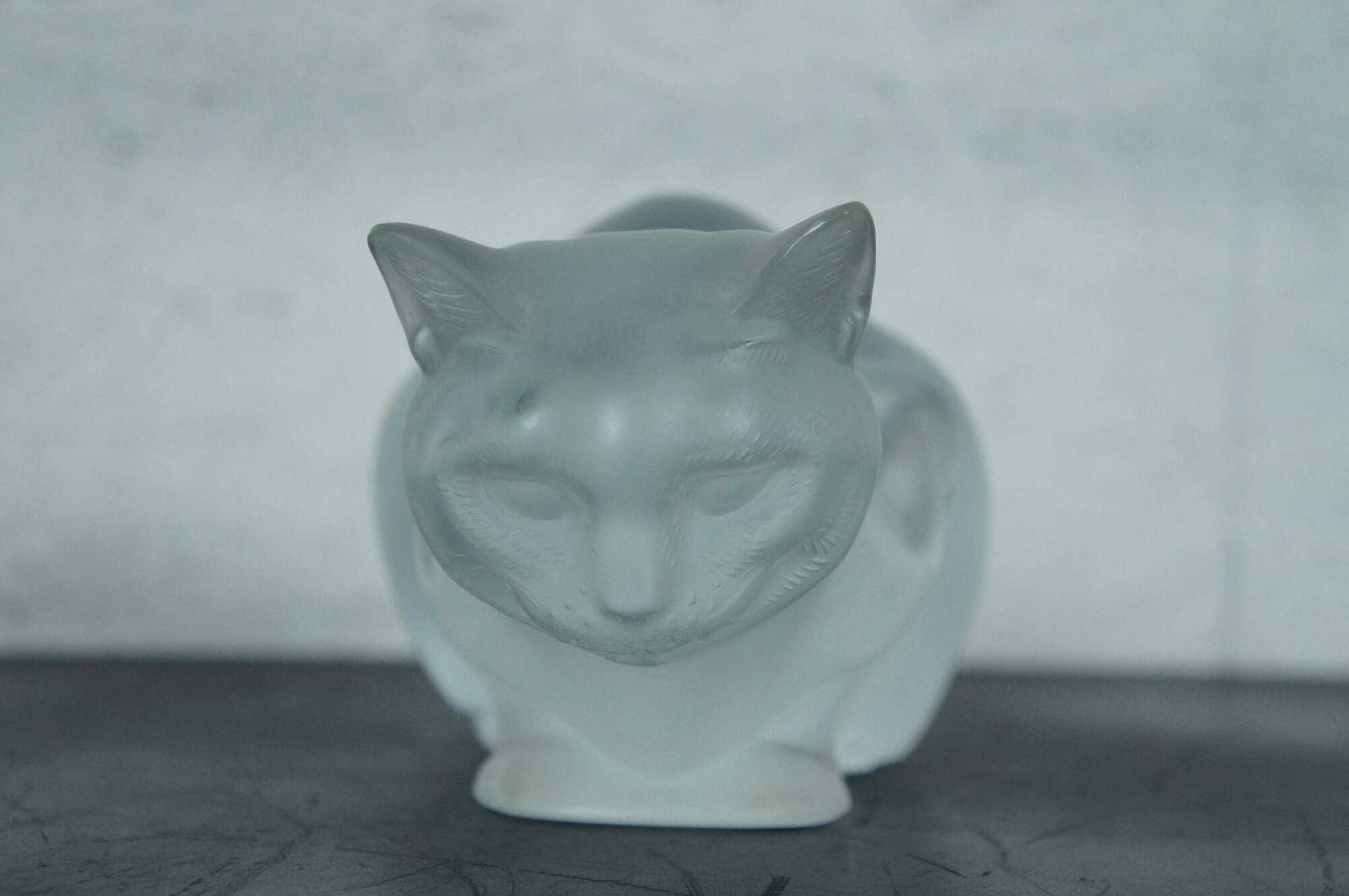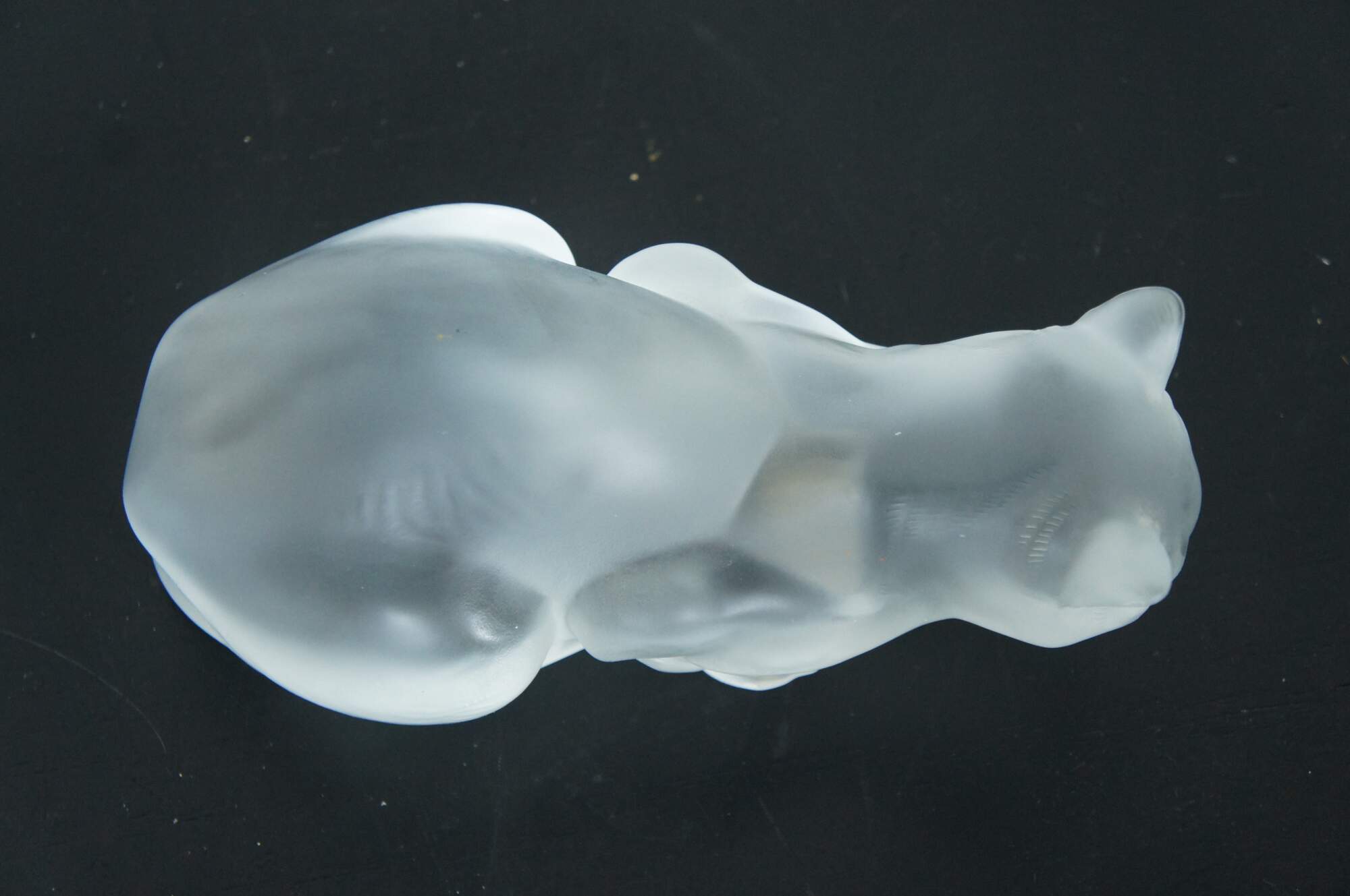 Late 20th century Lalique France frosted crystal figurine of chat crouche, a crouching cat. Signed on base.
