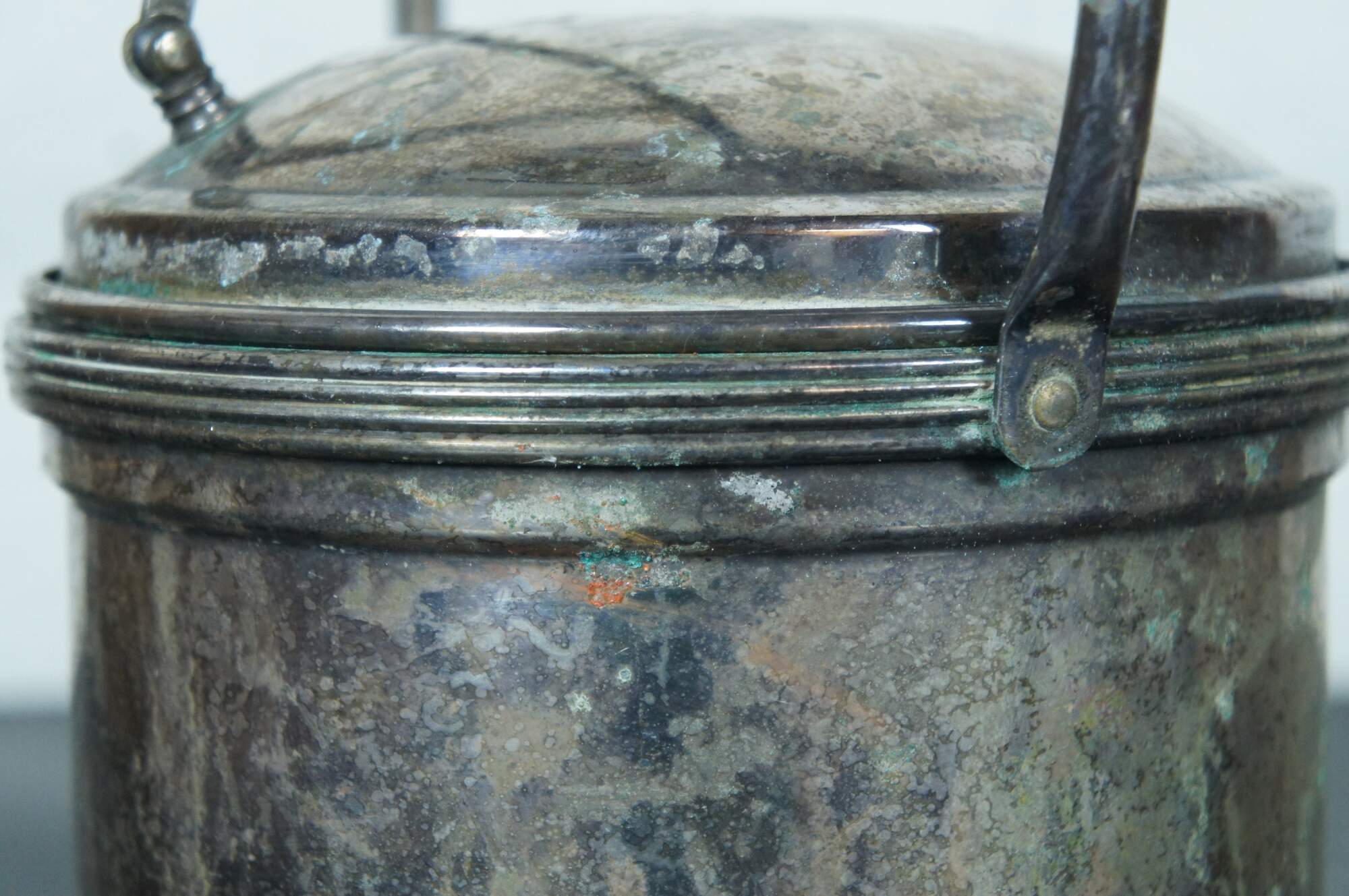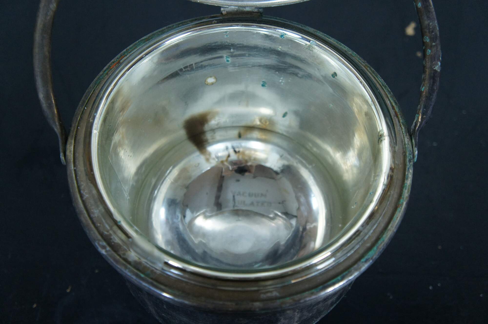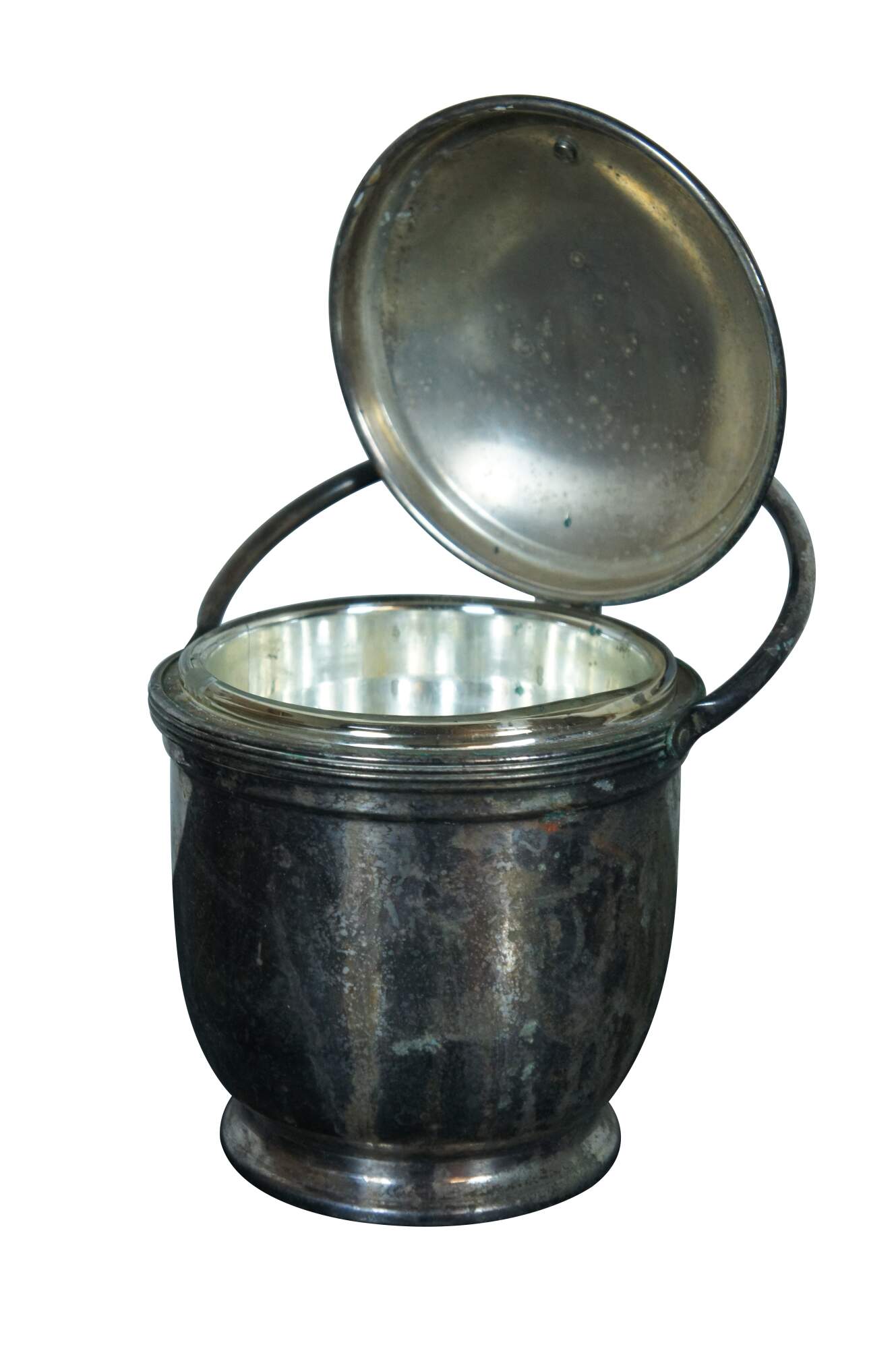 Early 20th century silver plate vacuum insulated ice bucket by Forbes Silver Company. Plain round design with simple art deco ridges around the rim; lid swivels open attached to handle.