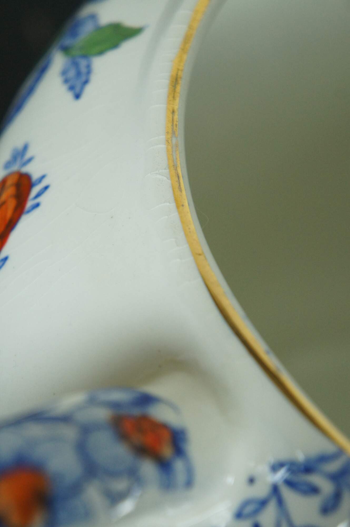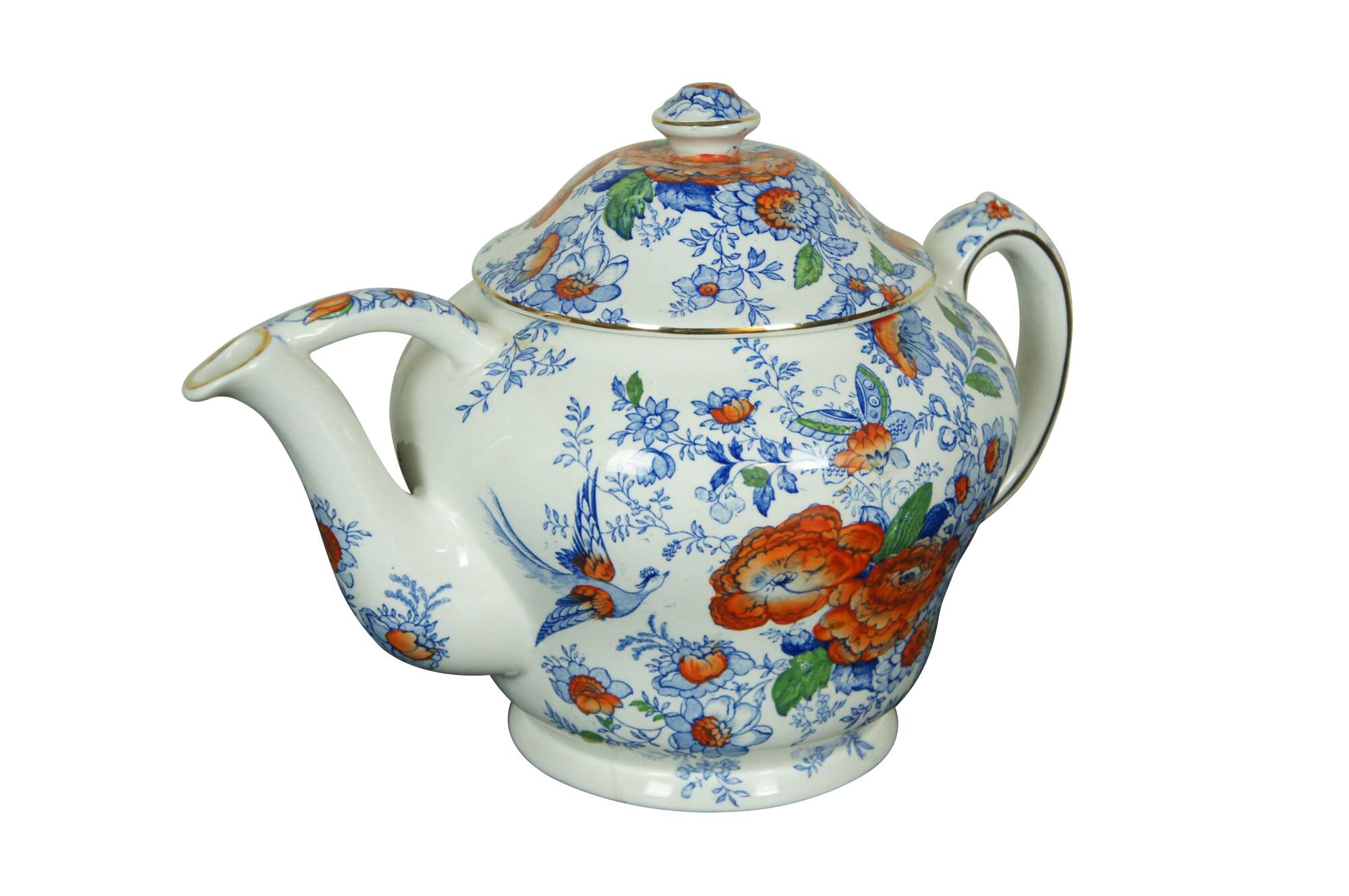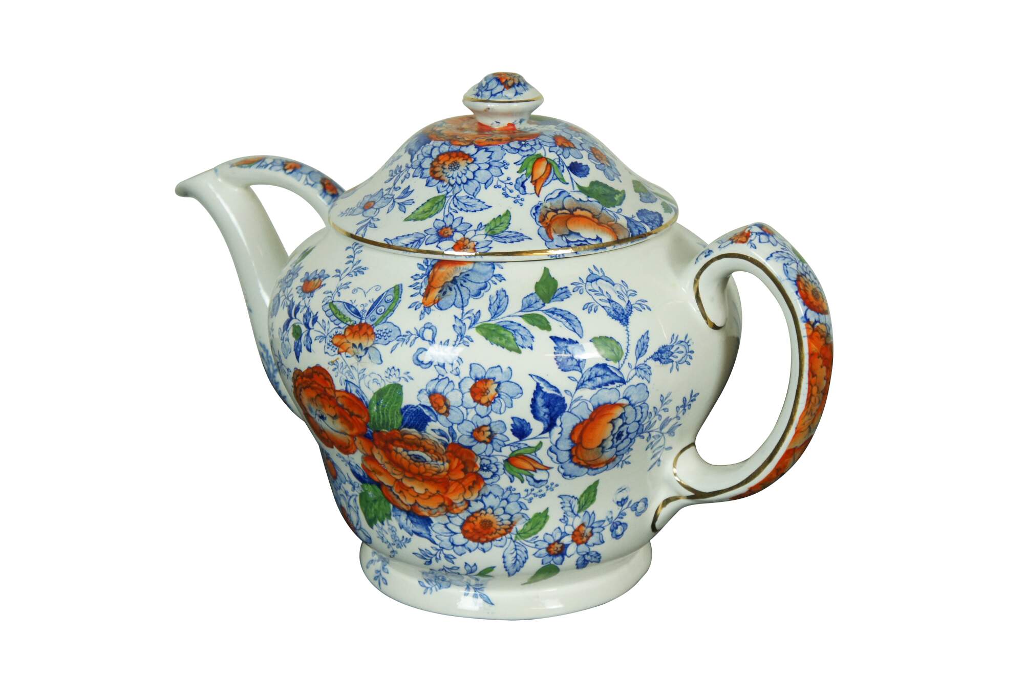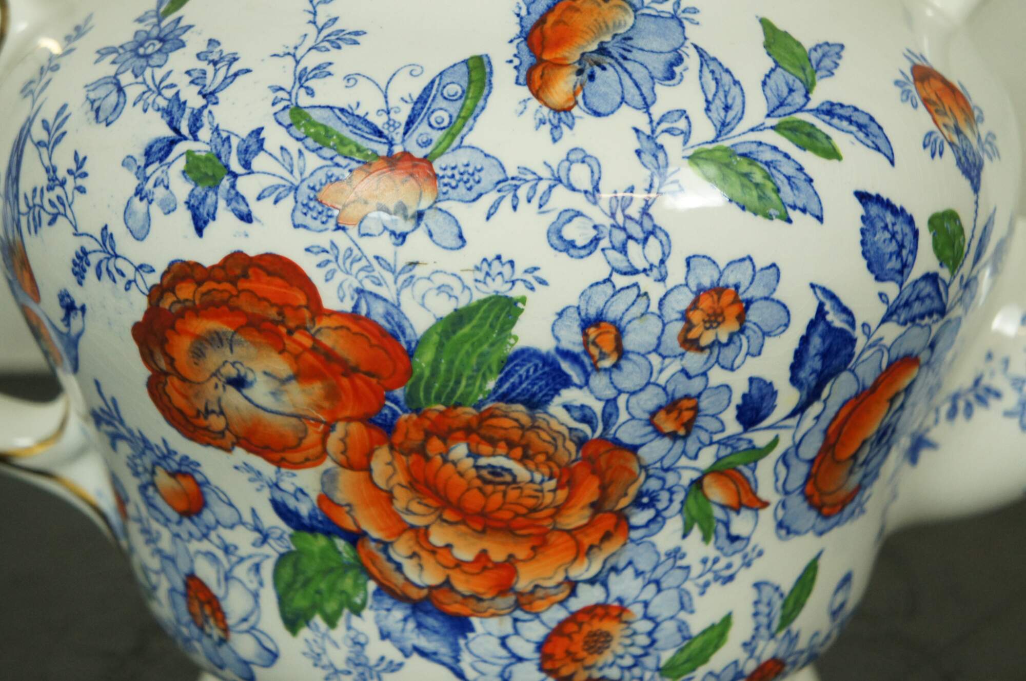 Early to mid 20th century oversized porcelain tranferware tea / coffee pot by Maling Pottery. Features a Chinoiserie design in blue and orange of flowers / chrysanthemums, birds, butterflies and gilded trim. Mark used circa 1920-1963.