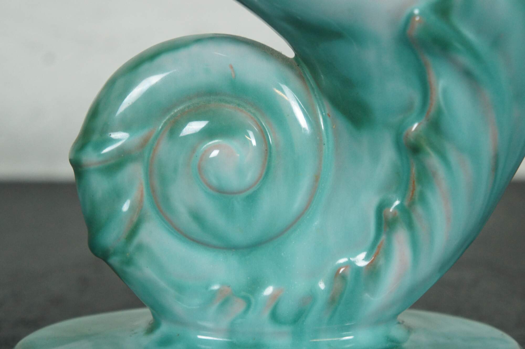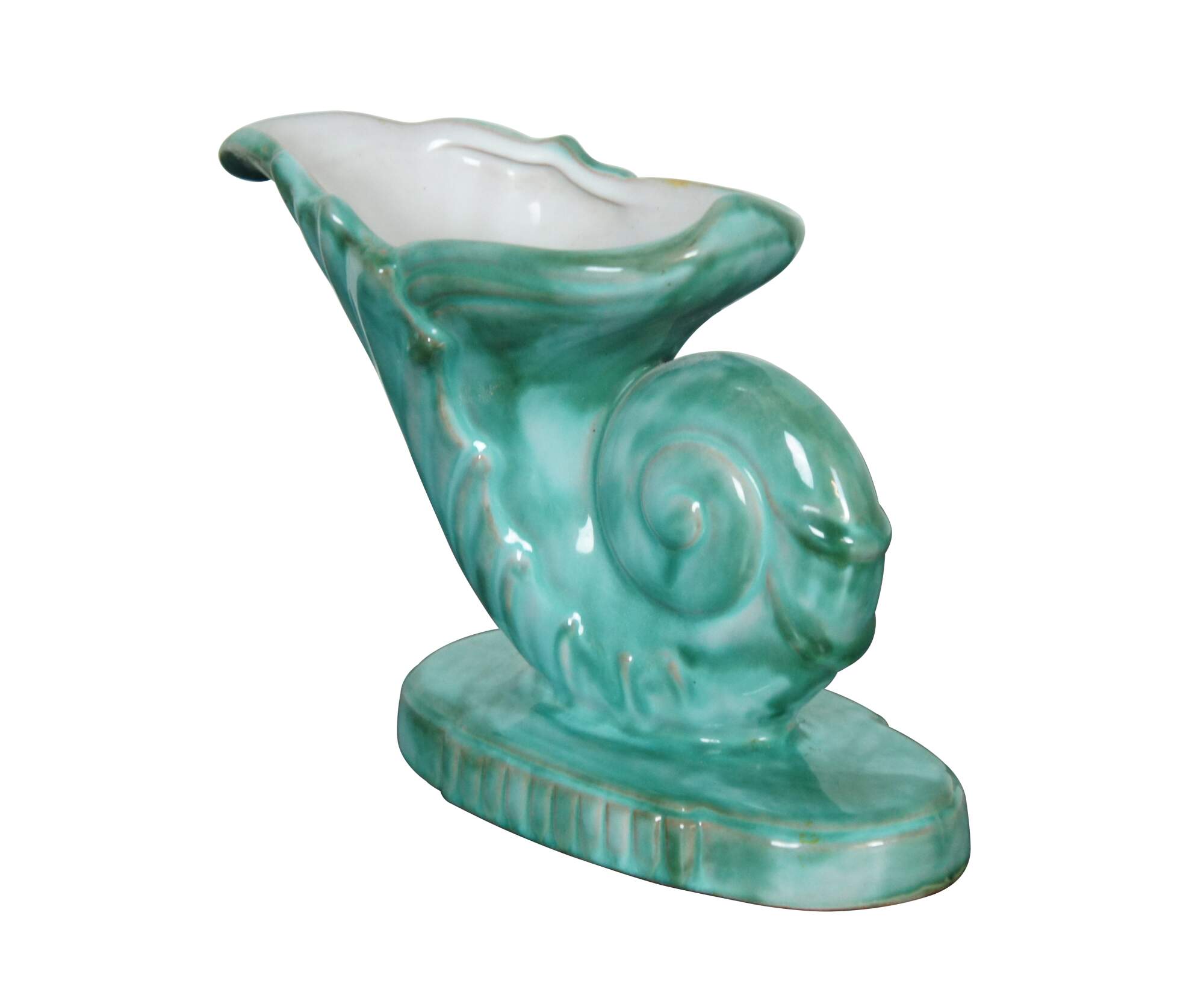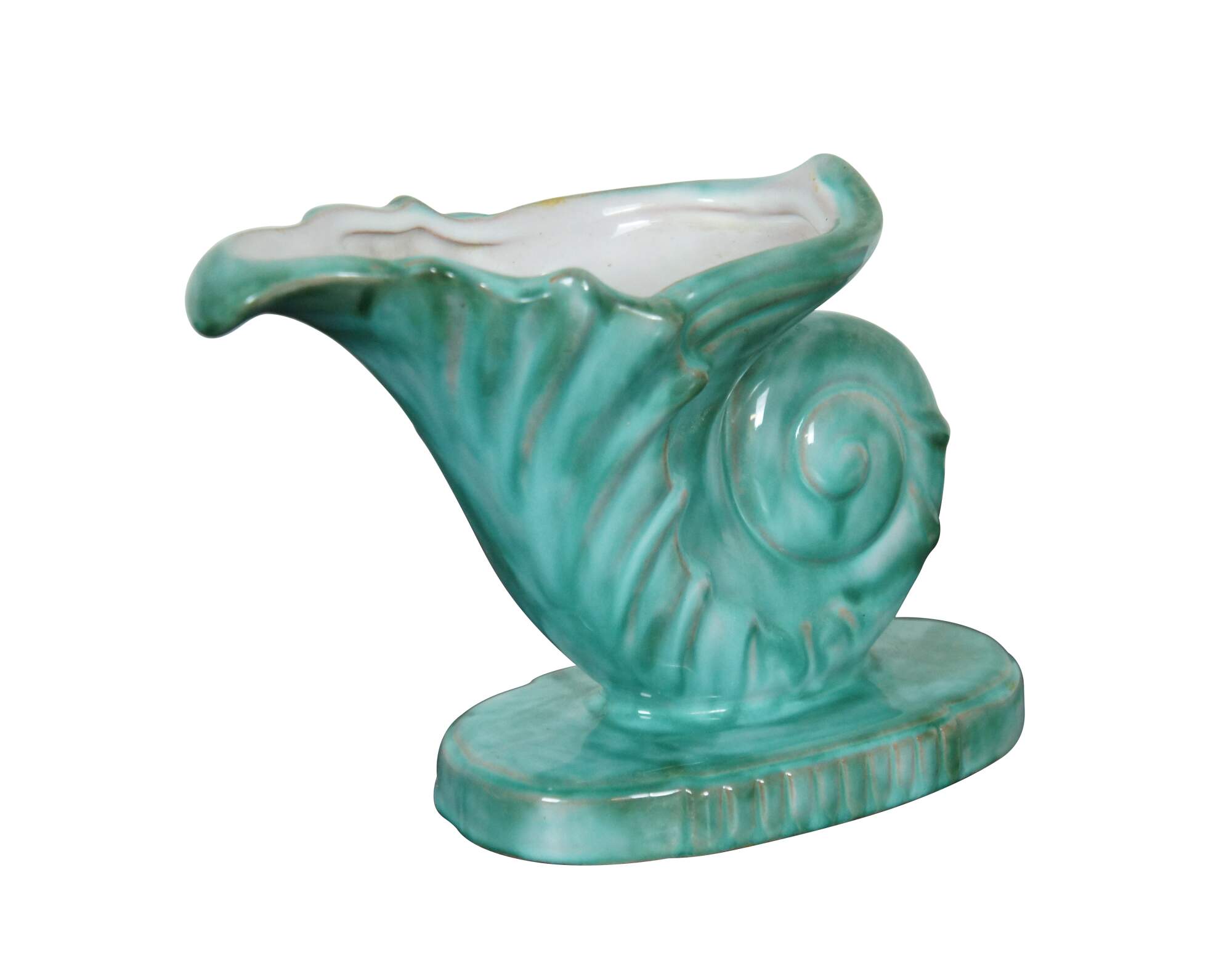Circa mid 20th century Stangl pottery vase number 2056, in the shape of a cornucopia wrapped in a leaf with a scrolled tail like a nautilus shell, mounted on an oval art deco base. finished in a glossy turquoise white and brown glaze.