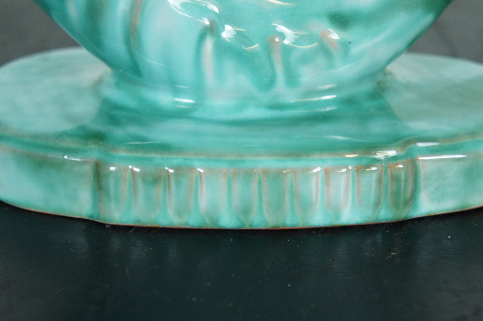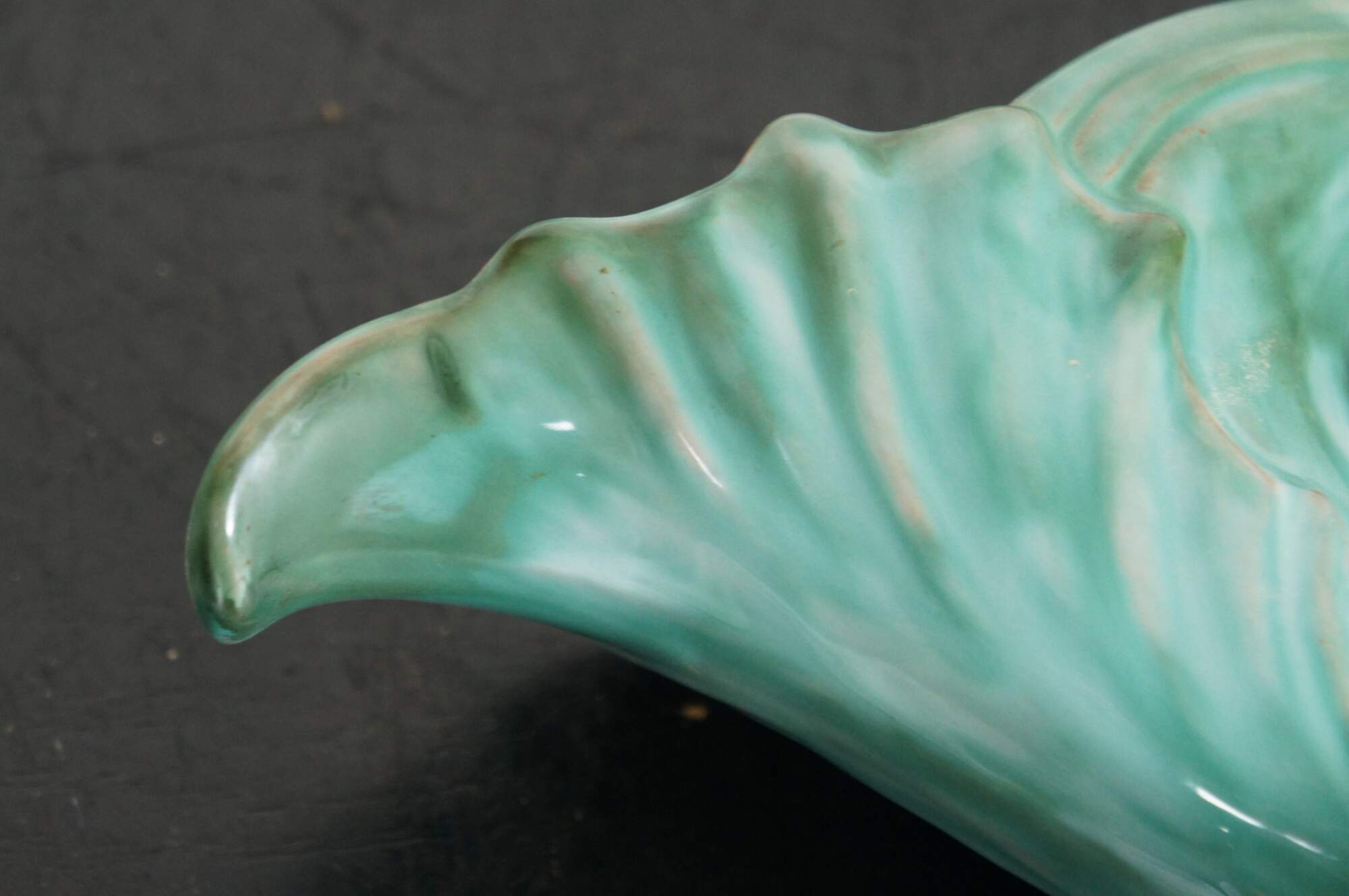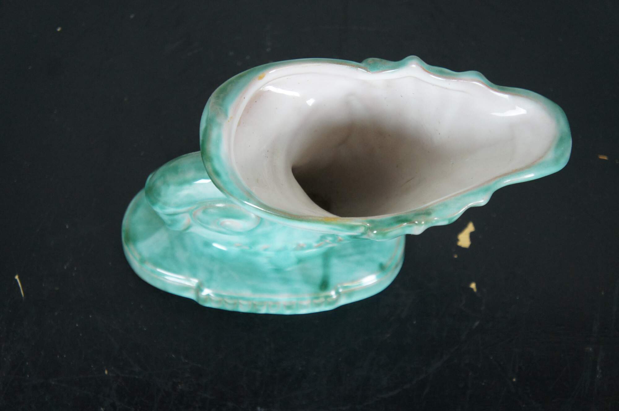 Circa mid 20th century Stangl pottery vase number 2056, in the shape of a cornucopia wrapped in a leaf with a scrolled tail like a nautilus shell, mounted on an oval art deco base. finished in a glossy turquoise white and brown glaze.