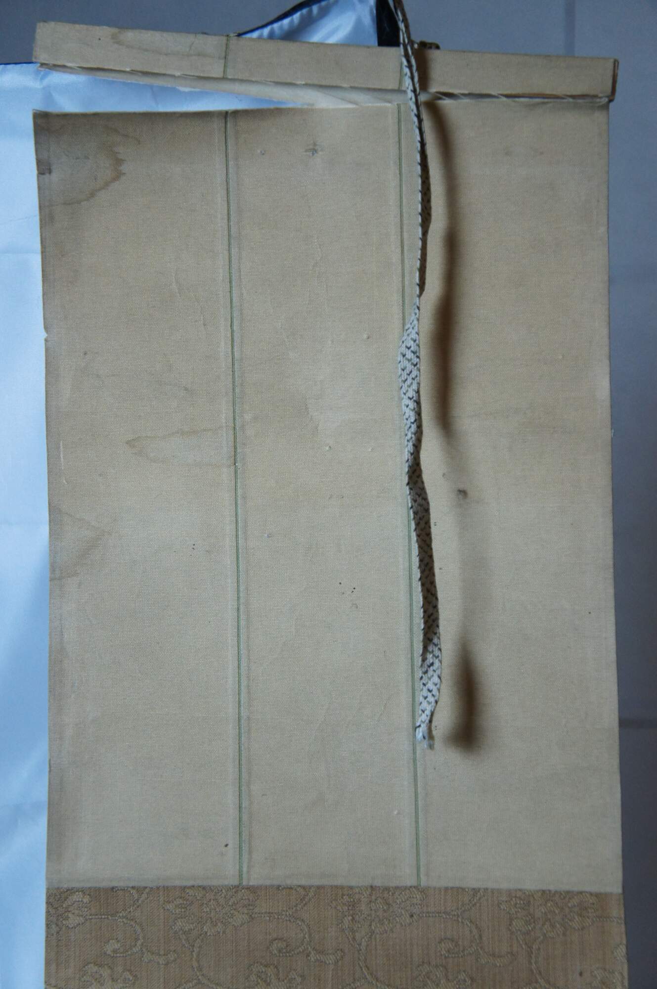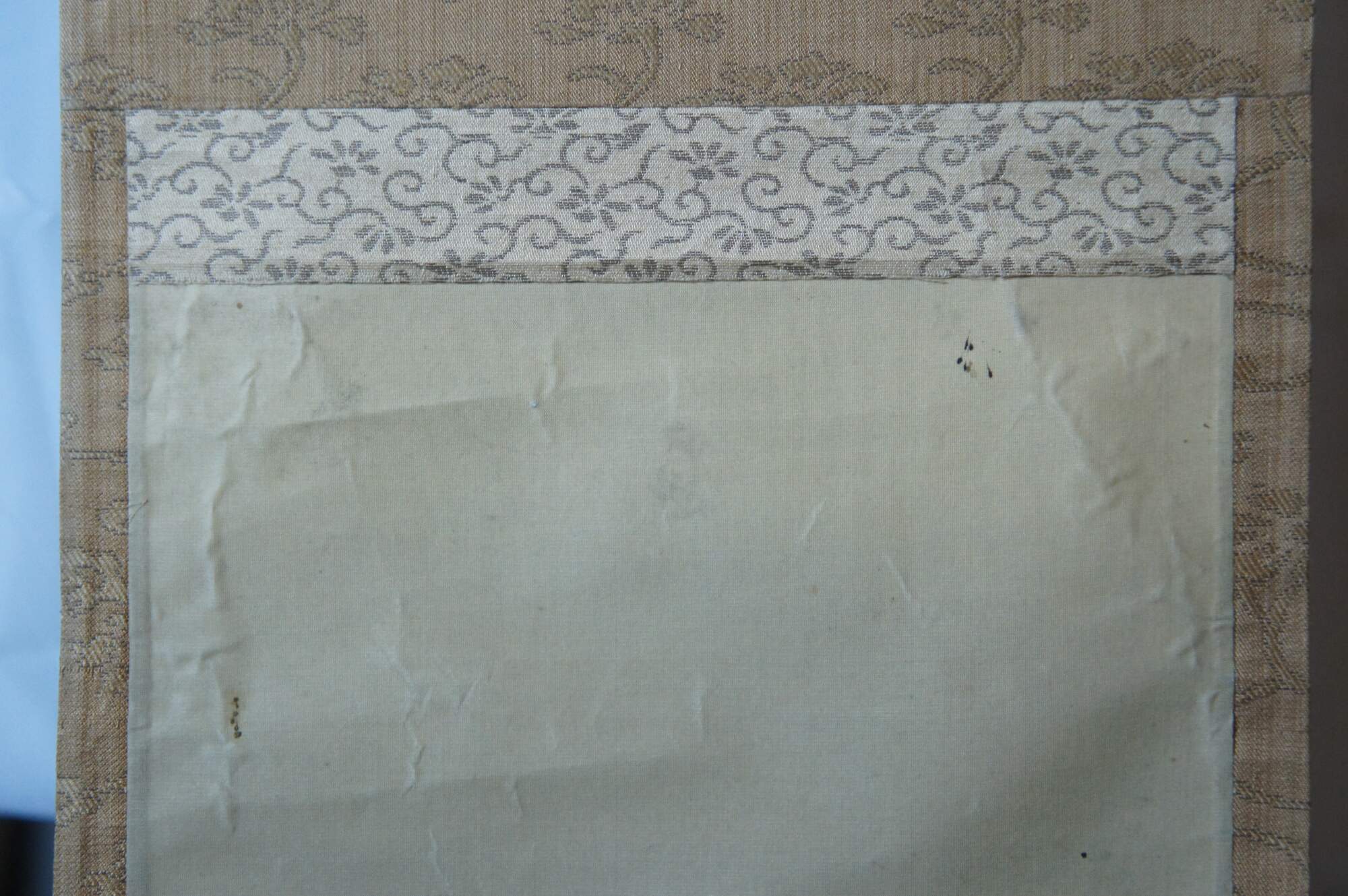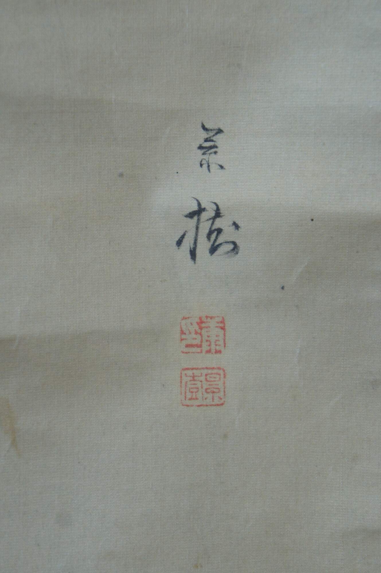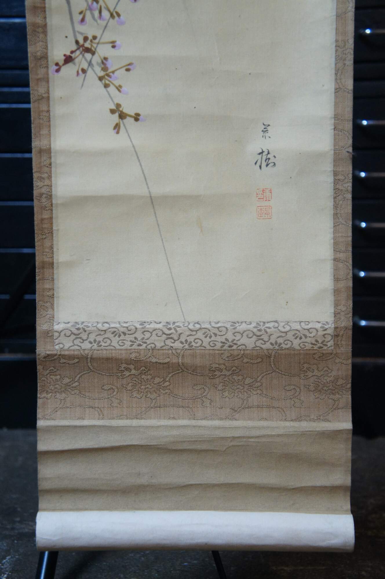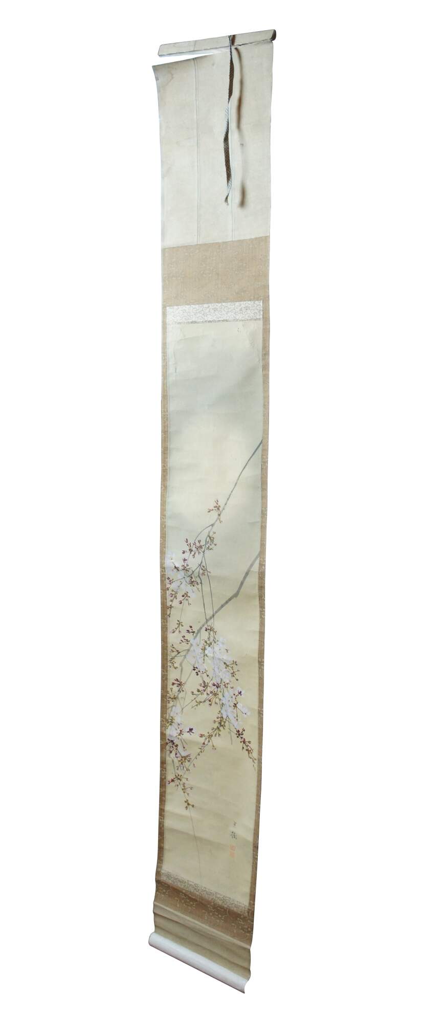 Early 20th century Japanese watercolor painting on silk, wall hanging scroll, showing branches of cherry blossoms. Signed lower right.