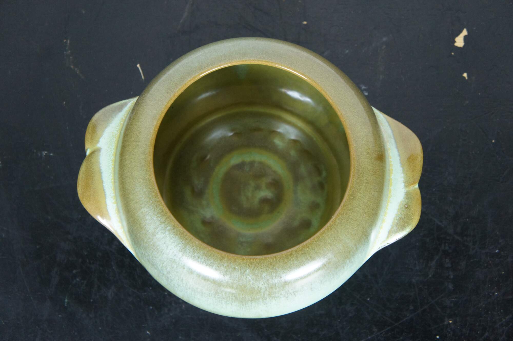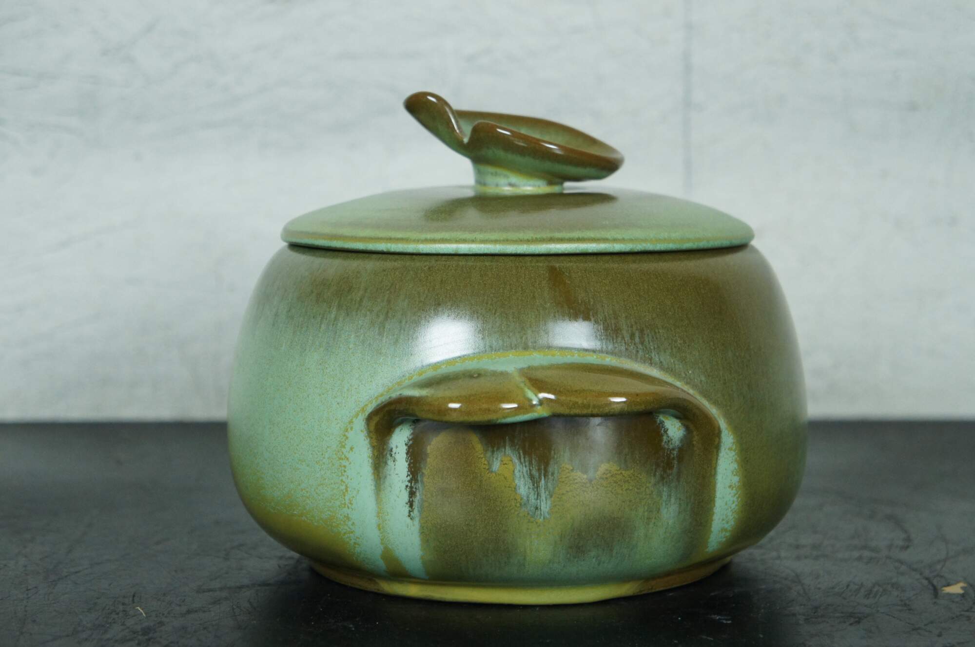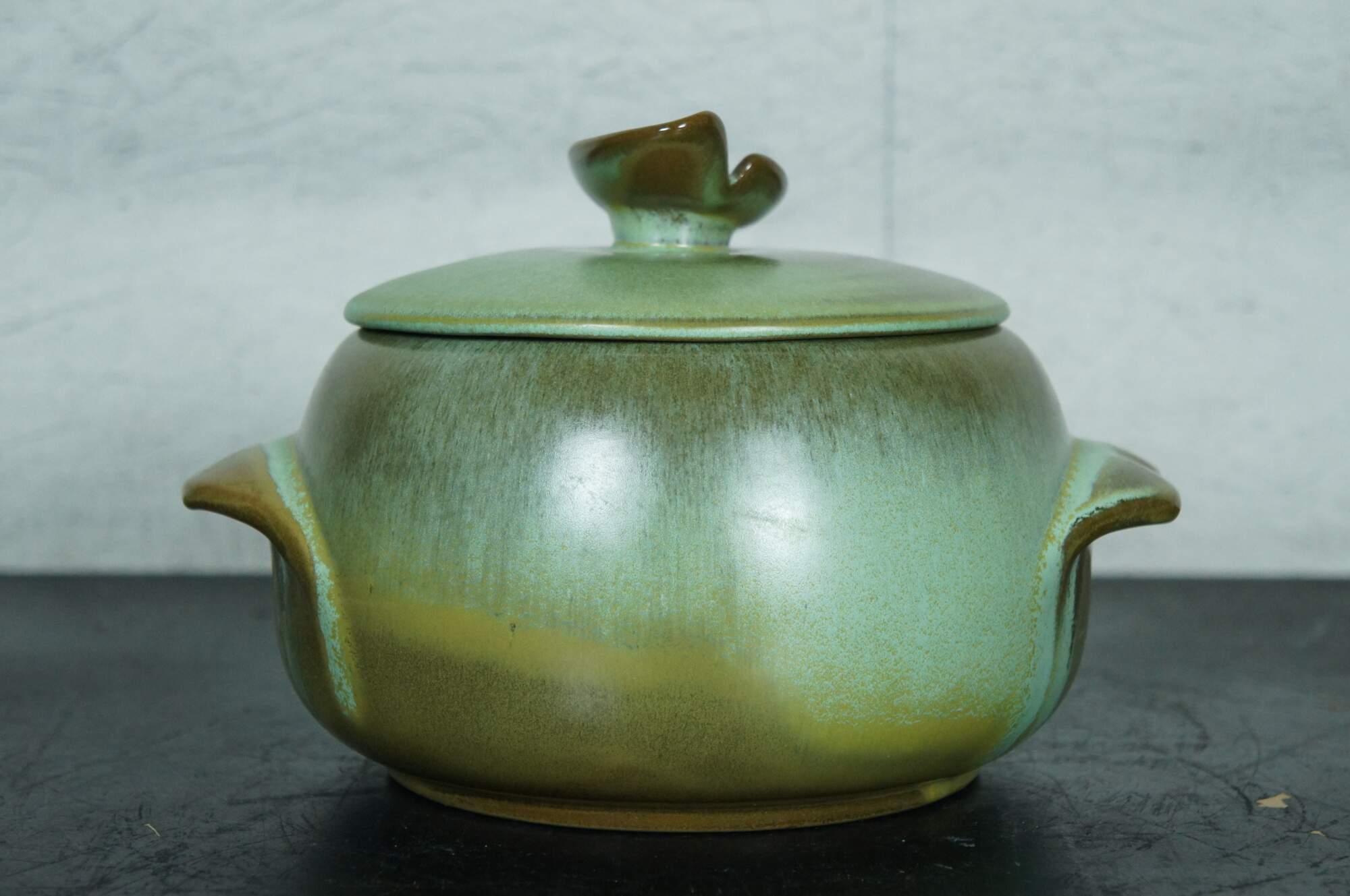 Vintage Frankoma Plainsman small lidded casserole dish number 4V in two-toned Prairie Green. Round form with lily pad shaped handles and finial on lid.