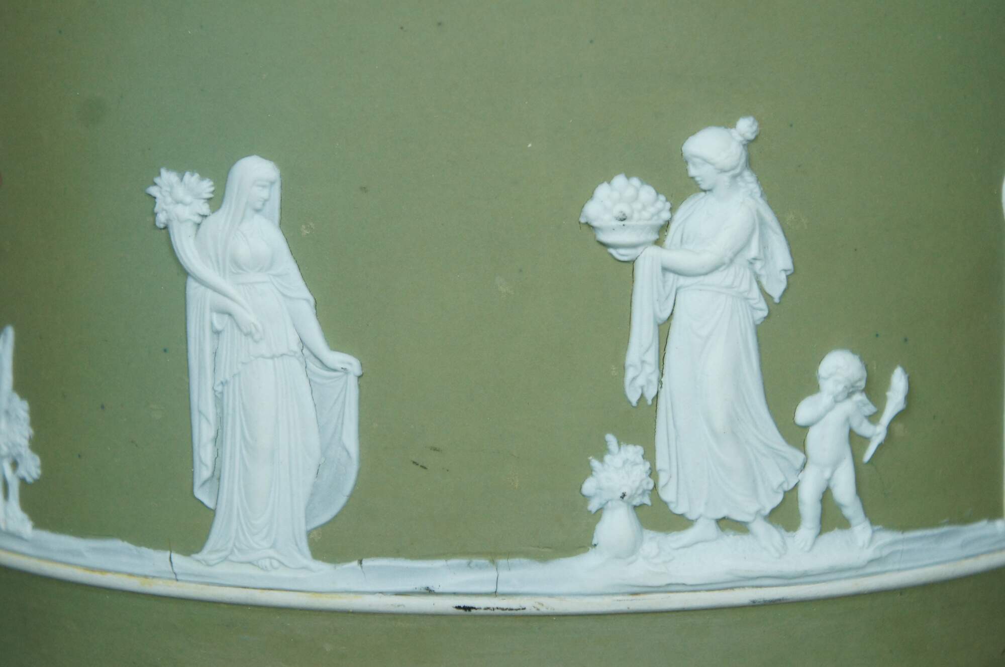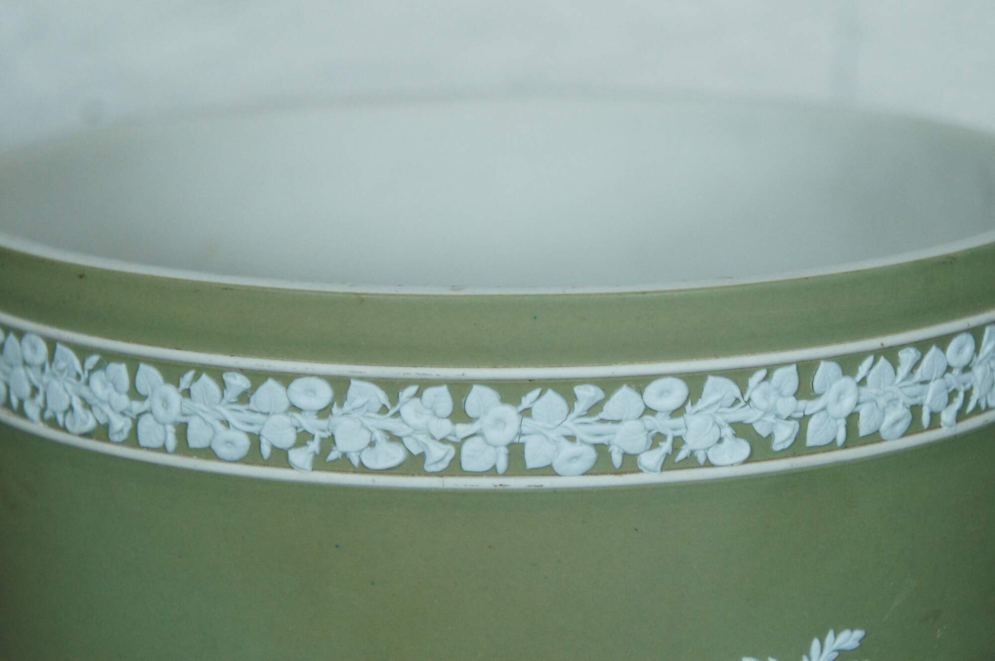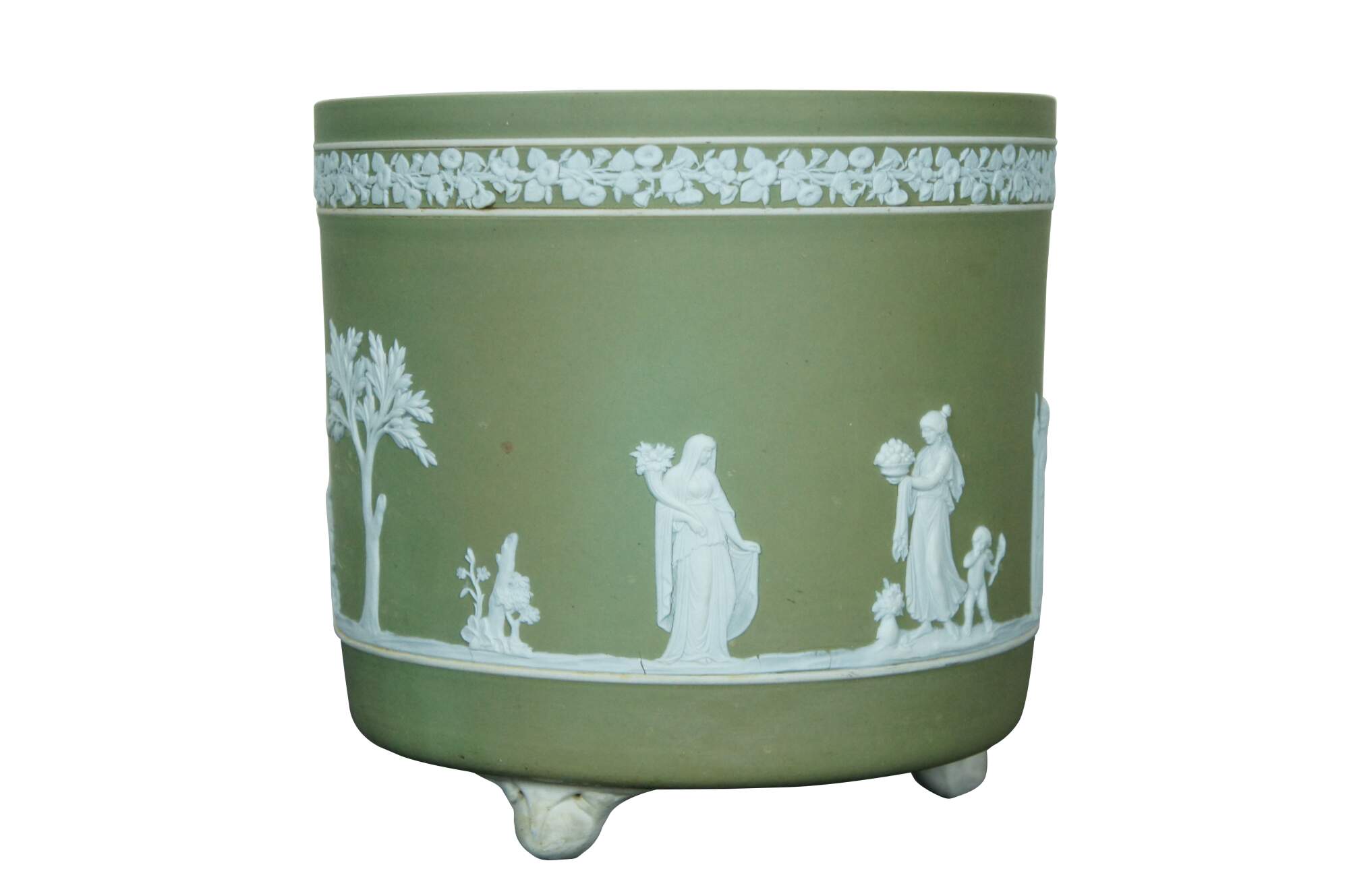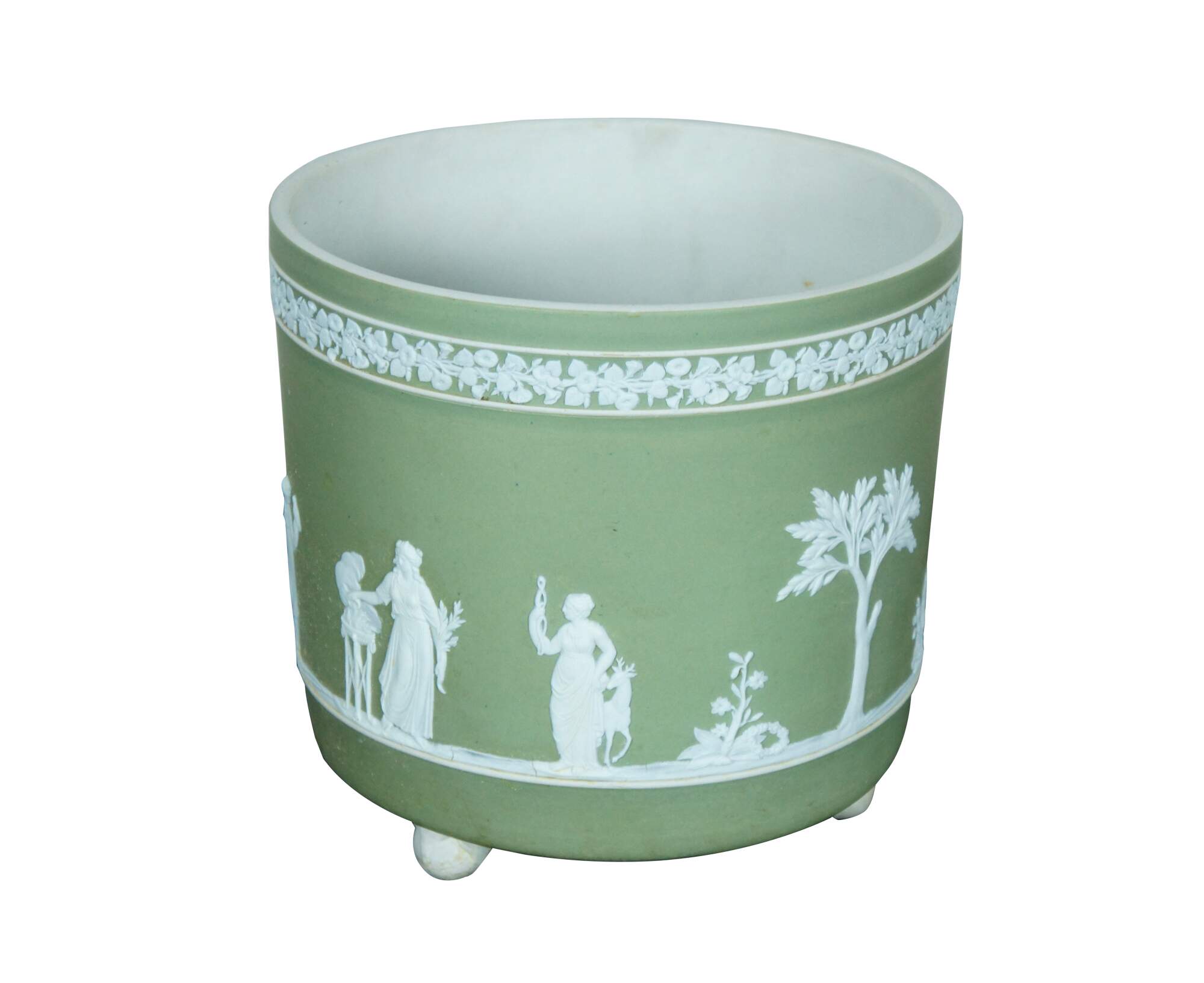 Rare antique Wedgwood England jasperware planter / cachpot / jardiniere. White on green jasperware featuring Wedgwood's traditional neoclassical array of figures and trees below a band morning glories. Cylindrical form with ball feet. Marked 1/1 on base.