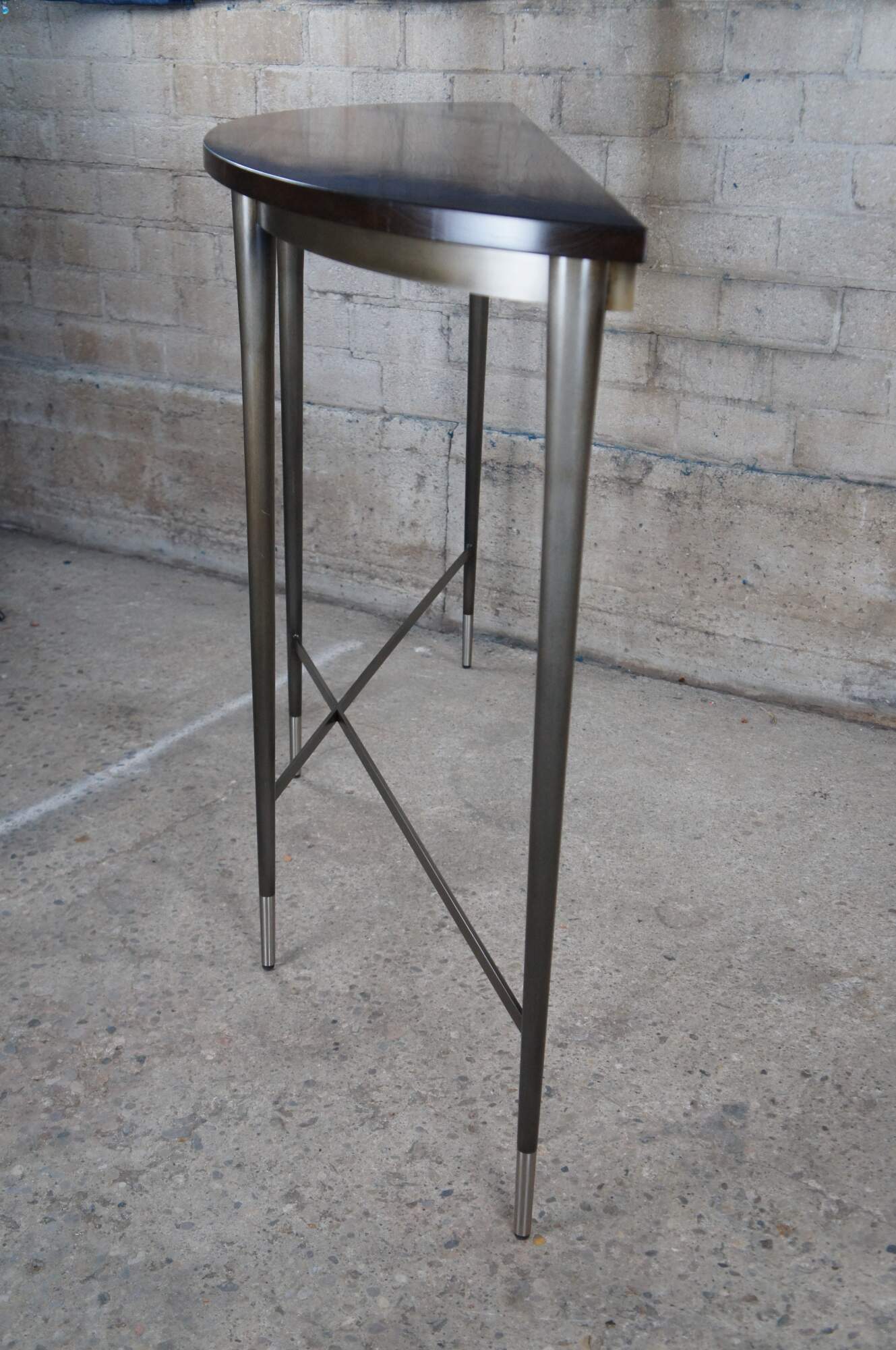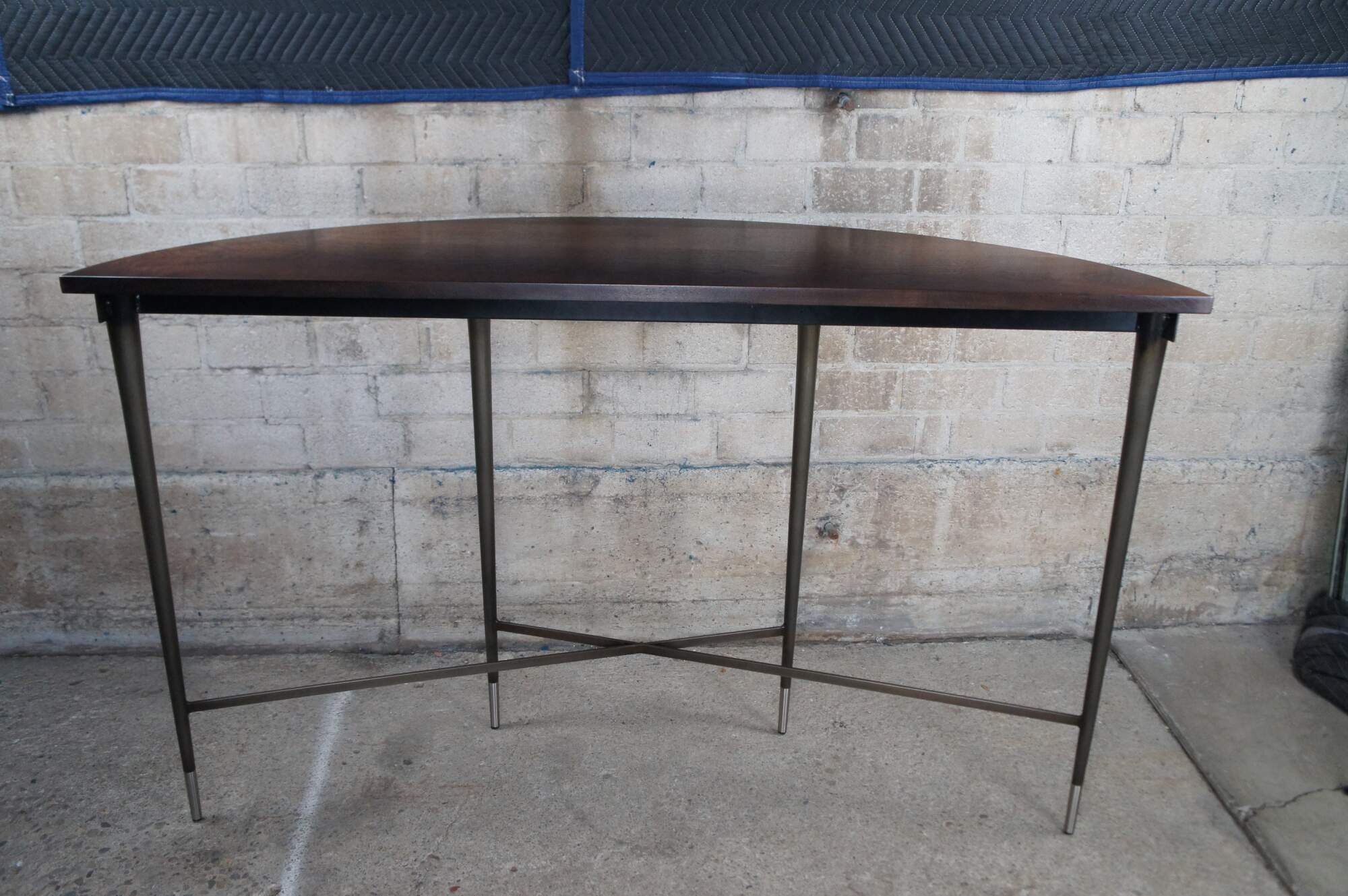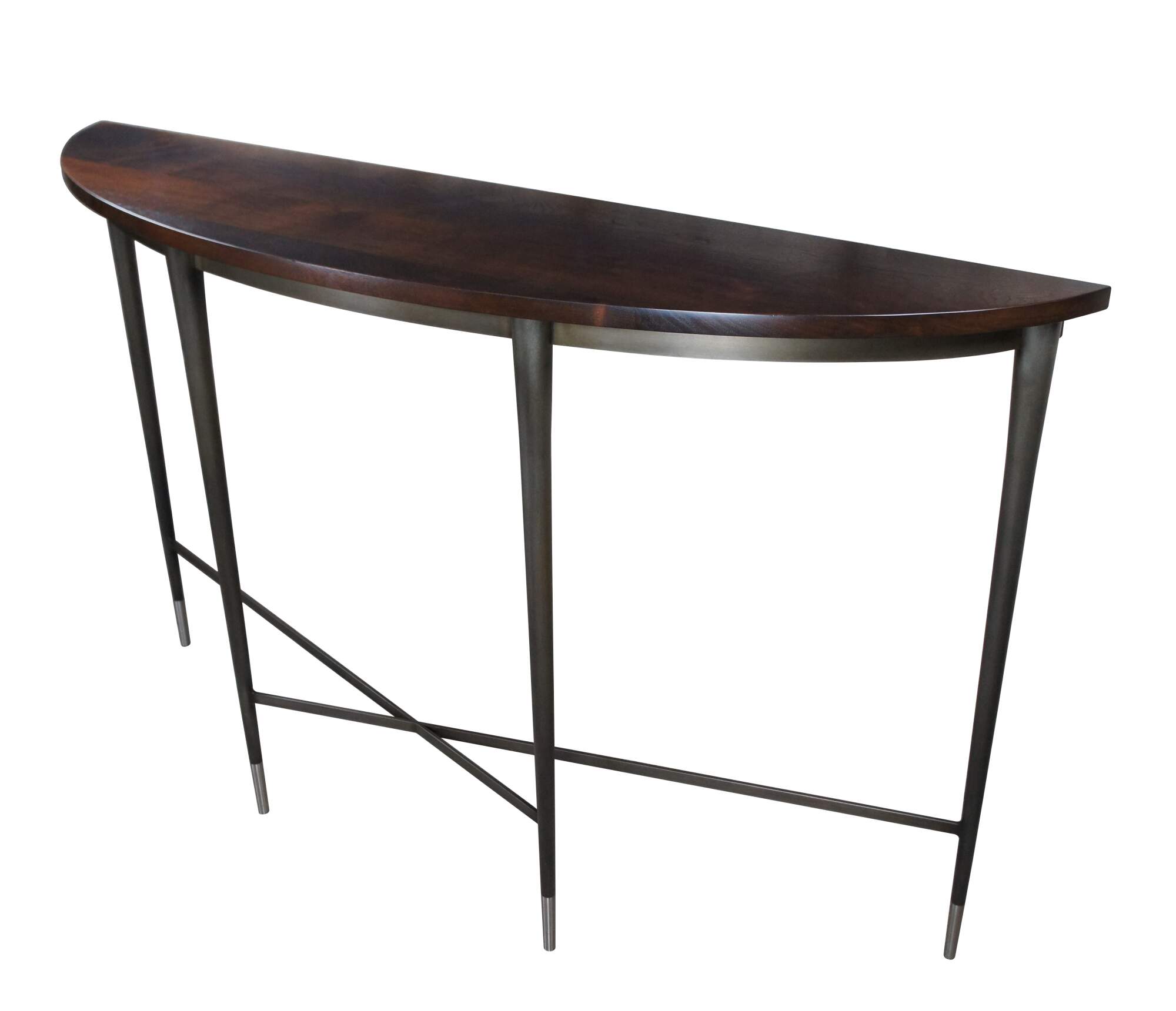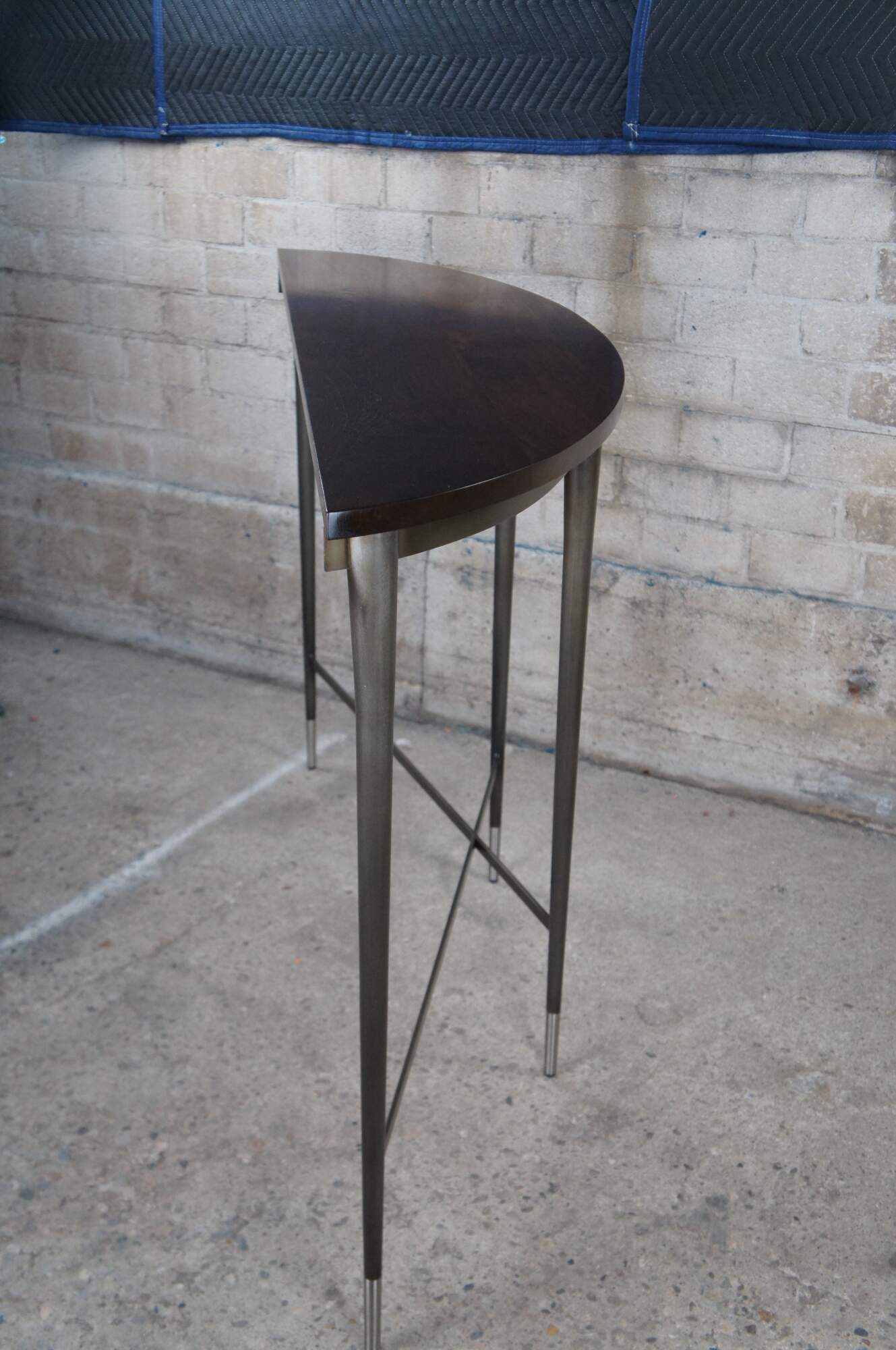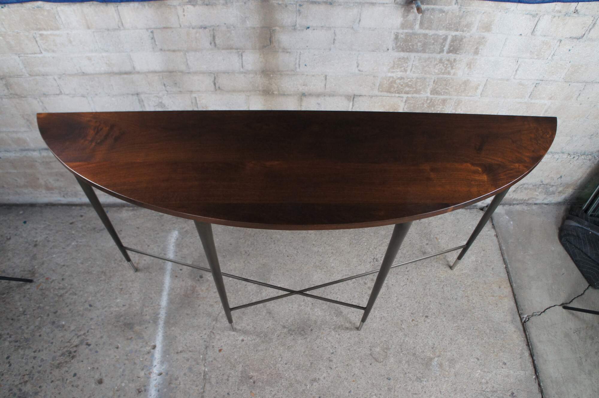 Vintage Harris Rubin McGavin console / hall / entry / side table or sideboard. Made of walnut featuring modern demilune / bowfront form with tall tapered steel base and x stretcher. MSRP $4740.