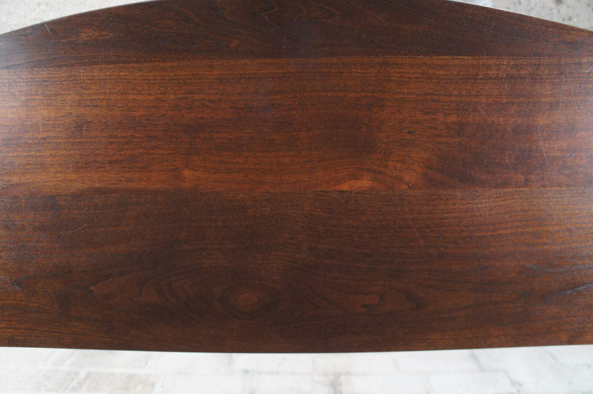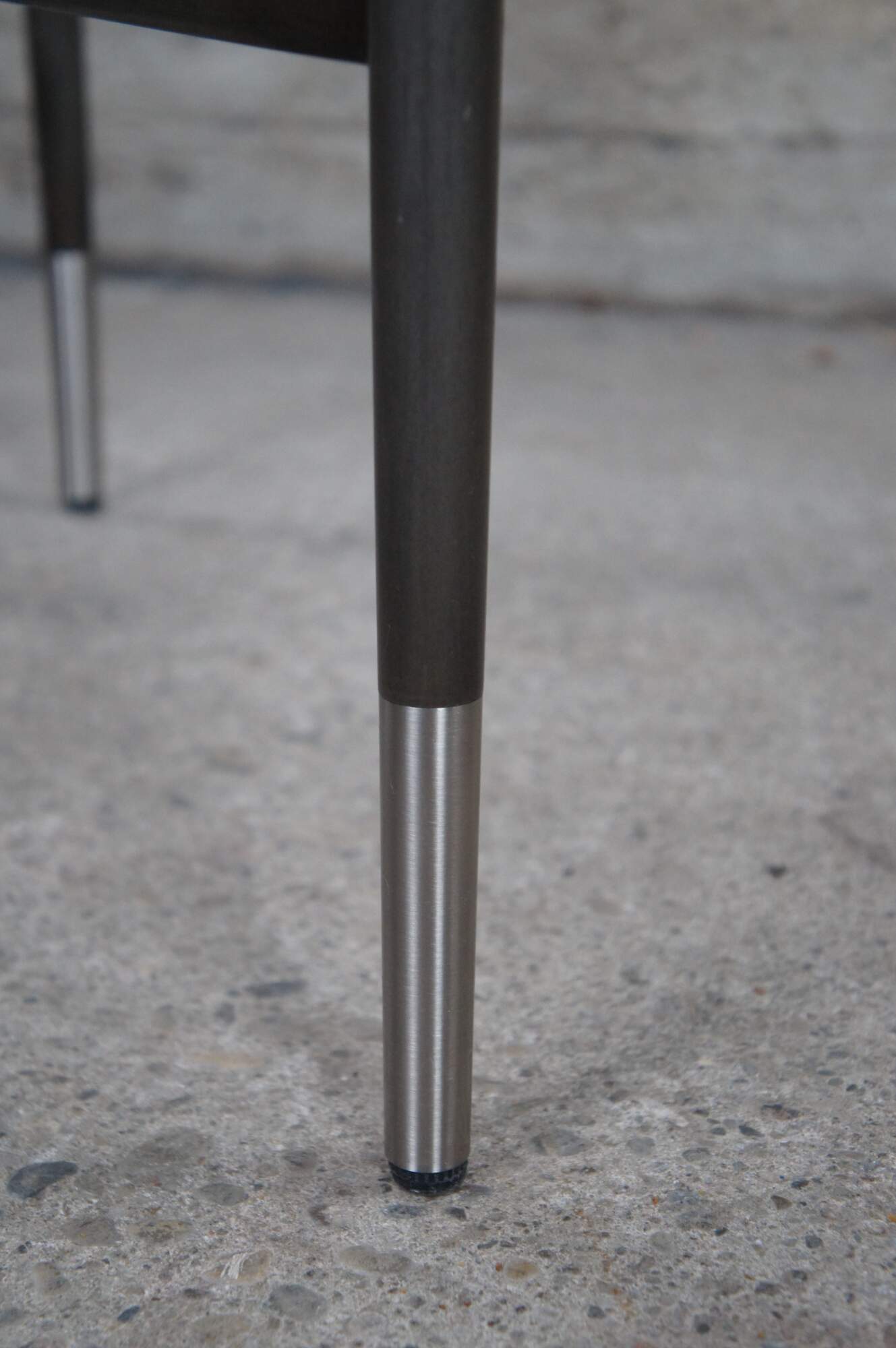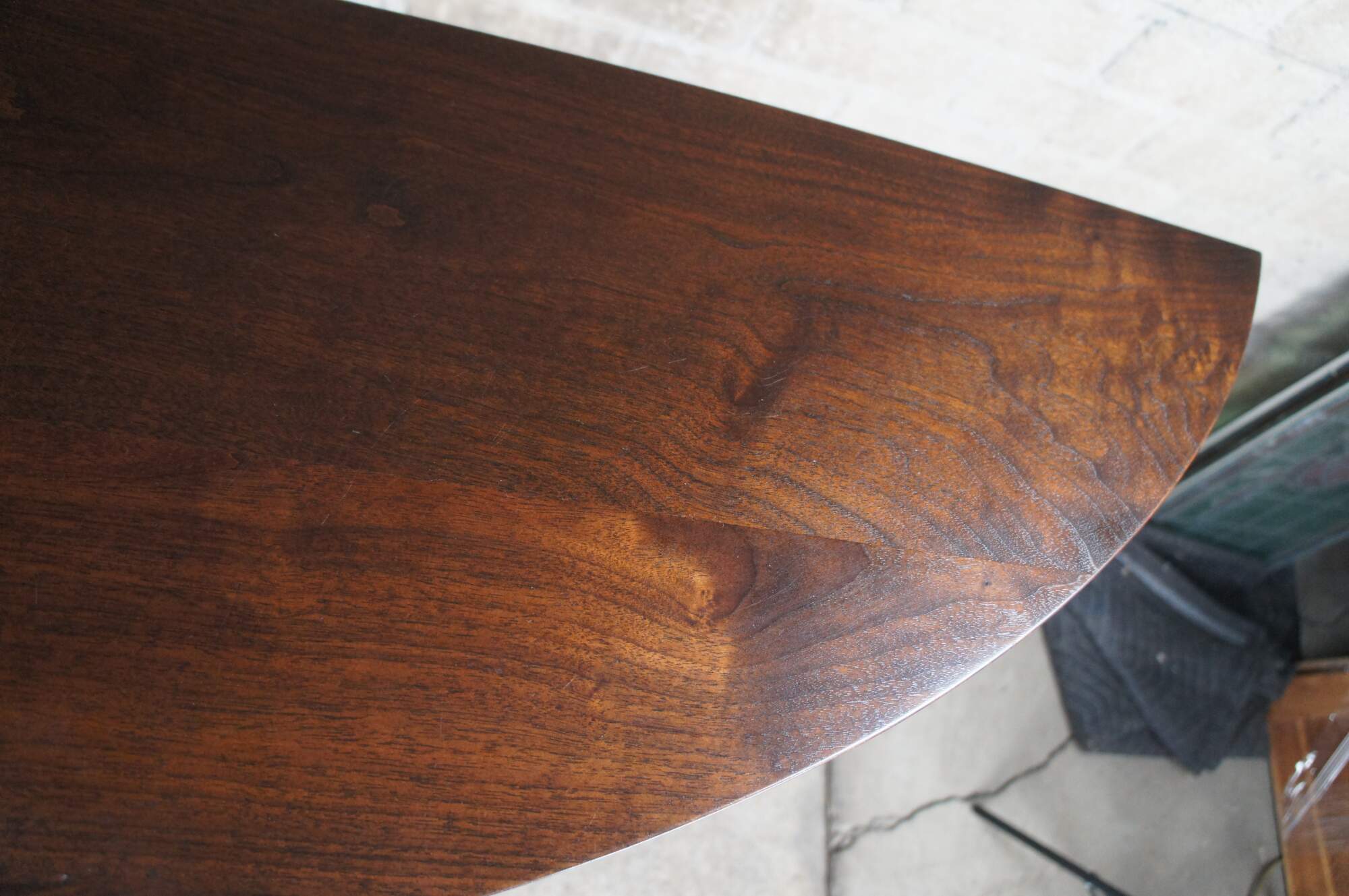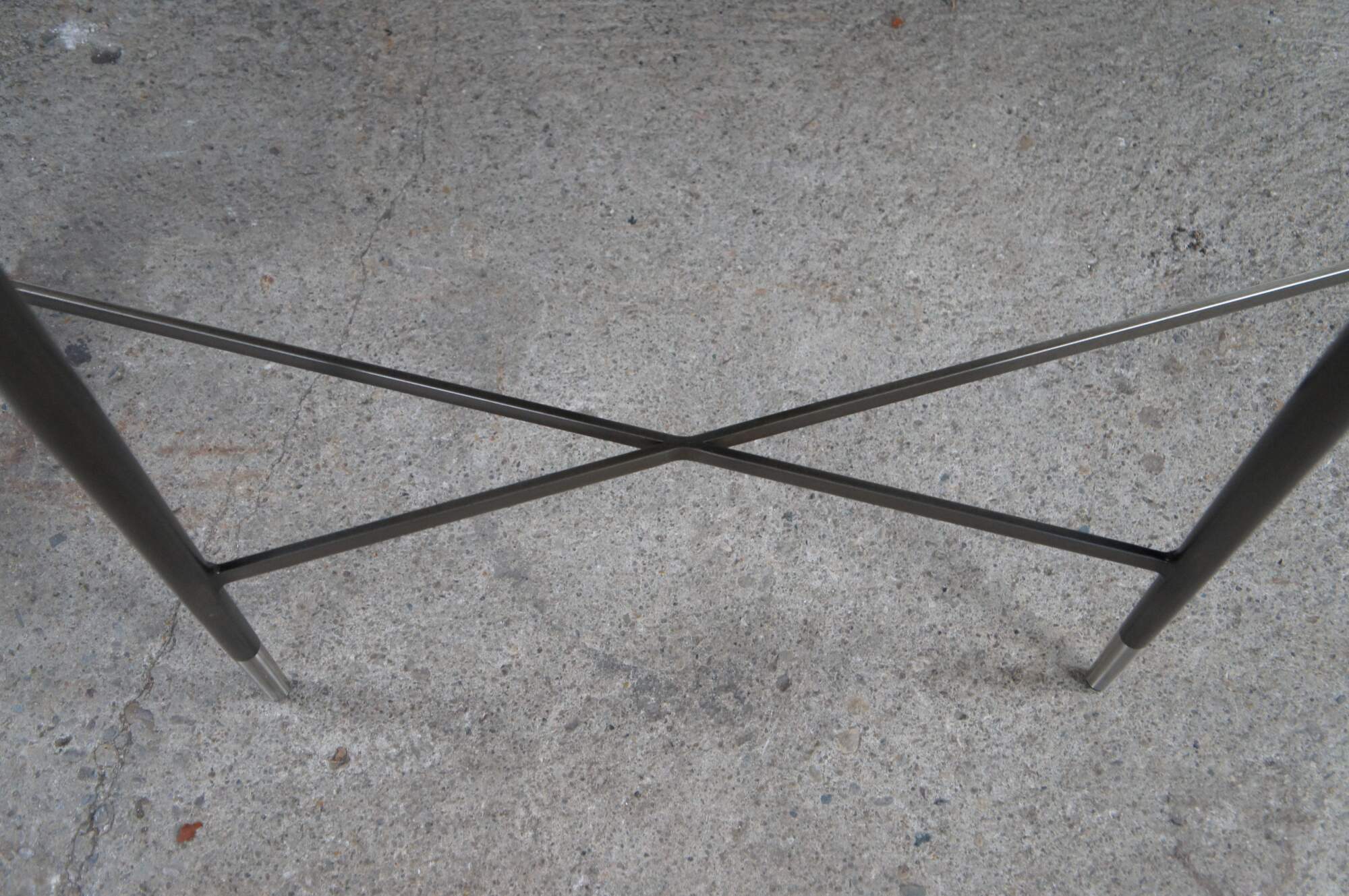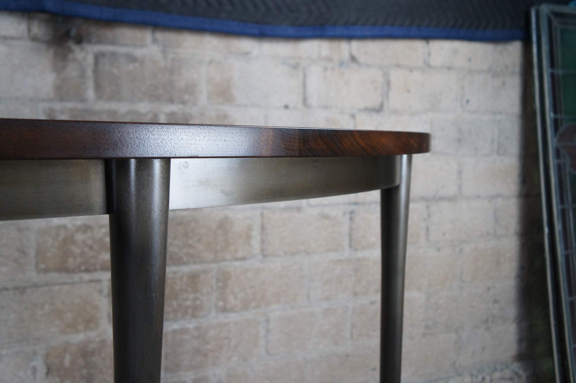 Vintage Harris Rubin McGavin console / hall / entry / side table or sideboard. Made of walnut featuring modern demilune / bowfront form with tall tapered steel base and x stretcher. MSRP $4740.