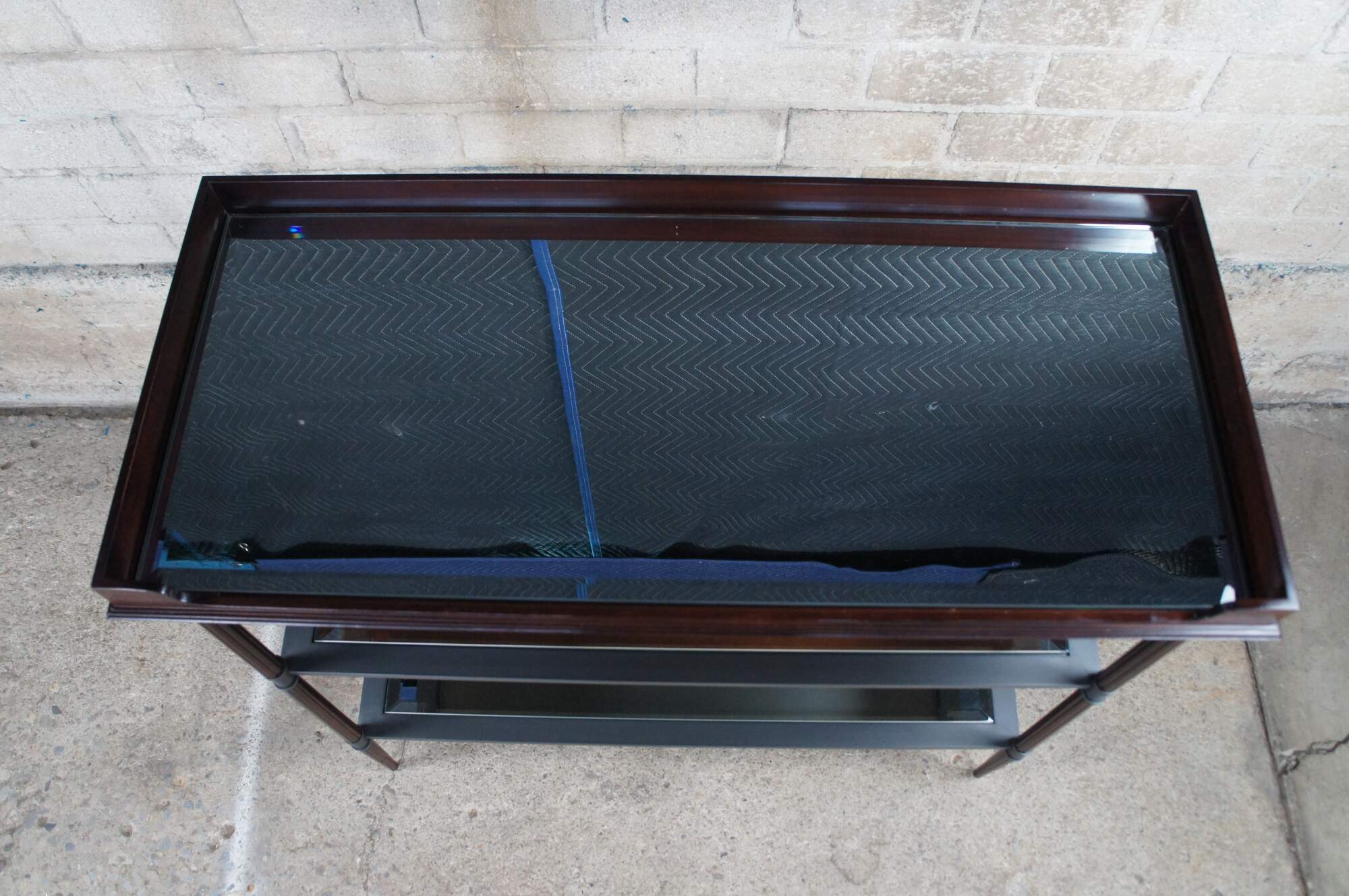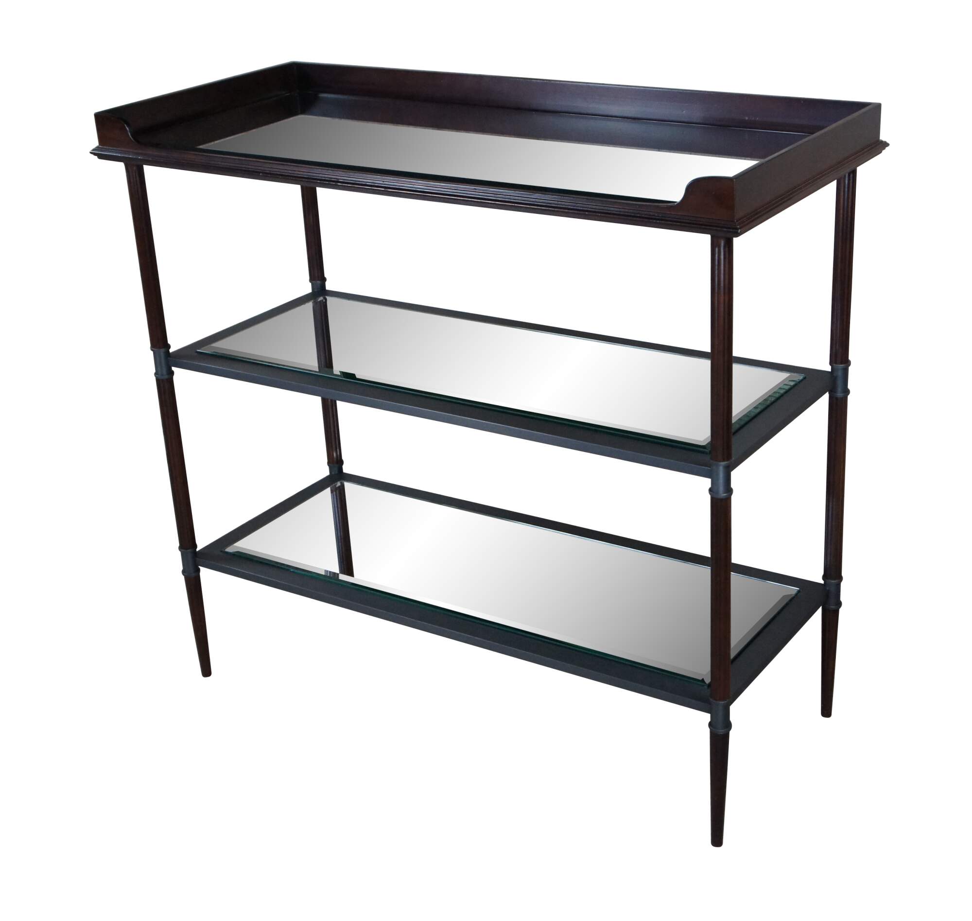 Vintage Baker Furniture Garcia Collection drybar / etagere / side entry table / console / or sideboard. Made of mahogany with a three tiered design that features an upper mirrored shelf with gallery over two additional beveled glass shelves.