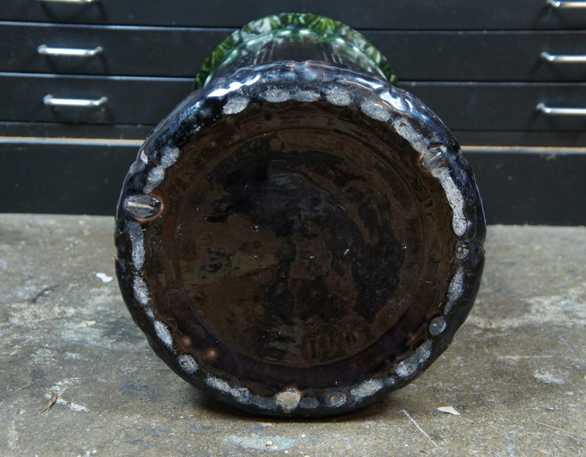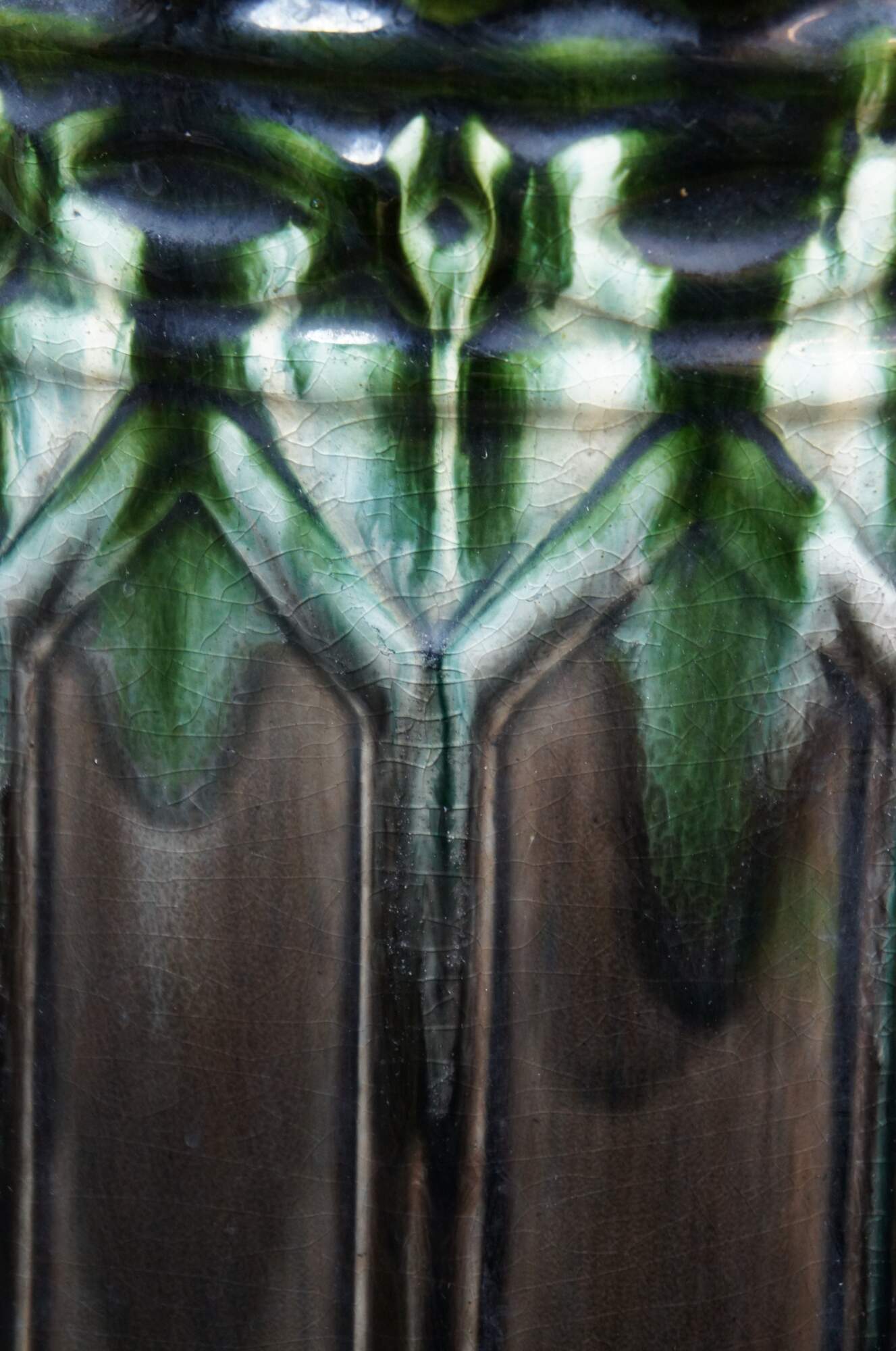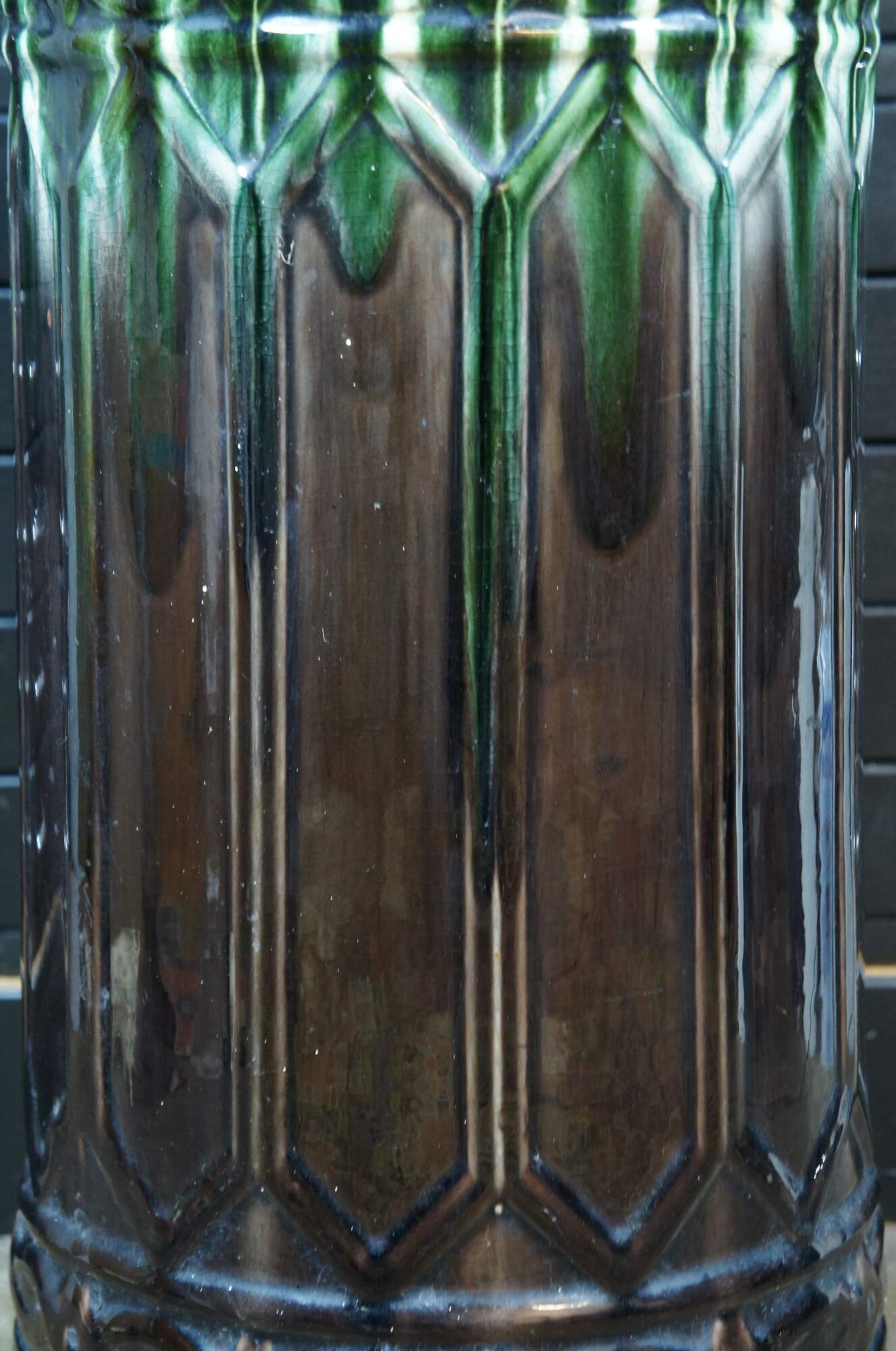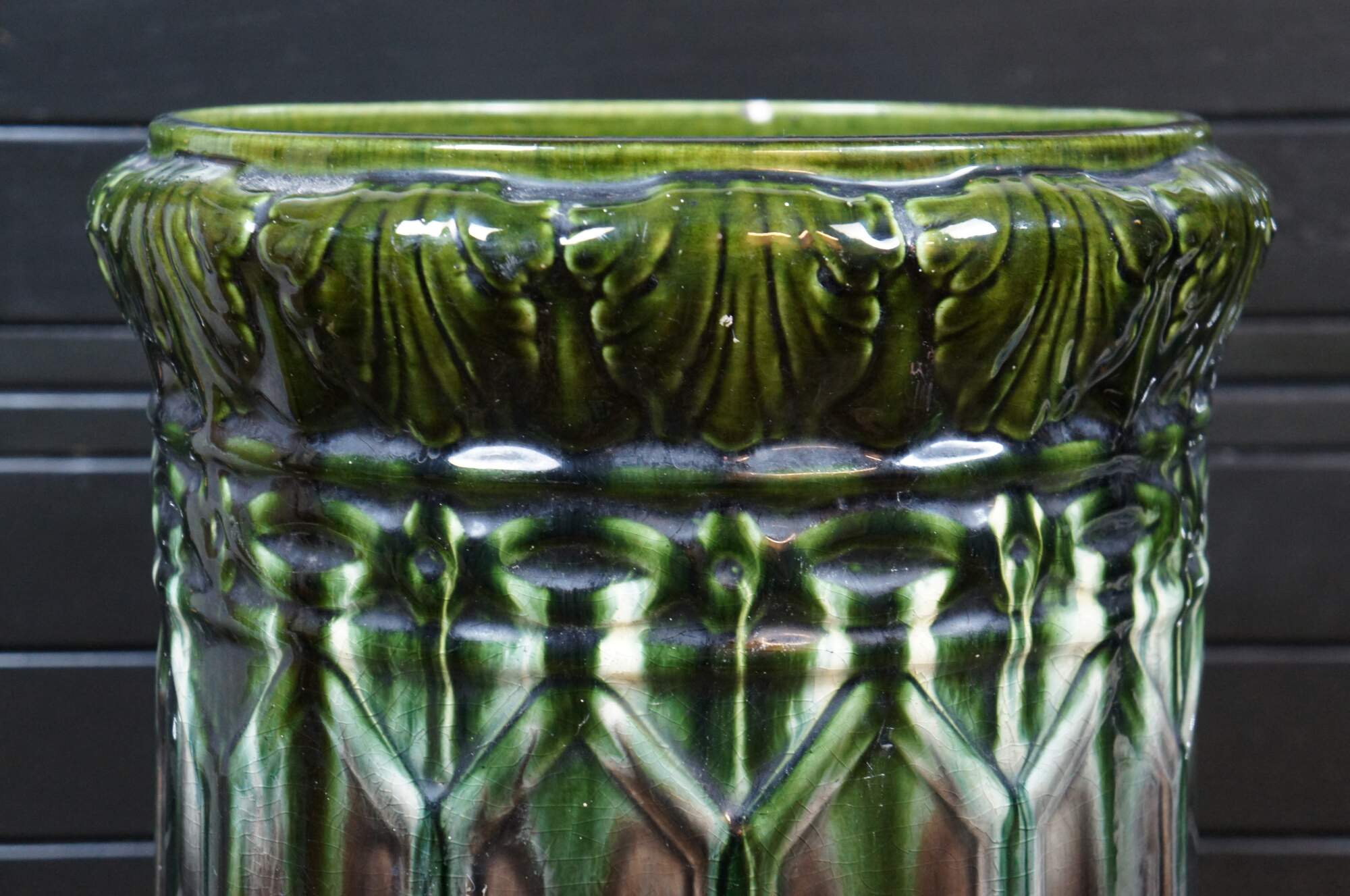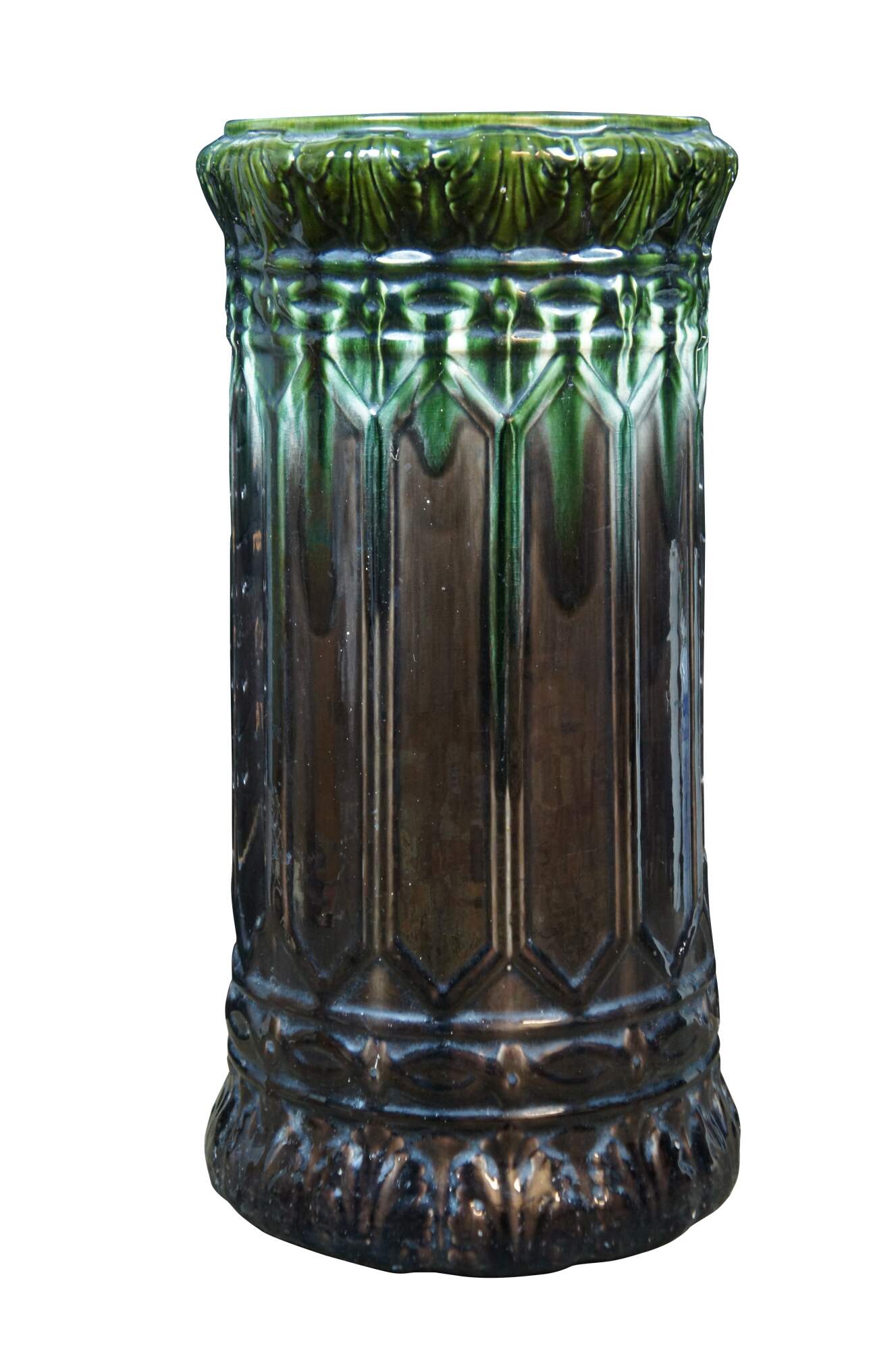 Early 20th century antique Victorian / Edwardian circa 1915 Brush McCoy blended majolica pottery umbrella stand with a green and brown drip glaze. Cylindrical form with wider top and base, molded with a beautiful art neuveau design of fan / palm leaf trim and elongated diamond cartouches. Base appears to be incised with the number 198.