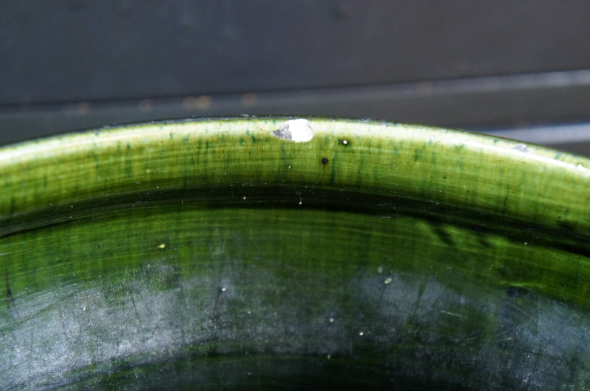 Good Overall - wear and distressing from age and use, chip on rim, crazing.