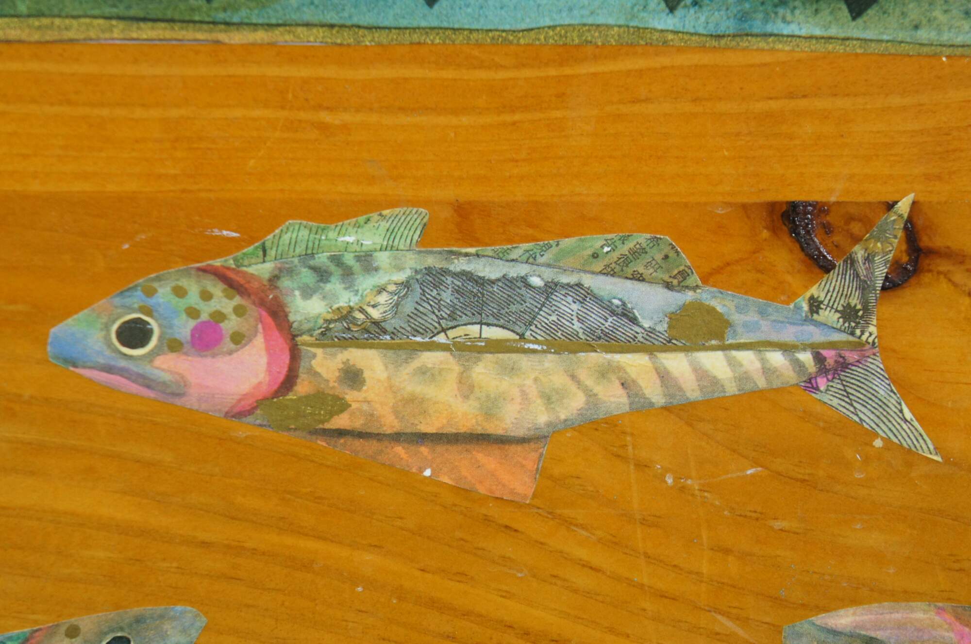 Late 20th century pine wood folk art waste basket / trash can. Rectangular form with tapered base, decoupaged with a quirky multicolor chevron border and a number of fish / trout, including one at the bottom of the interior. Farmhouse, country lodge, log cabin, hunting / fishing, lake house, nautical.
